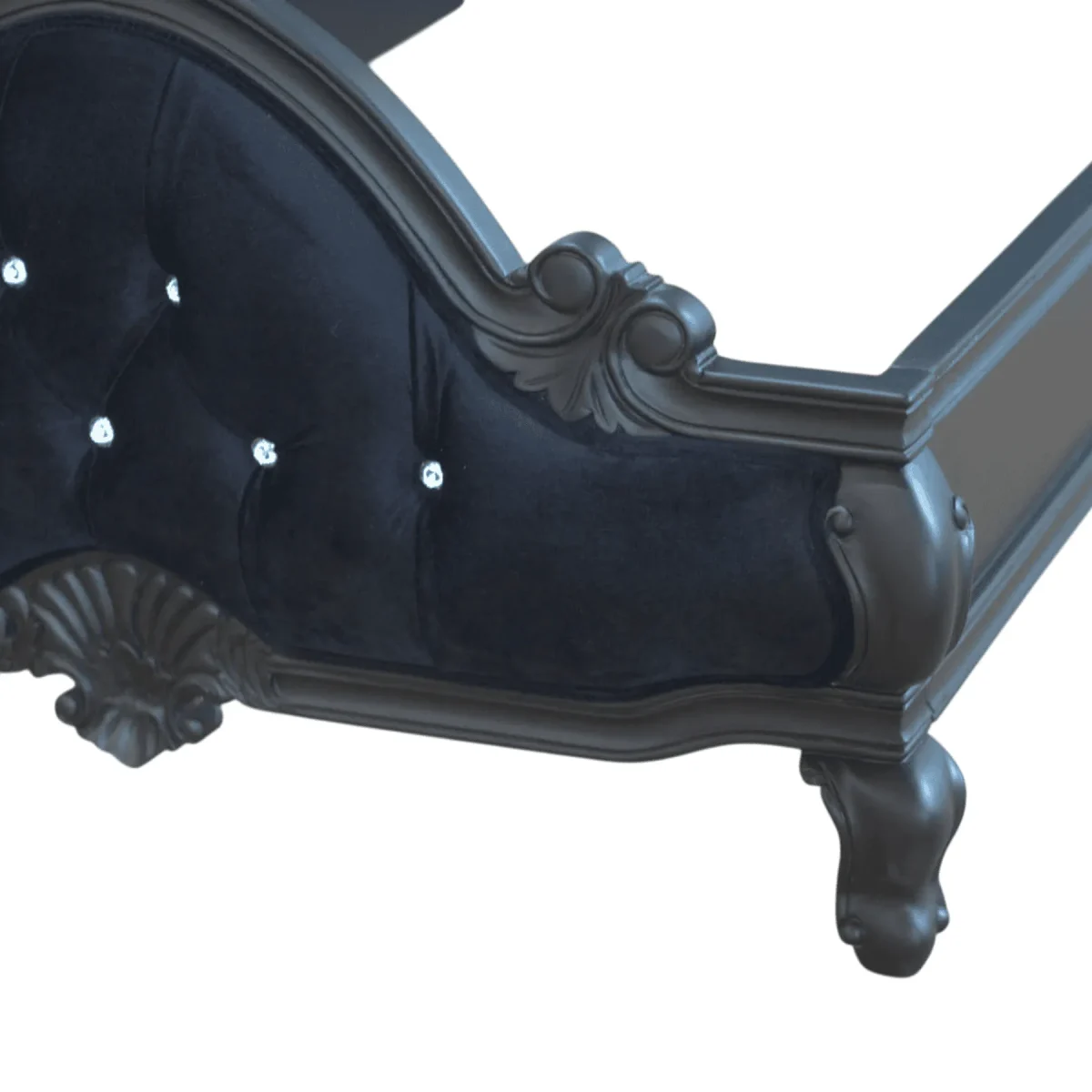 Primary Frame: Grade B Mahogany | Joinery: Traditional Mortise and Tenon | Finish: Matte Black Lacquer | Upholster & Cushion: Black Velvet with Chrome Stud Detailing