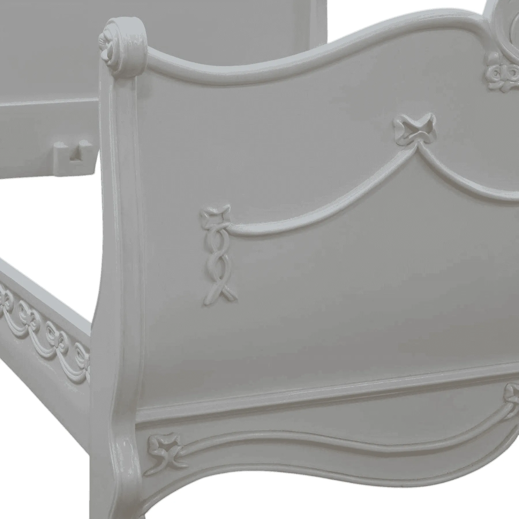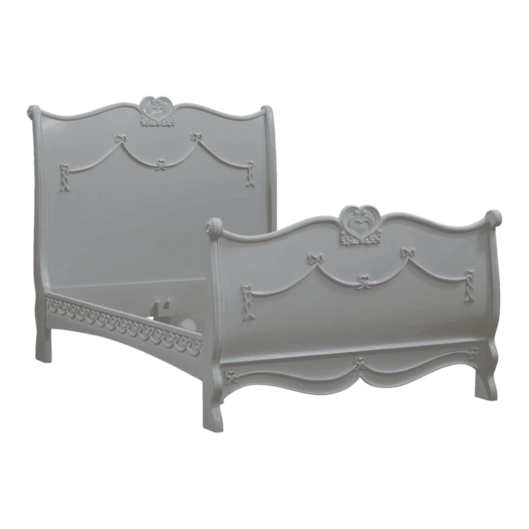 This bed draws inspiration from classic French provincial furniture, reinterpreting the sleigh bed form with whimsical, romantic carvings It’s designed to be a focal point in a child’s or guest bedroom