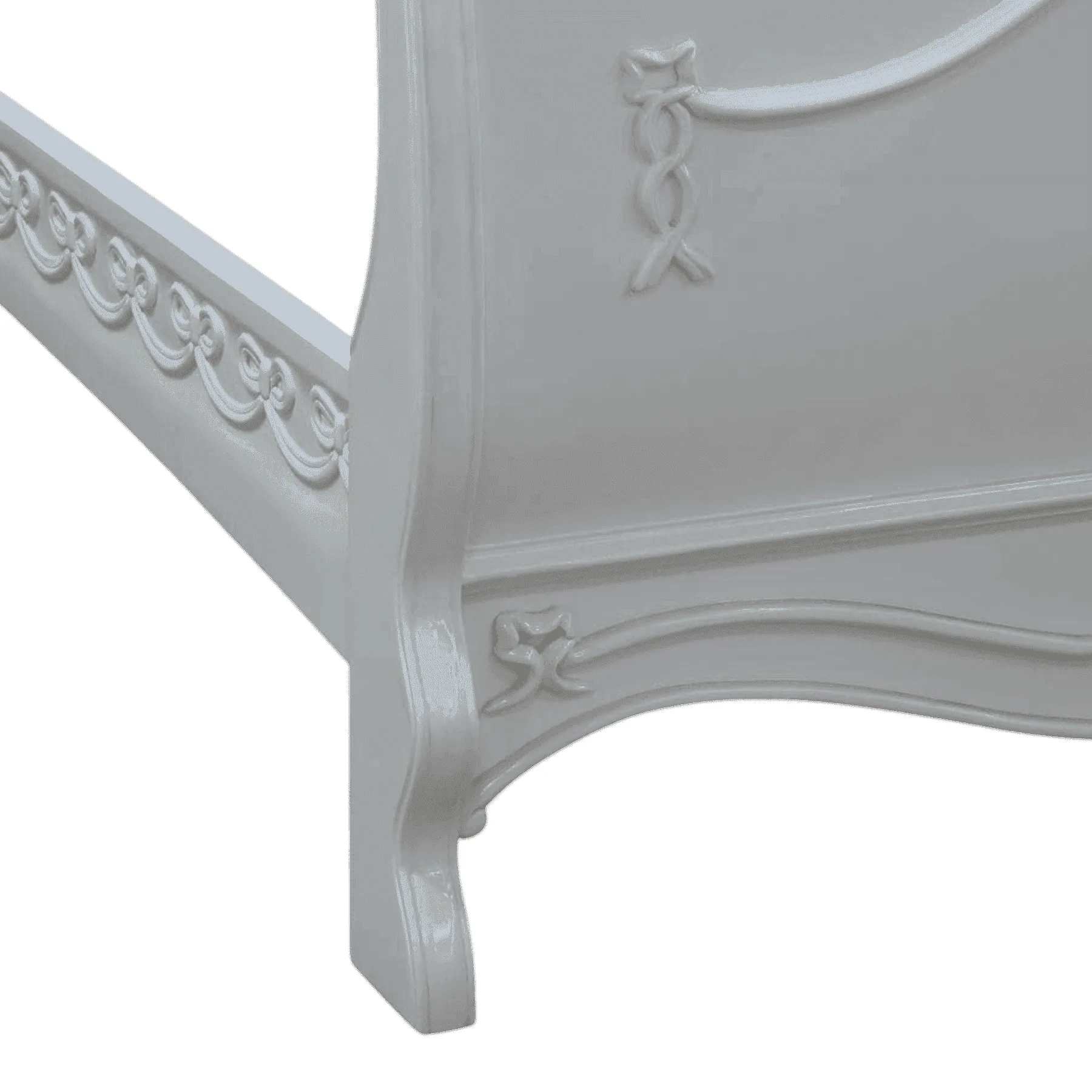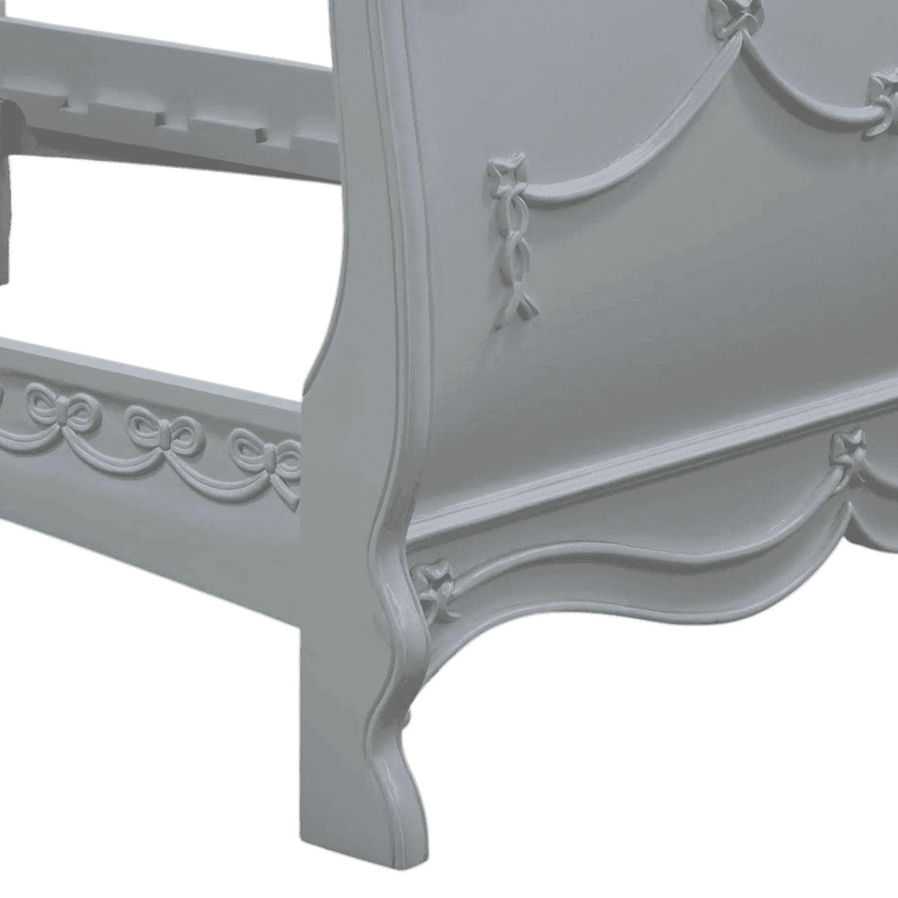 Bring storybook charm to a bedroom with this French-inspired sleigh bed Finished in a soft grey, it features romantic details like heart-shaped carvings and delicate swag appliques Its classic curved headboard and footboard create a timeless and enchanting centerpiece
