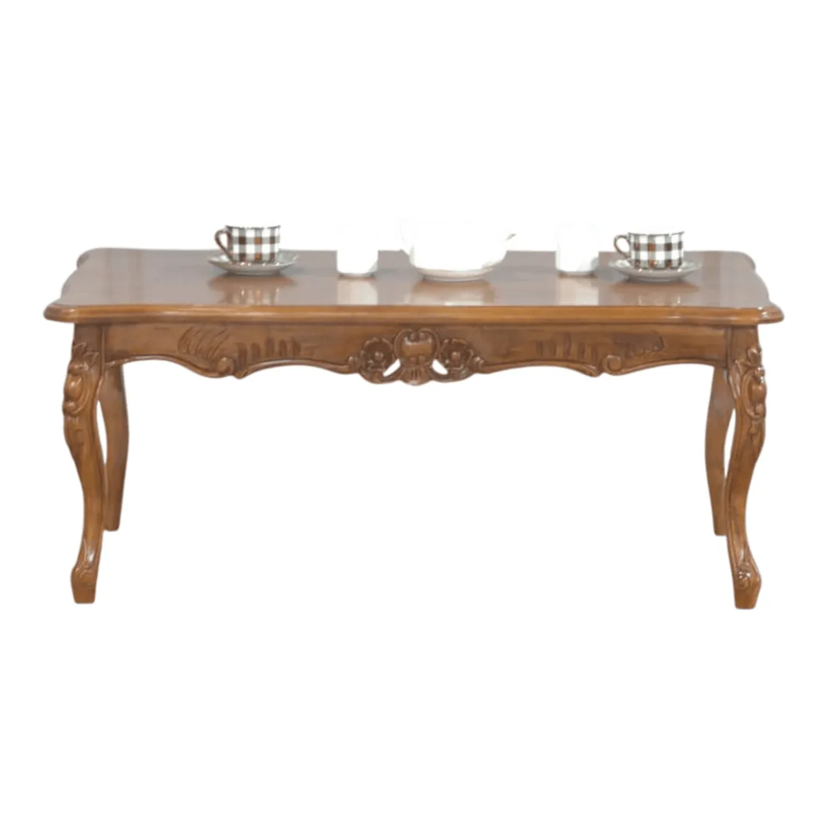 Bring the warmth of natural wood into the heart of your home with this expansive coffee table that celebrates the raw beauty of premium timber and expert joinery The rectangular surface provides ample space for hosting large gatherings displaying art books or simply enjoying a quiet morning with tea and family The deeply carved floral details along the edges demonstrate a level of artisanal skill that elevates this piece from furniture to functional art Each leg is shaped with a gentle taper and ornate scrollwork providing a sturdy base that feels both substantial and elegant The natural grain of the wood is allowed to shine through the finish creating a tactile experience that connects you to the forest and the earth This table is designed to be an heirloom passed down through generations as a silent witness to your family’s most precious memories and milestones