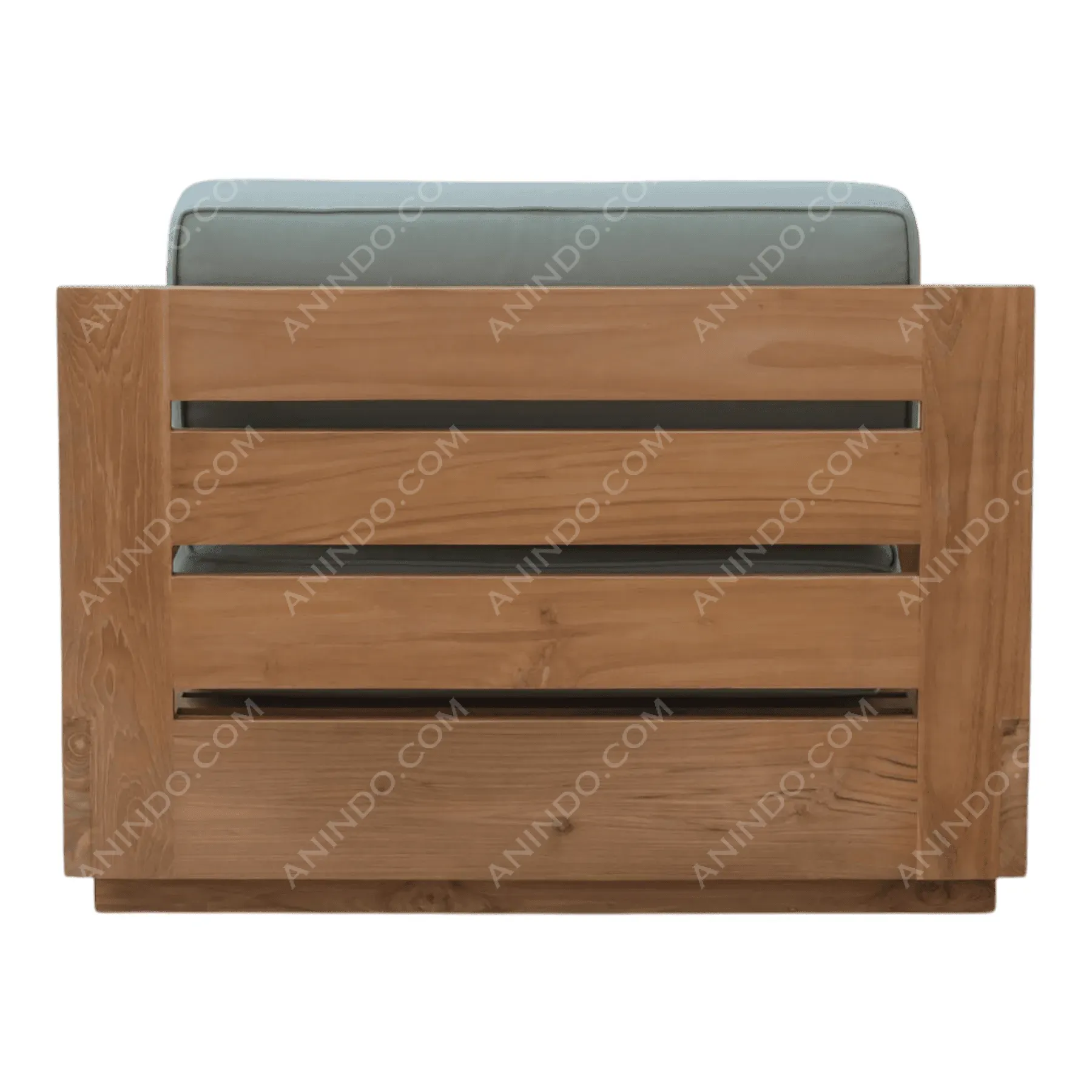 This armchair is a statement of pure, modern minimalism Its low-profile, blocky design is crafted from solid, panel-style teak, creating a substantial, grounded aesthetic Thick, boxy cushions with elegant welted edges are upholstered in a serene, light grey-blue fabric, offering a soft contrast to the warm wood This piece is perfect for a contemporary living room or a high-end patio, prioritizing form and comfort