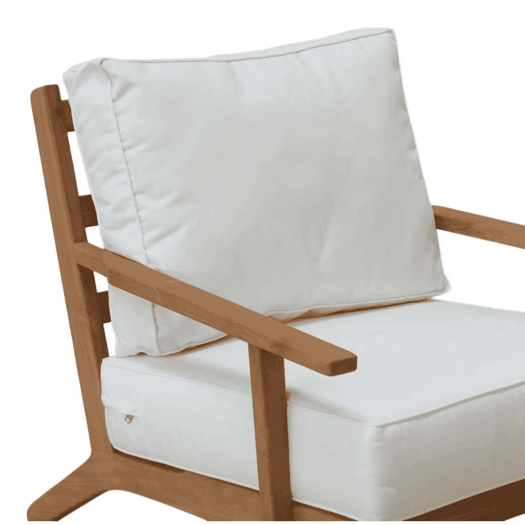 Settle into ultimate relaxation with this deep-seat armchair Its clean, modern frame is crafted from solid teak, showcasing a beautiful natural grain that’s perfect for outdoor living Plush, oversized cushions wrapped in a crisp white fabric invite you to sink in and unwind This chair combines minimalist design with resort-style comfort, creating a serene and stylish retreat for your patio, deck, or sunroom