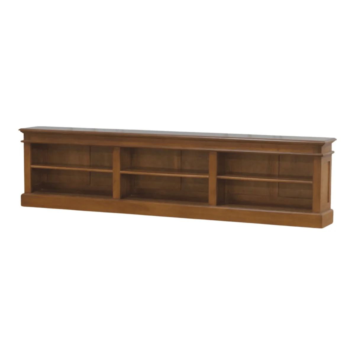 Achieve a look of understated library elegance with this low-profile bookshelf that emphasizes horizontal lines and open accessibility the expansive three-section design provides ample room for your literary collection media components or decorative objects making it a versatile addition to a study or living room constructed with a substantial plinth base and a clean molded top this piece offers a sense of weight and durability that anchors your wall space without overwhelming the room the warm wood finish and simple paneled sides allow it to integrate effortlessly into both traditional and transitional decor styles its height is perfectly suited for use behind a sofa or as a long media console providing a functional surface for lamps and art while keeping your essentials organized within reach experience the quiet confidence of a piece built for the modern collector