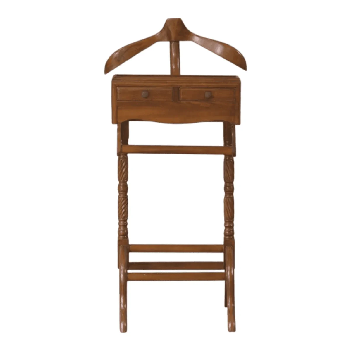 Organize your daily essentials with the grace of a bygone era using this beautifully crafted wooden valet stand Designed for the modern gentleman or lady it features a wide contoured hanger for coats and shirts two delicate drawers for cufflinks or jewelry and a sturdy horizontal bar for trousers The warm honey-toned wood highlights the natural beauty of the grain while the twisted column supports add a touch of architectural interest Its compact footprint makes it an ideal companion for the corner of a bedroom or walk-in closet ensuring your attire remains wrinkle-free and your accessories are always within reach This piece is a celebration of functional woodworking transforming a daily necessity into a ritual of refined living and organization