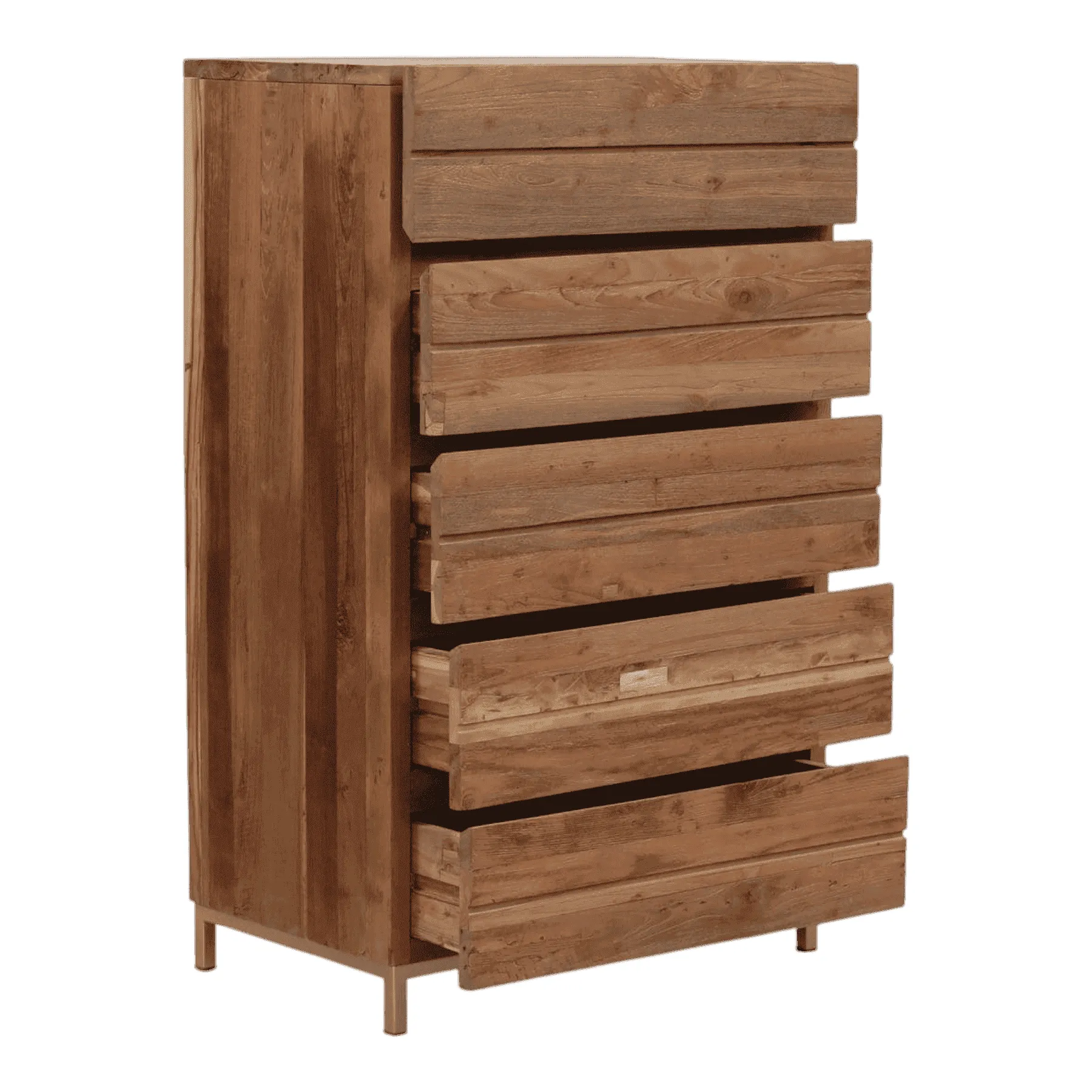 This tallboy chest is a stunning piece of textured, modern design Its entire facade is composed of horizontal wooden slats, creating a rhythmic, linear pattern that’s both bold and sophisticated The minimalist case is lifted on slender, simple legs, giving it an airy, floating quality This chest offers generous vertical storage while serving as a sculptural focal point for a contemporary bedroom