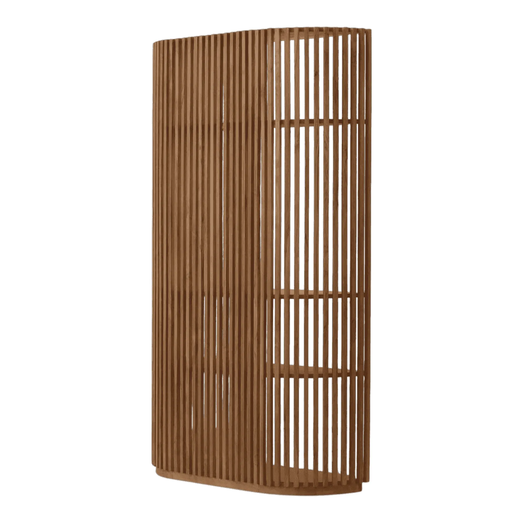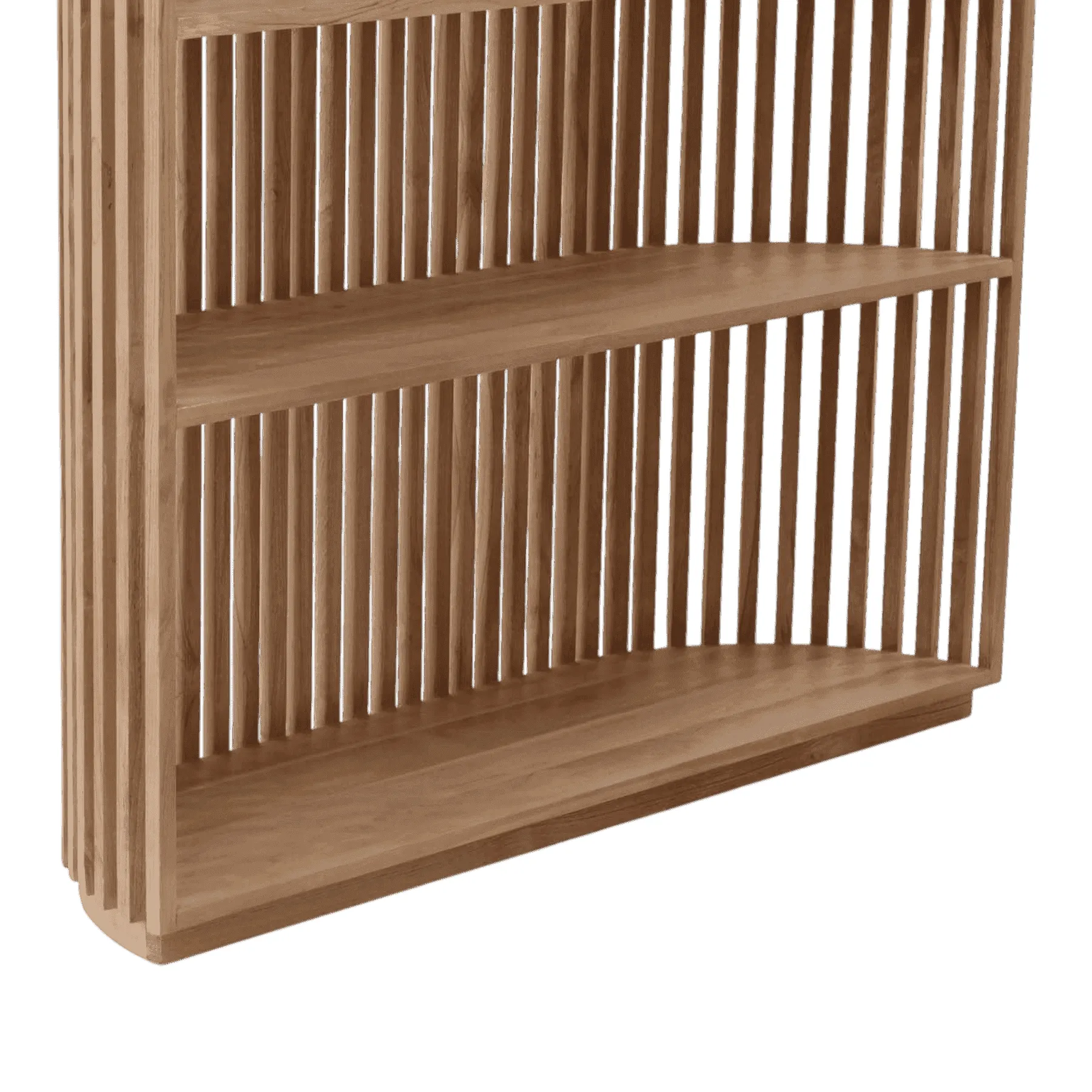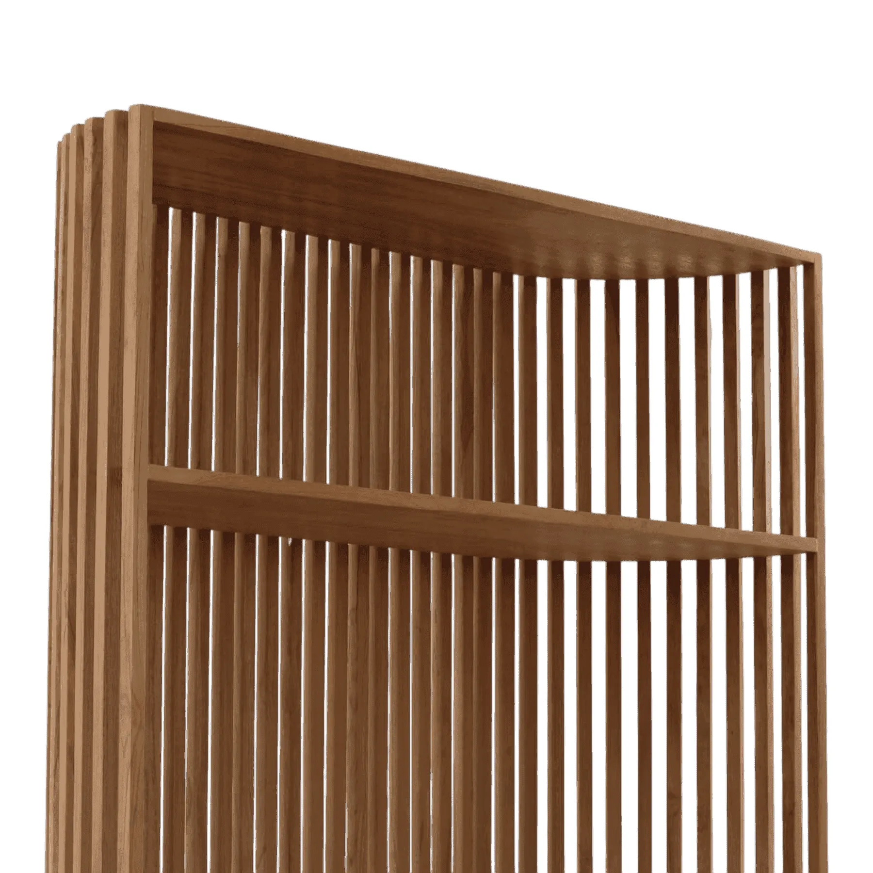 This bookcase is a striking piece of architectural design Its defining feature is a full-height screen of vertical wooden slats, creating a semi-transparent effect that plays with light and shadow Simple, floating shelves are integrated into the structure, offering a minimalist stage for books and art Crafted from natural teak, this unit acts as both a functional bookcase and a stunning room divider