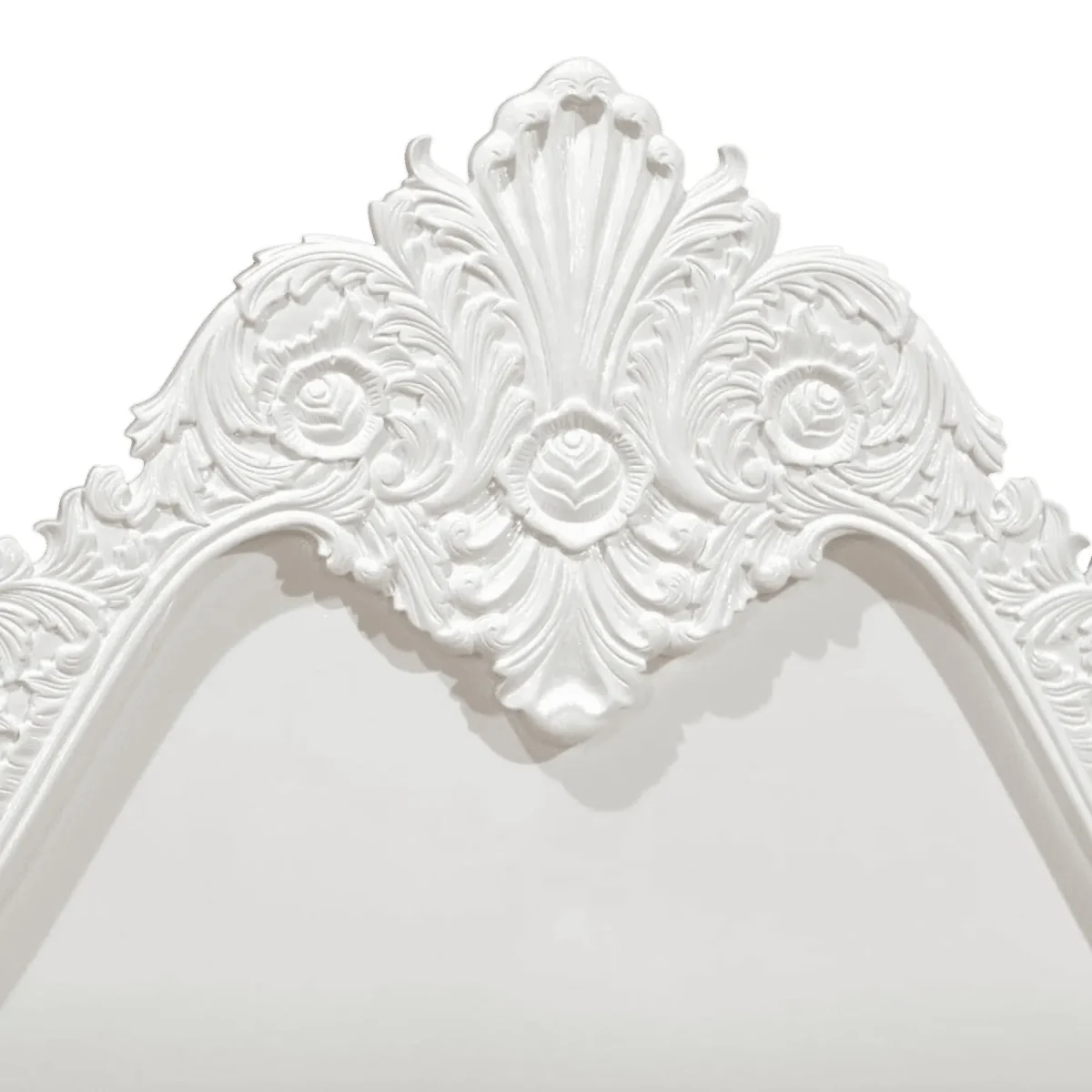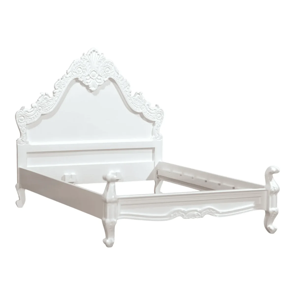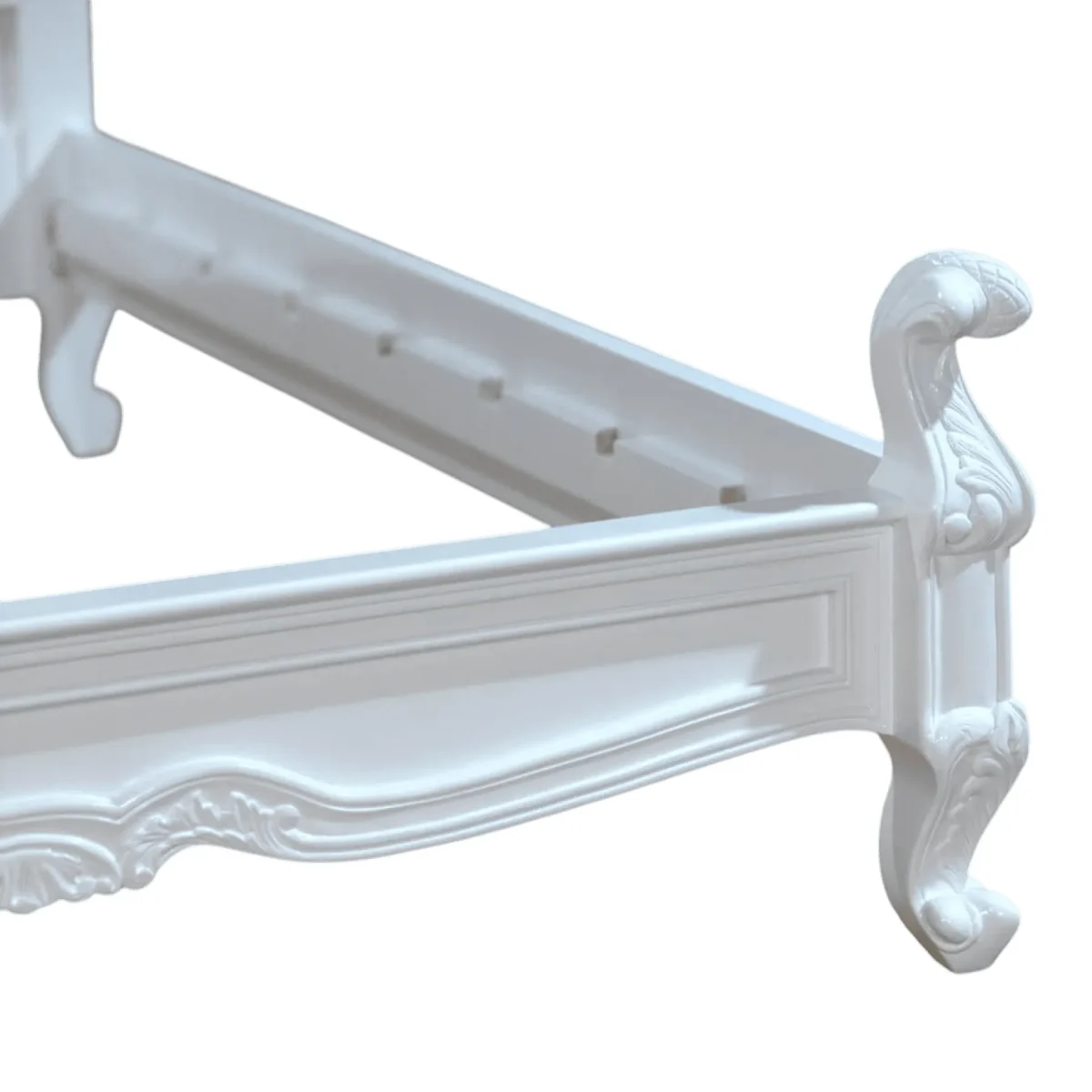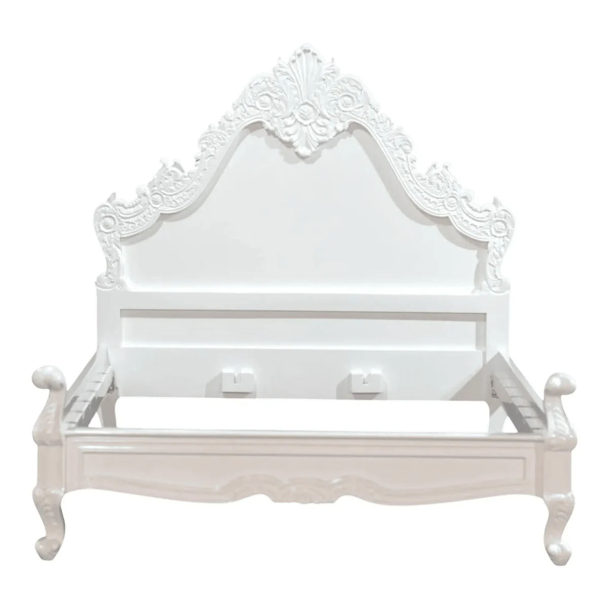 Create a sanctuary of purity and light with a bed frame that looks as if it were carved from a single block of precious stone The brilliant white finish highlights every intricate floral and leaf carving allowing the craftsmanship to take center stage without the distraction of color This piece is perfect for a bright airy bedroom where you want to maintain a sense of openness while still including a significant piece of furniture The tall headboard acts as a majestic crown for your pillows providing a backdrop that makes any bedding set look like it belongs in a five-star hotel suite It offers a timeless appeal that can transition from a romantic cottage style to a more formal classic interior providing a versatile foundation for your changing decor needs through the years while maintaining its status as the most beautiful object in the room