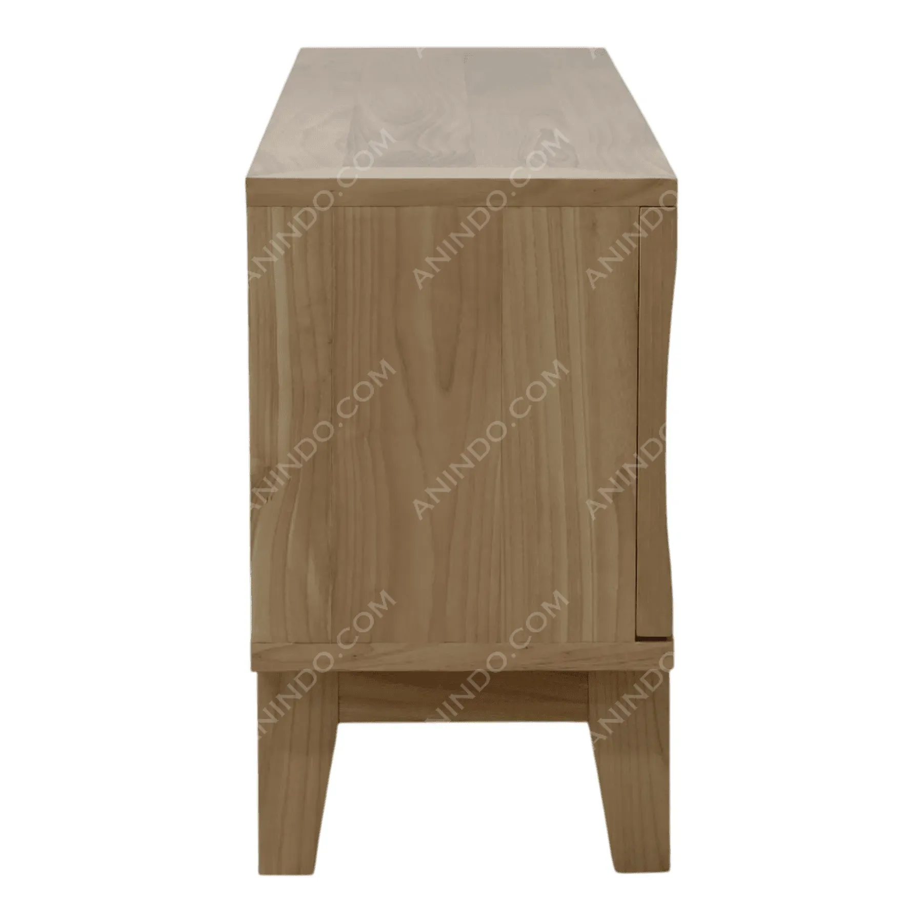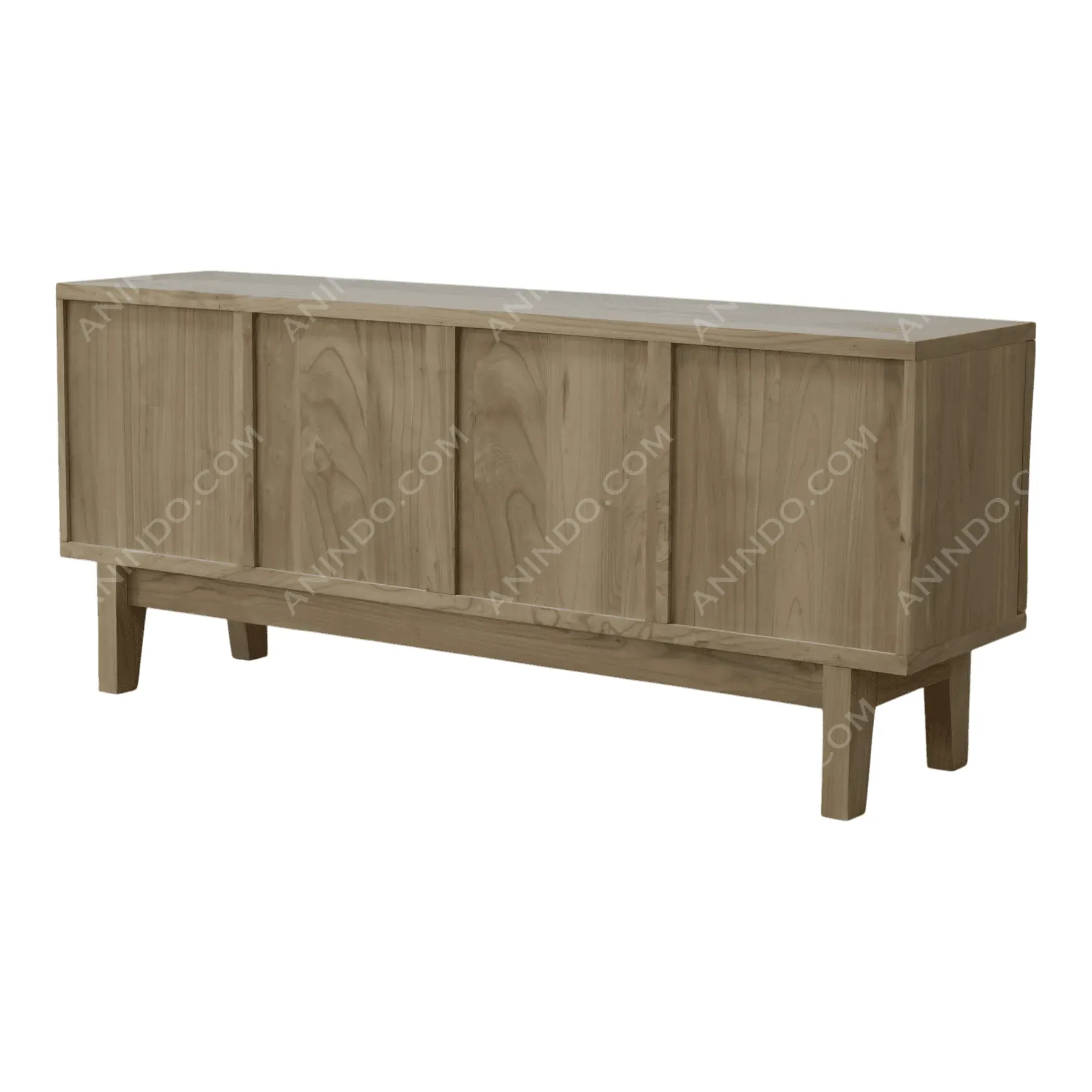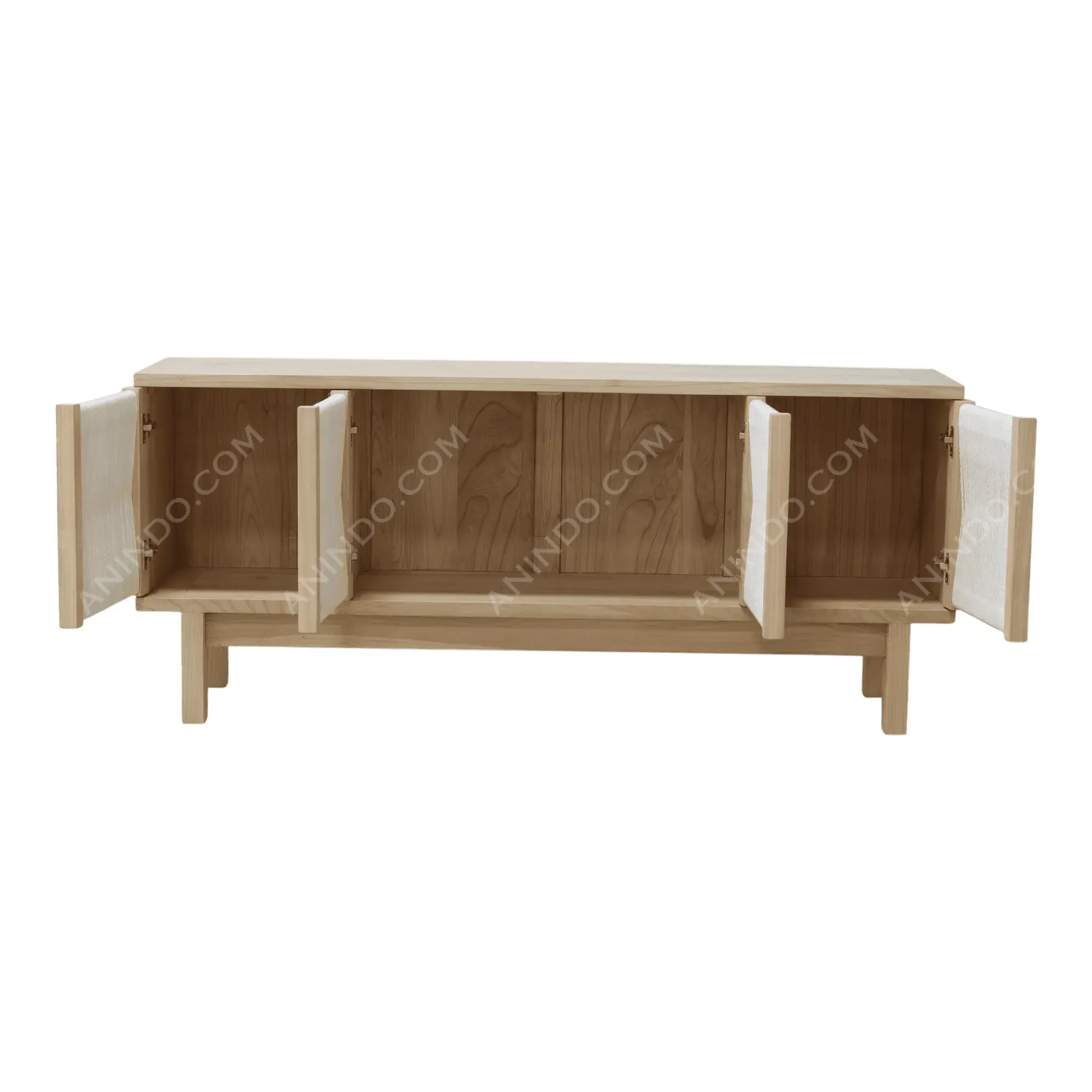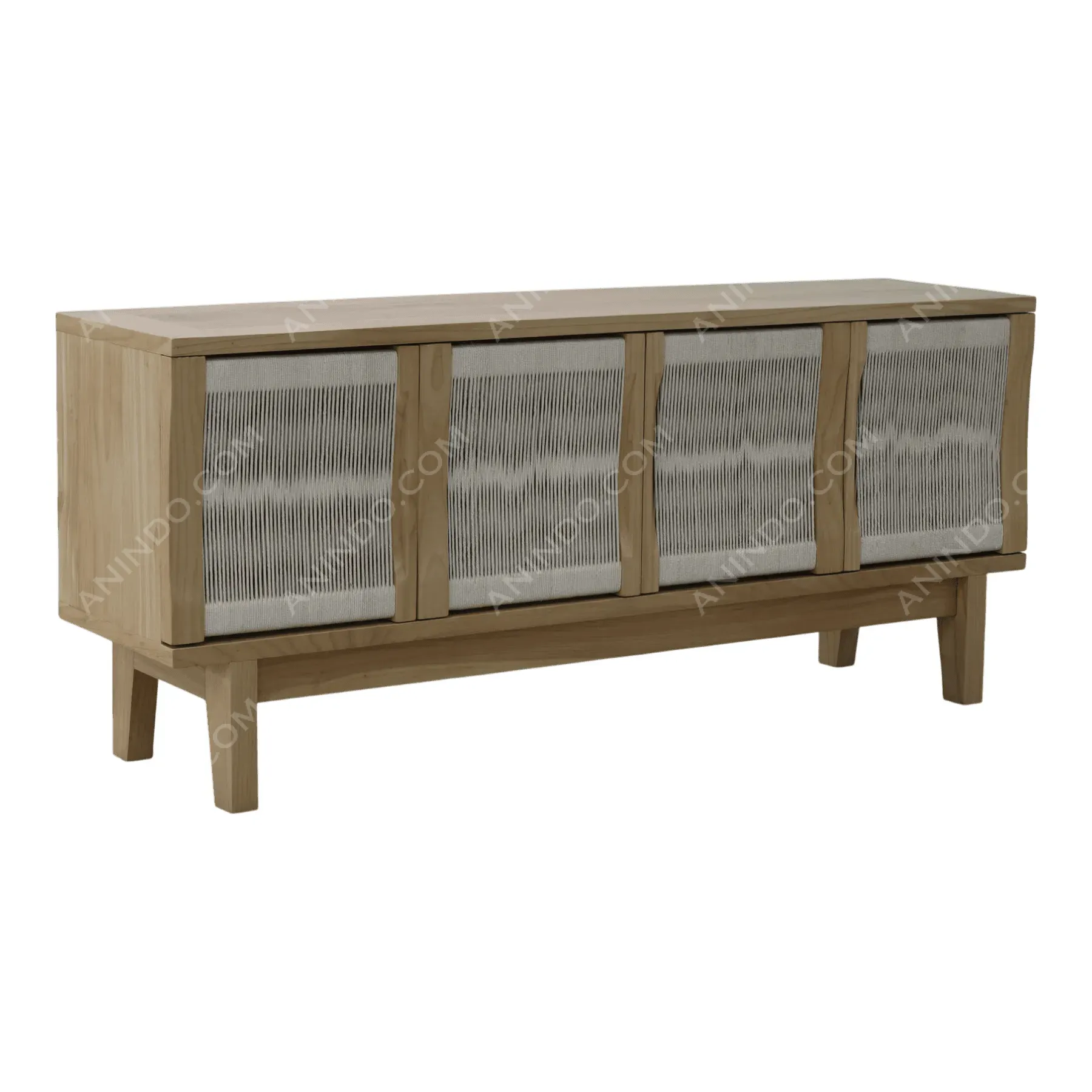 Storage that soothes the senses; This elegant four-door sideboard marries a clean-lined teak frame with beautifully textured door fronts; Each panel features vertically wrapped cording, creating a soft, tactile facade that invites touch; The design feels light and airy, avoiding the visual weight of solid doors; Raised on minimalist sled legs, this piece offers ample storage while maintaining a graceful, modern profile; It’s an ideal anchor for a dining room or a media center