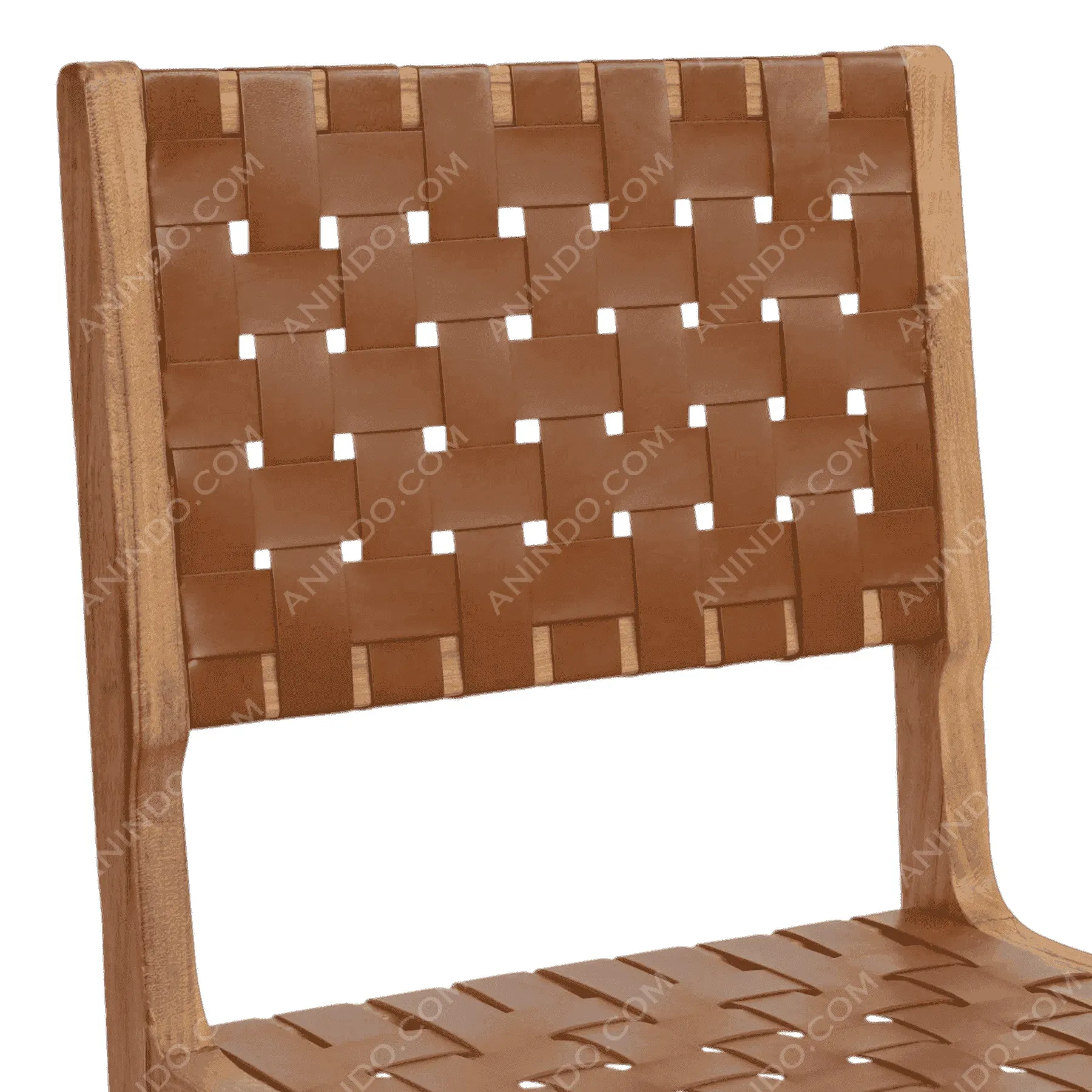 Primary Frame: Solid Teak | Seat/Back: Woven Leather Straps | Finish: Medium Stain | Upholster & Cushion: Woven Leather