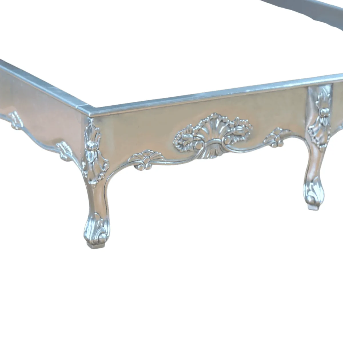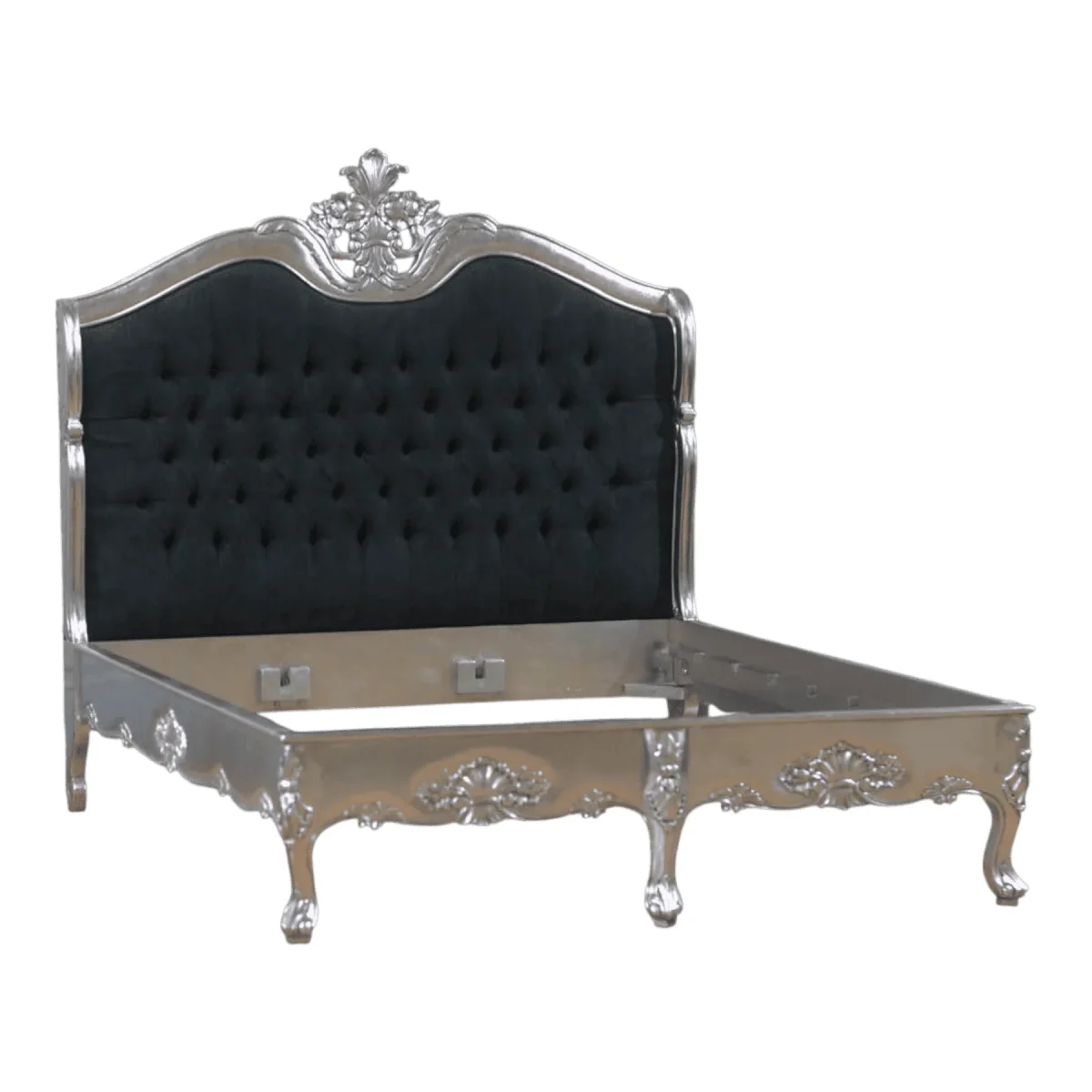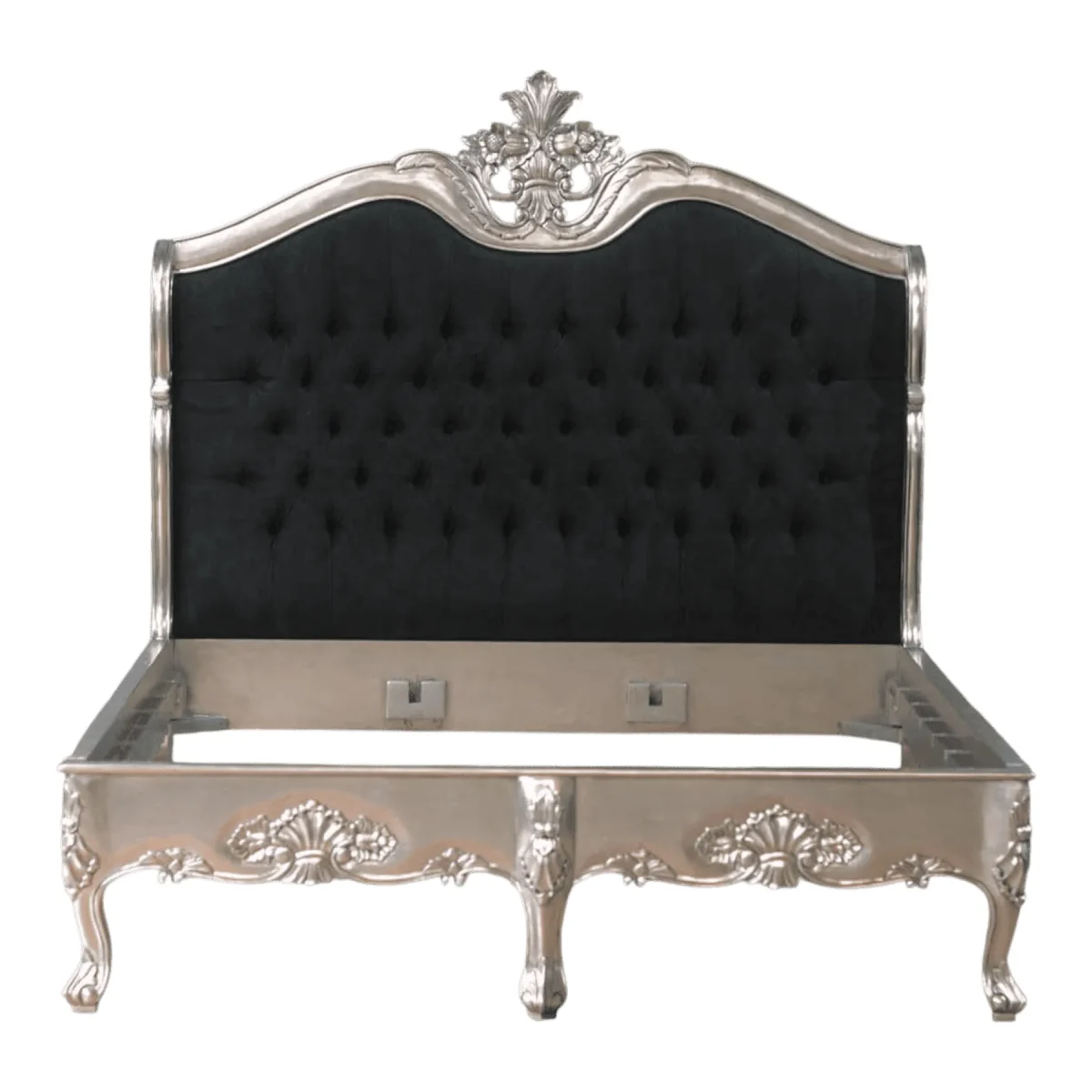 This breathtaking bed frame serves as a dramatic centerpiece for any master suite featuring a hand-carved silver leaf finish that catches light from every angle Its towering headboard is draped in plush black velvet with deep diamond tufting providing both a tactile indulgence and a visual anchor for the room Crafted with precision the ornate scrollwork along the crown and base reflects a dedication to old-world artistry while the sturdy internal frame ensures modern durability Perfect for those who desire a sleeping sanctuary that feels like a private palace this piece merges Gothic noir sensibilities with high-fashion French design making every evening feel like a grand event in a boutique hotel