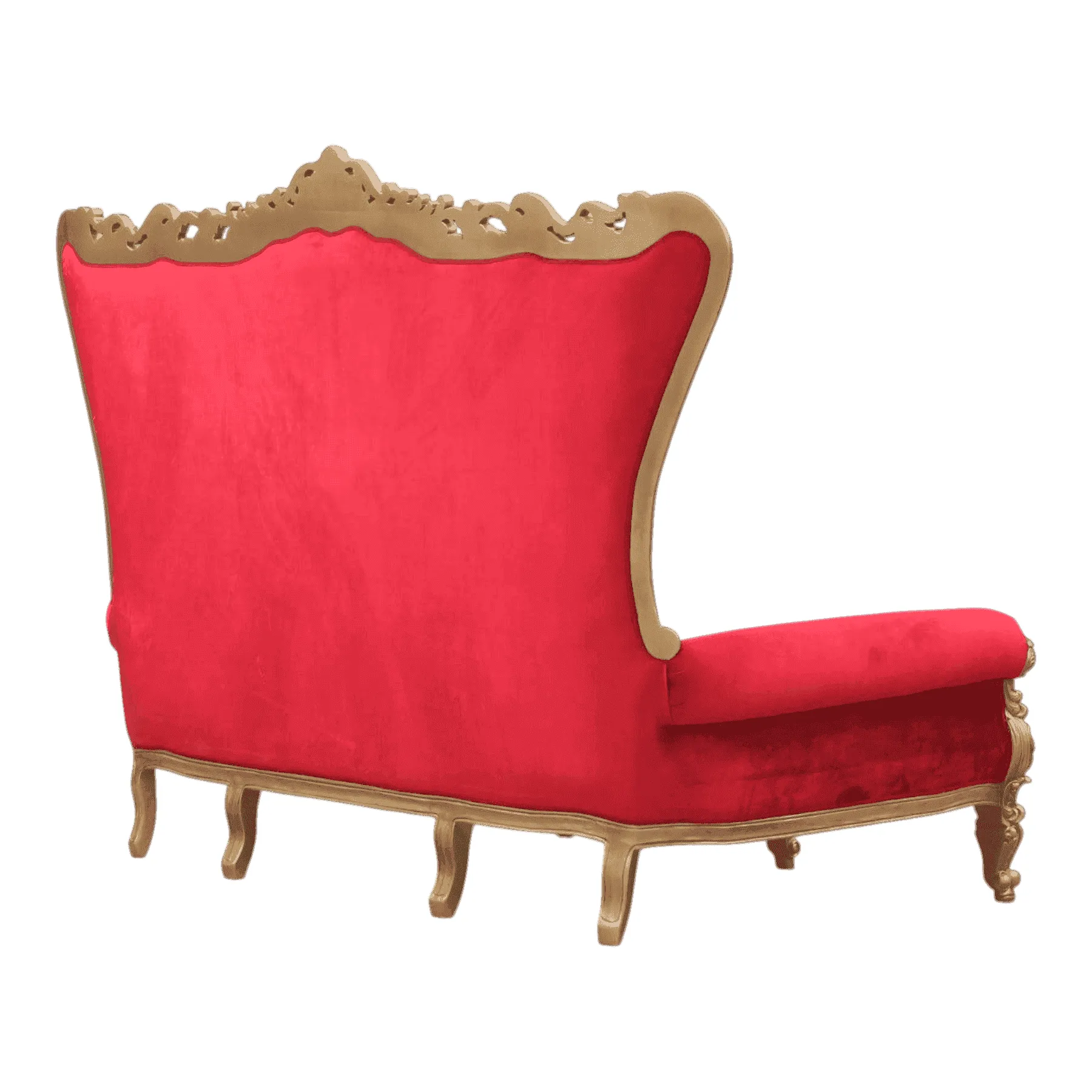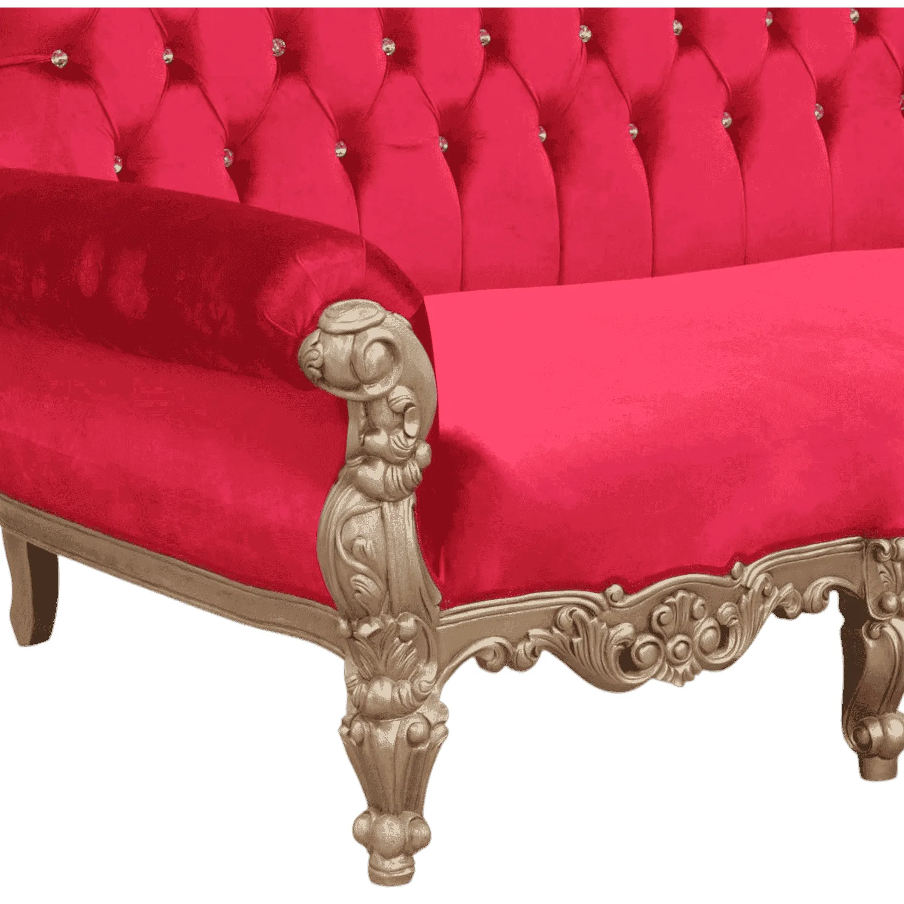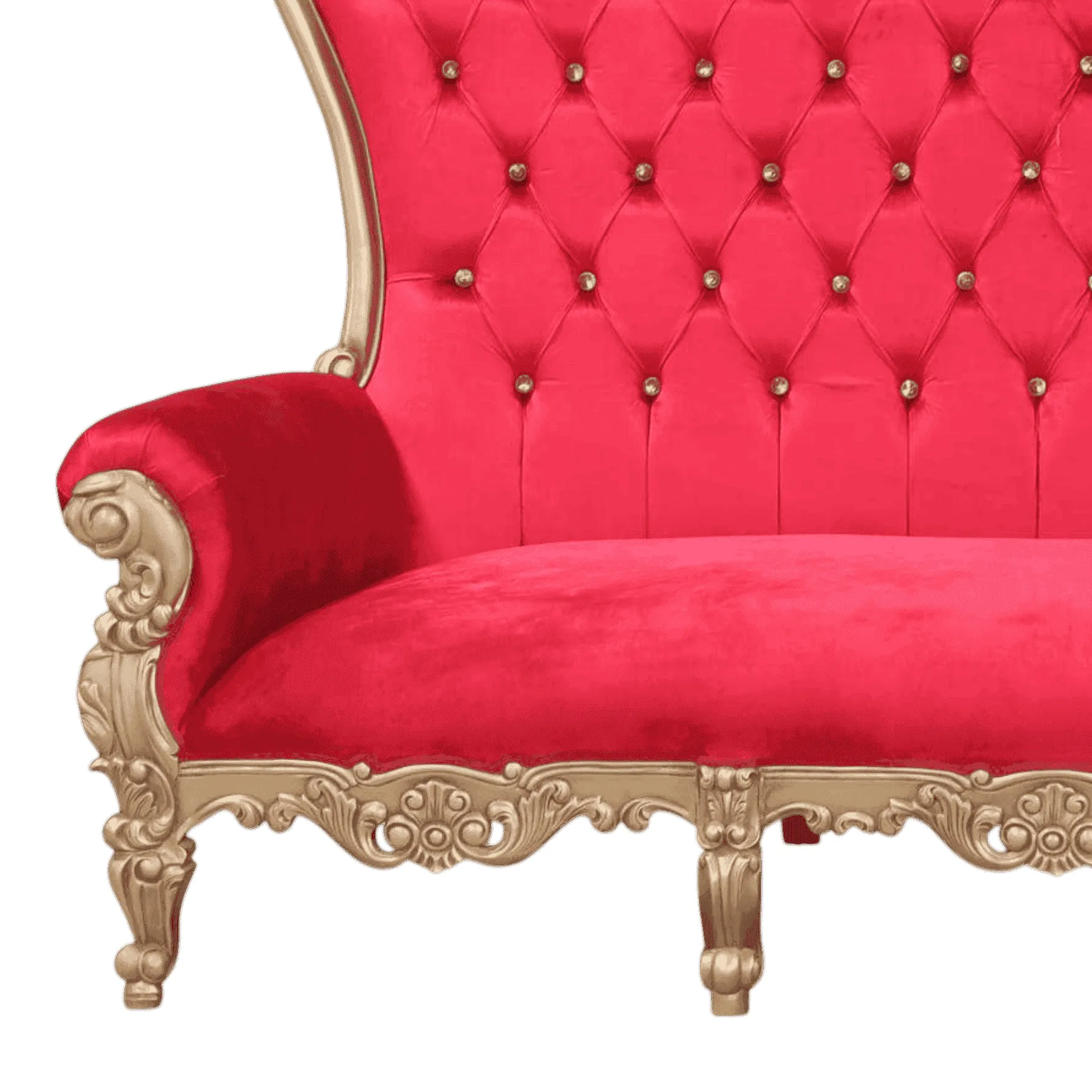 Primary Frame: Solid Carved Wood | Joinery: Traditional Frame Construction | Finish: Gold Leaf or High-Gloss Gold Paint | Upholster & Cushion: Crimson Red Velvet with Deep Button Tufting