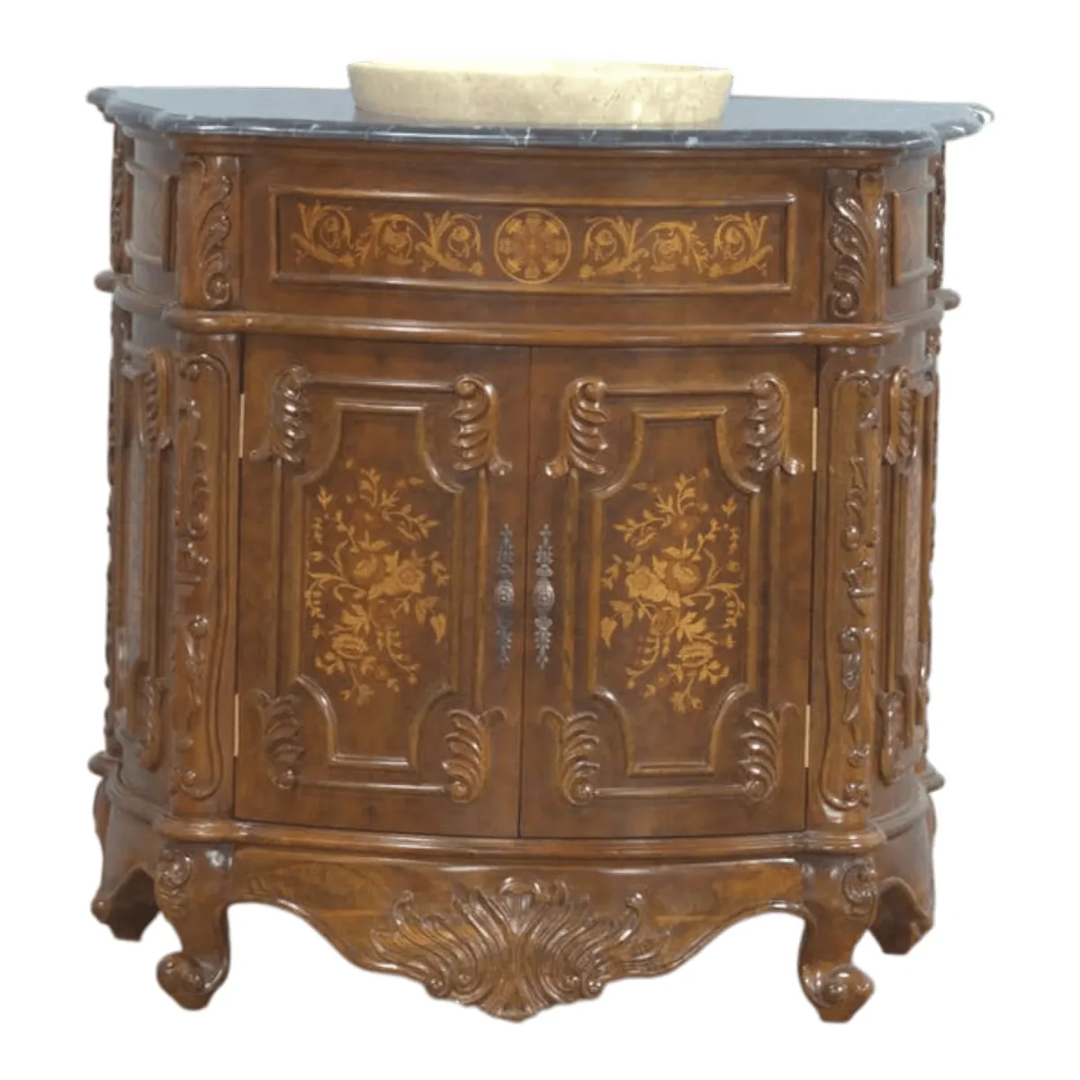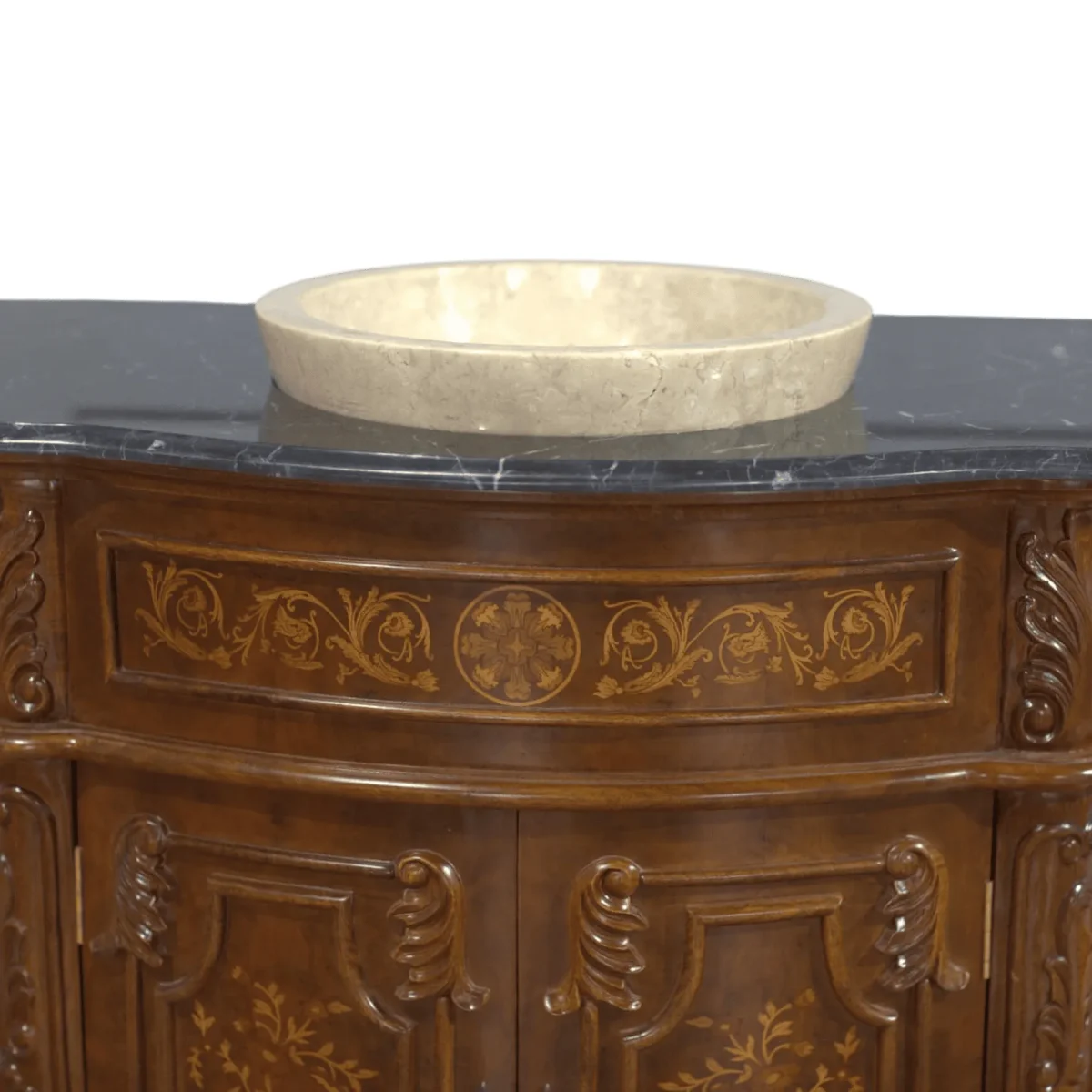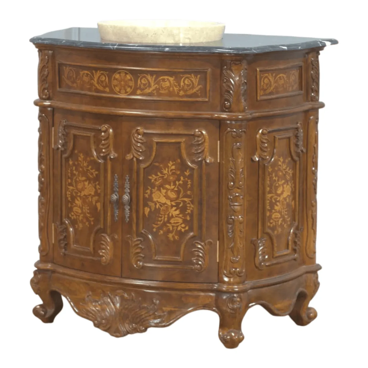 This extraordinary vanity cabinet is a masterpiece of marquetry and wood inlay featuring intricate floral patterns that showcase incredible artisan skill the curved mahogany body is finished in a warm amber tone that serves as the perfect canvas for the lighter wood accents and hand carved details including acanthus leaf corners and a stunning shell motif at the base the top is crowned with a luxurious black marble slab providing a durable and sophisticated surface for a wash basin or decorative items two elegantly paneled doors open to reveal generous storage space making it as functional as it is beautiful this piece is designed to be the crowning jewel of a master bathroom or a grand hallway offering a level of detail and luxury that evokes the spirit of a grand european estate where every piece of furniture is a work of art