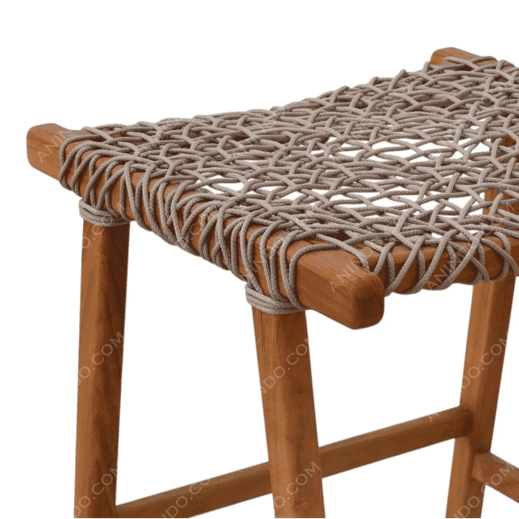This elegant bar stool brings a coastal, airy feel to your counter The solid teak frame features a sturdy ‘X’ stretcher for stability and a footrest The star is the curved backrest, created from thin teak rods intricately bound with dark rope, offering a flexible and visually light support A simple white seat cushion adds a bright touch of comfort to this sophisticated, modern piece