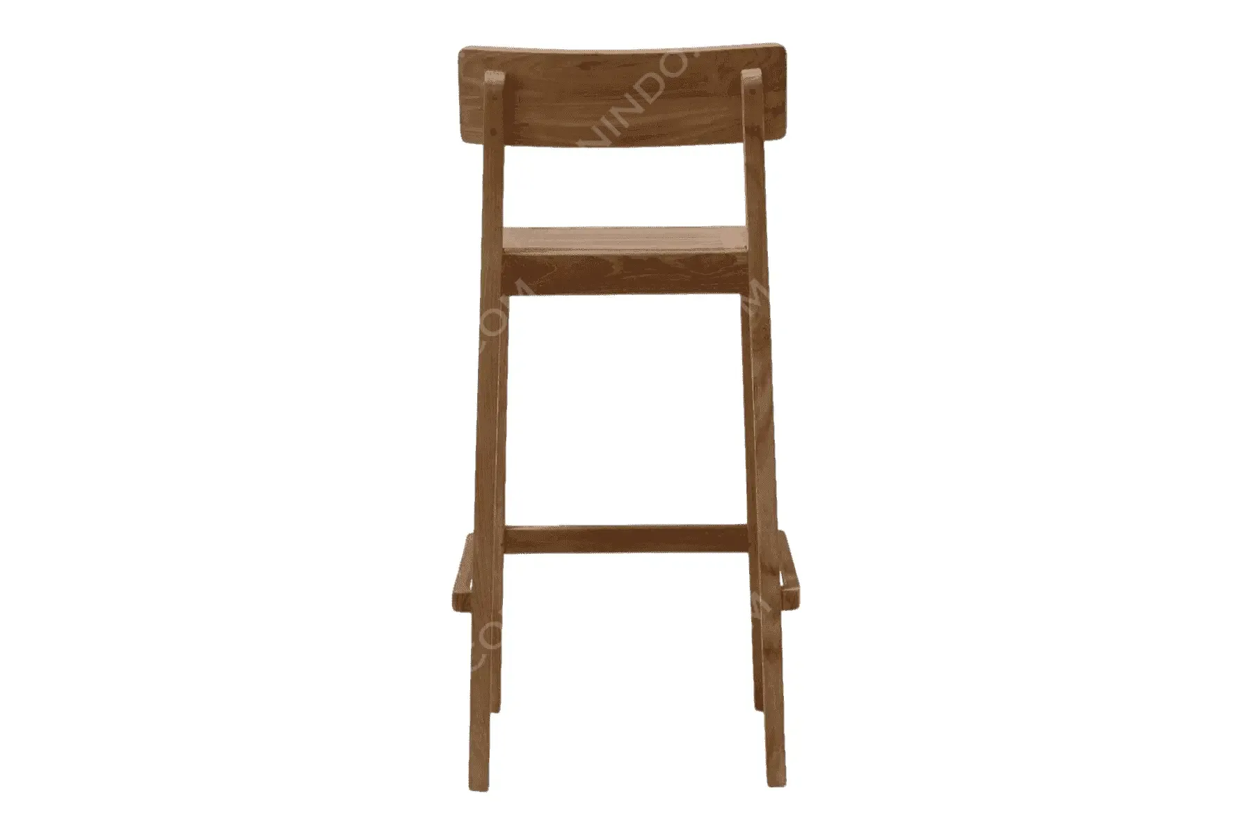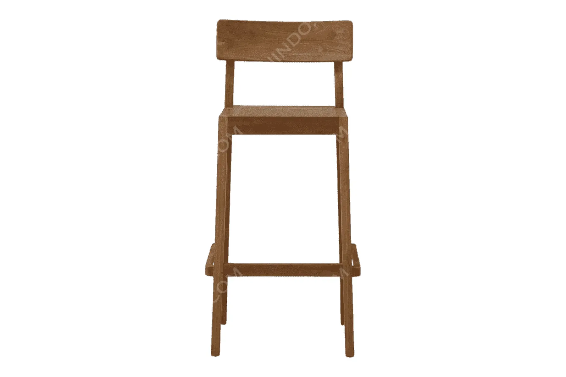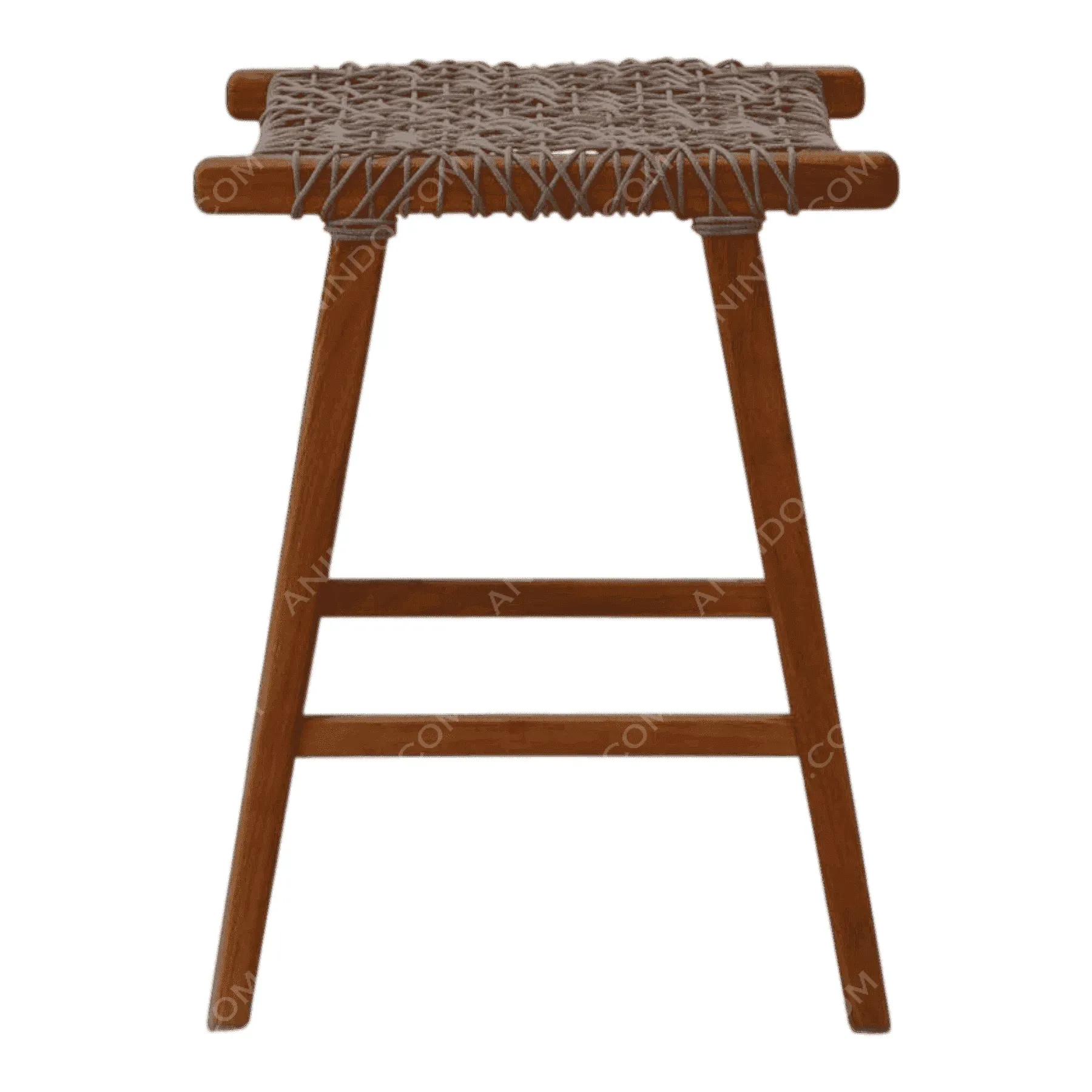 This elegant bar stool brings a coastal, airy feel to your counter The solid teak frame features a sturdy ‘X’ stretcher for stability and a footrest The star is the curved backrest, created from thin teak rods intricately bound with dark rope, offering a flexible and visually light support A simple white seat cushion adds a bright touch of comfort to this sophisticated, modern piece