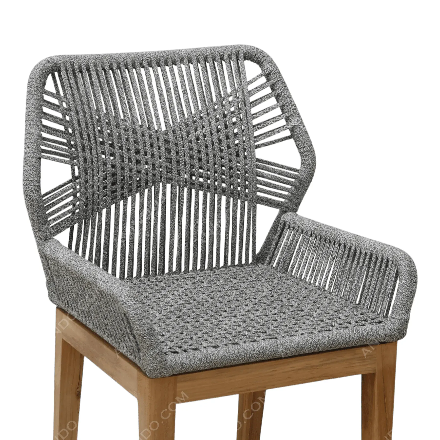 A sophisticated and modern dining chair that fully embraces texture; The entire seat, back, and arms are meticulously hand-woven from durable, charcoal-grey rope; This intricate weaving creates a supportive, comfortable, and visually striking shell; The seat features a tighter weave for durability, while the back displays a dynamic, open pattern; This tactile upper body rests on a simple, robust teak frame with four straight legs; A perfect blend of modern craft and durability for an elevated dining experience