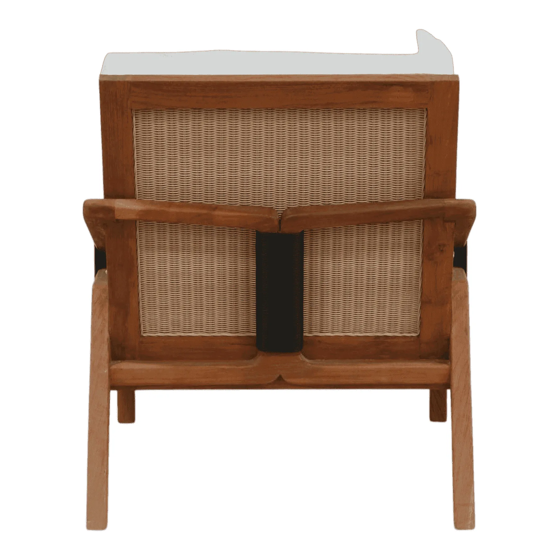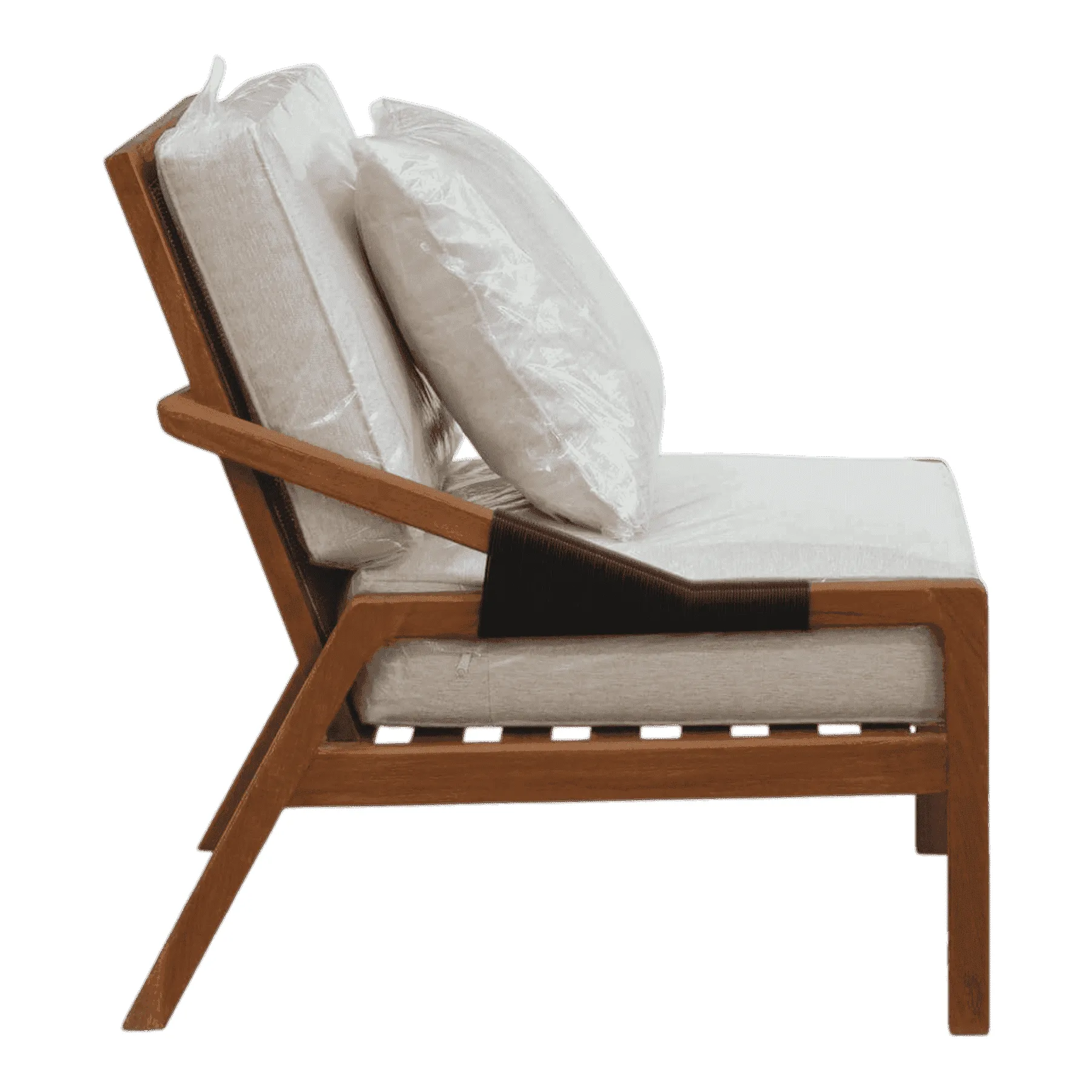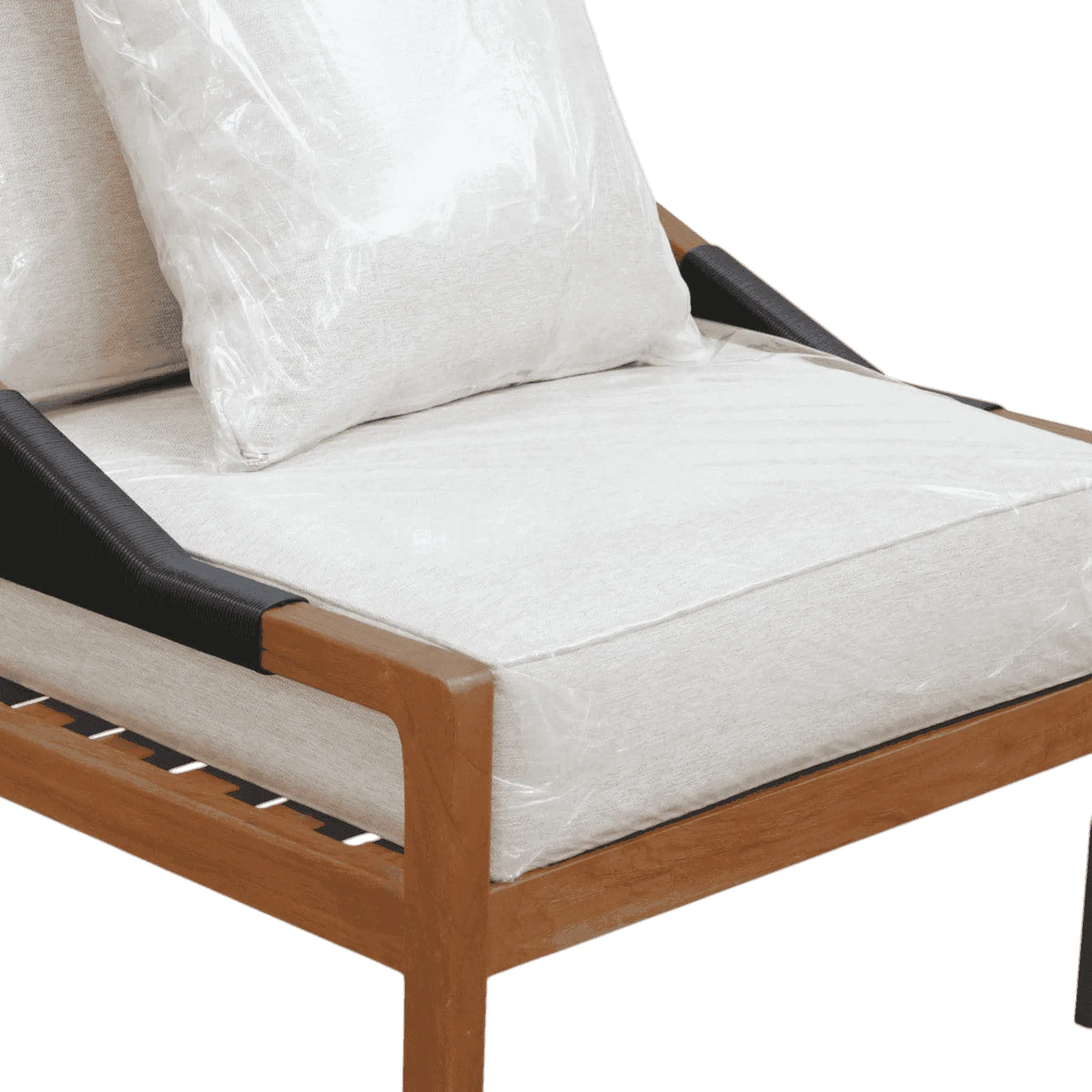 Primary Frame: Solid Teak | Joinery: Mortise and Tenon | Finish: Natural Oil Finish | Upholster & Cushion: Sunproof® Olefin Fabric (White), Leather-Wrapped Armrests