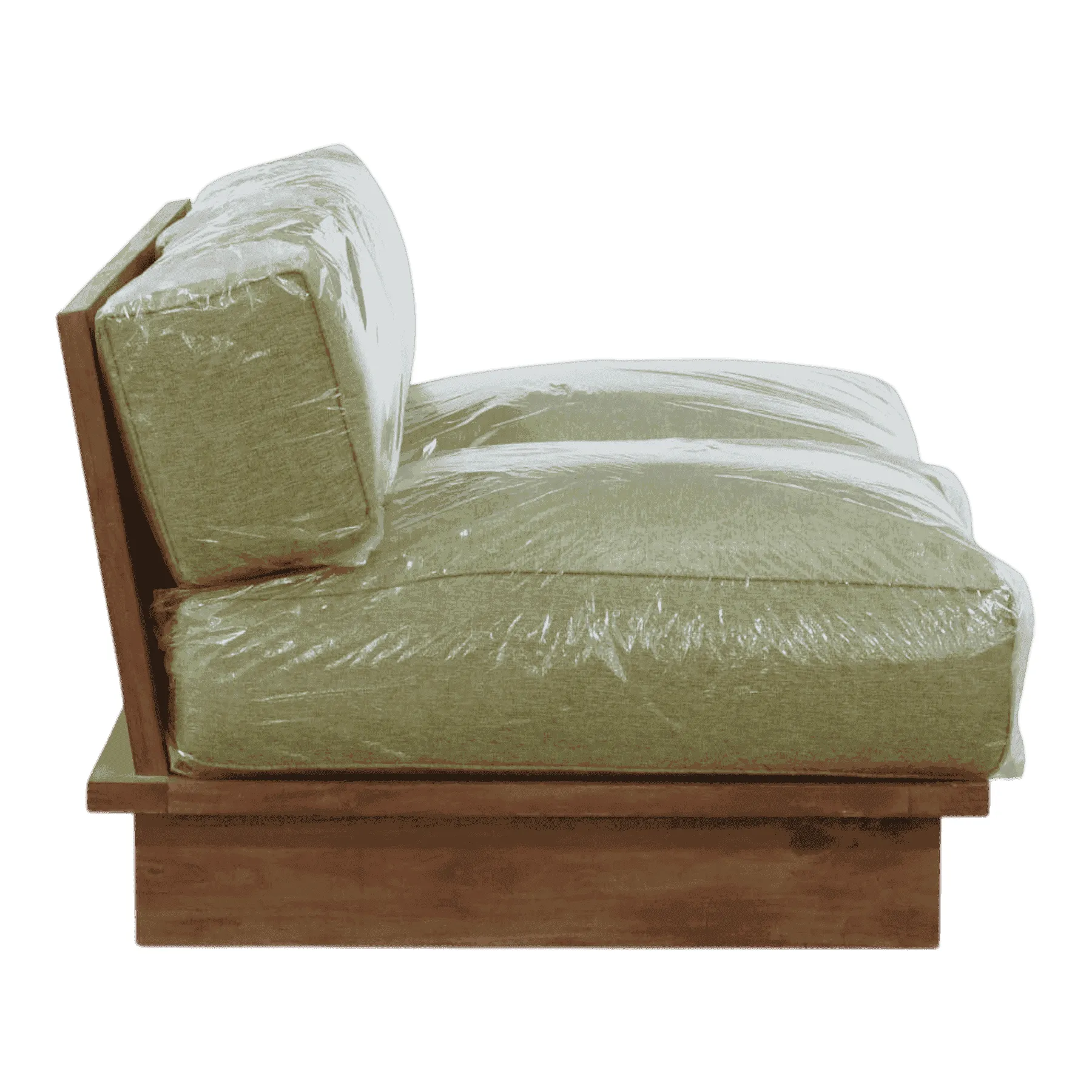 This loveseat is a perfect expression of minimalist, modern comfort Two overstuffed, armless cushions in a soft sage green rest on an ultra-low, dark wood platform base This “floating” design creates a relaxed, grounded, and contemporary feel It’s an ideal piece for a minimalist living room, lounge, or media room, inviting you to sink in
