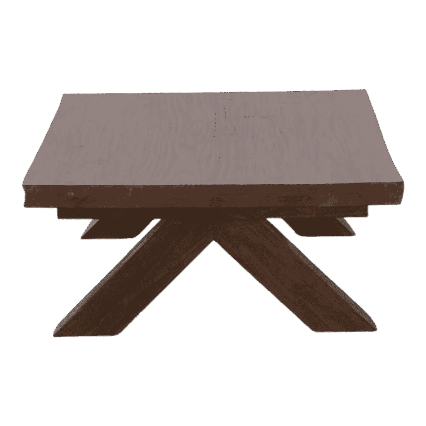 This low table is a superb example of minimalist, Japanese-inspired design Its thick, solid wood top showcases a clean, straight grain and rests on two robust, T-shaped legs This simple, powerful construction gives the table a grounded, “floating” appearance It’s a perfect, zen-like centerpiece for a modern or wabi-sabi living space