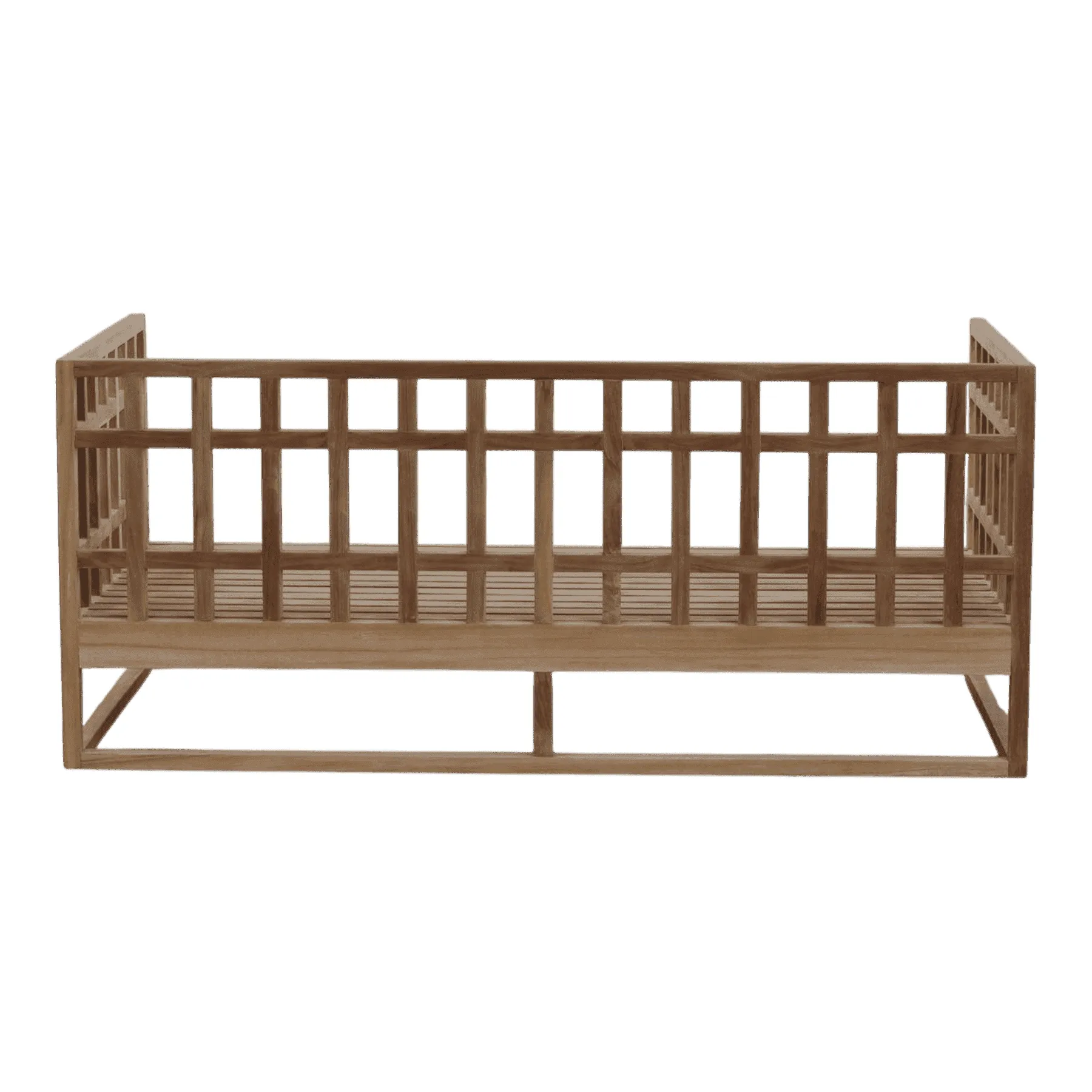 This teak bench is a beautiful example of geometric, modern design Its unique back and arms are constructed from an open grid of solid wood, creating a light, airy, and architectural look The slatted seat provides classic, durable comfort This piece is a sophisticated and stylish seating solution for a garden, patio, or modern entryway