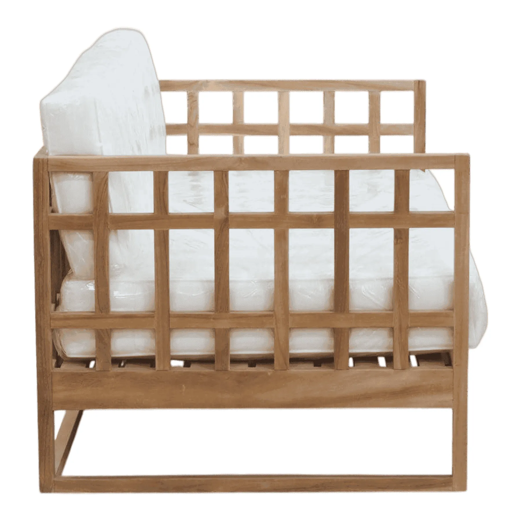 Primary Frame: Solid Teak Wood | Joinery: Mortise and Tenon, Cross-halving | Finish: Natural Oiled Teak | Upholster & Cushion: High-Density Foam with White Fabric (shown wrapped)