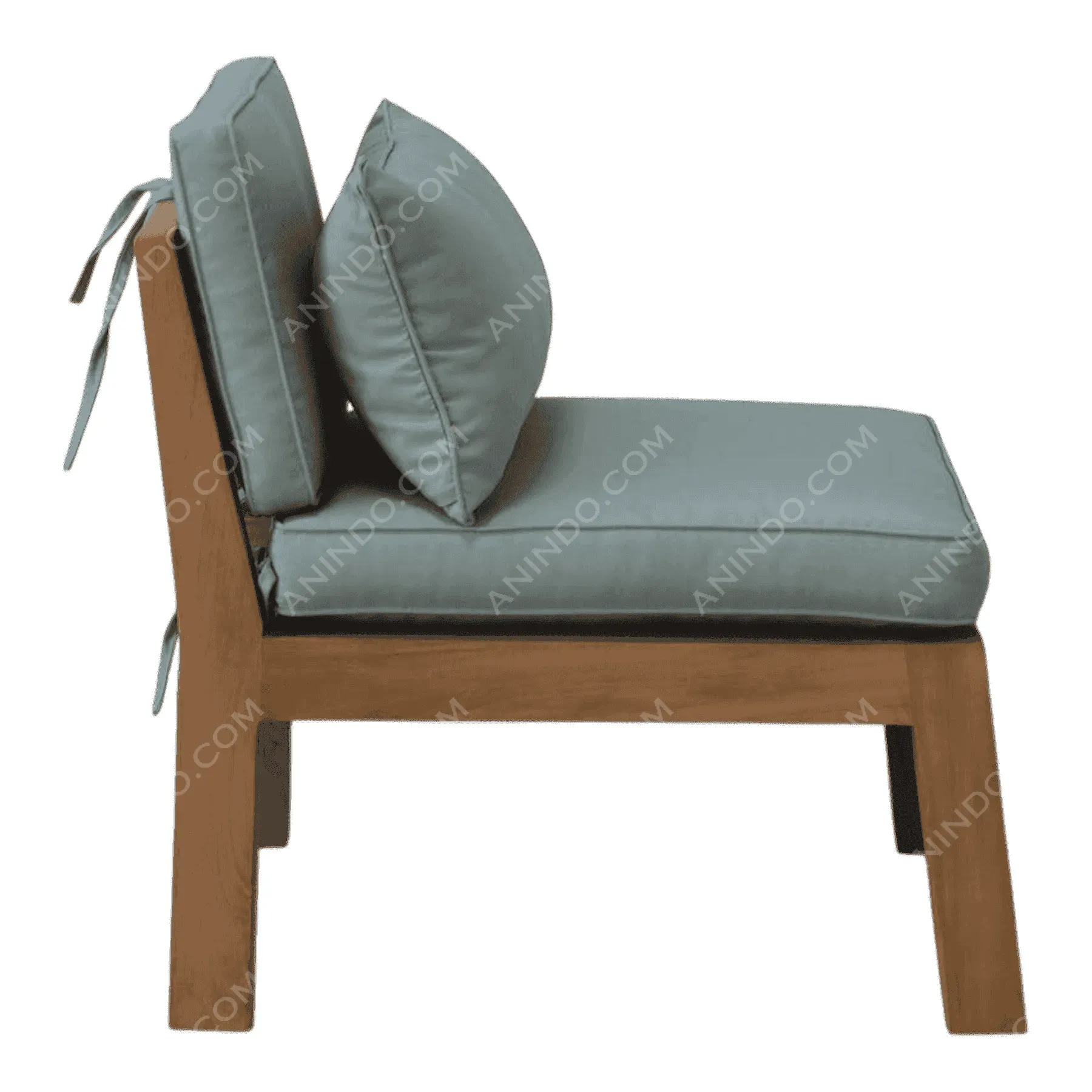 This armless chair is the ultimate in plush modular comfort Designed as a standalone lounge piece or as part of a larger sectional it features a simple solid wood base for a touch of natural warmth Its deep generous cushions in a serene blue-grey fabric create an inviting sanctuary A large loose pillow for the back provides an extra layer of sink-in softness This chair is perfect for a relaxed modern living room where comfort is key