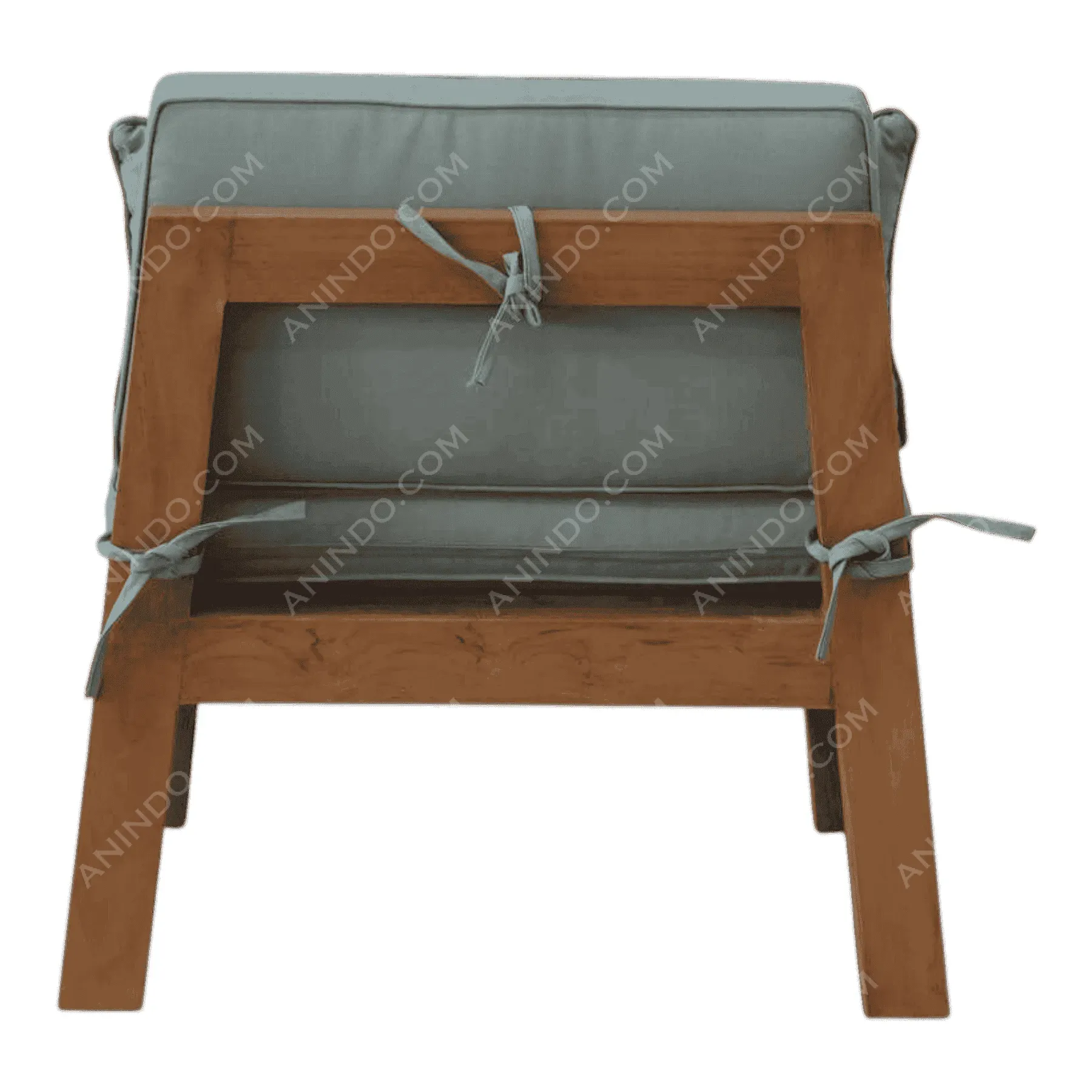 Primary Frame: Solid Teak or Ash Wood | Joinery: Mortise & Tenon | Finish: Natural Wood Stain | Upholster & Cushion: High-Density Foam with Blue-Grey Fabric