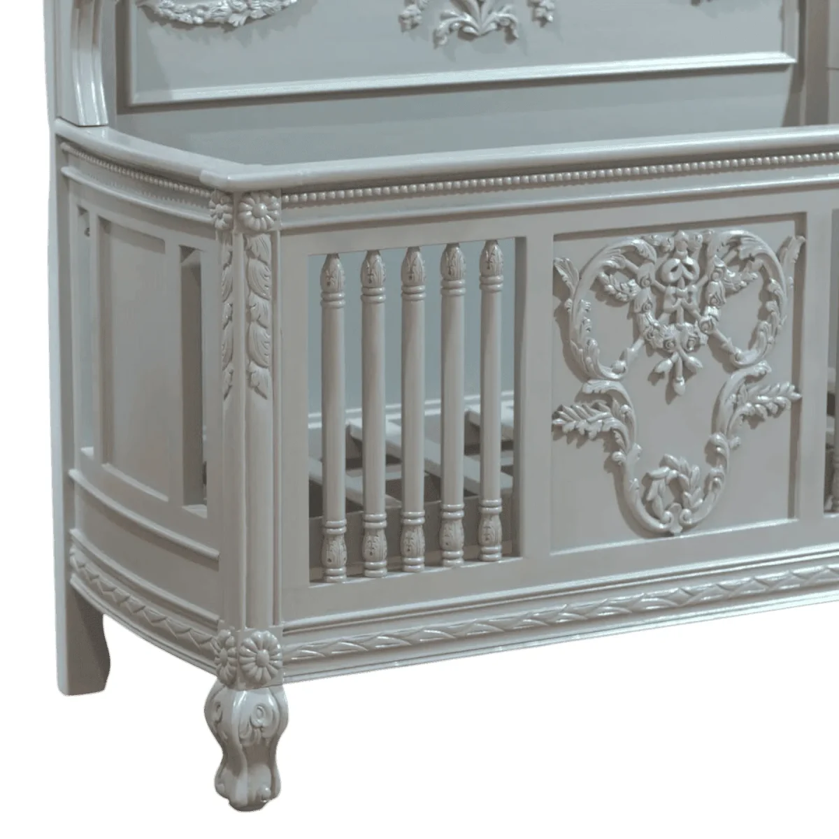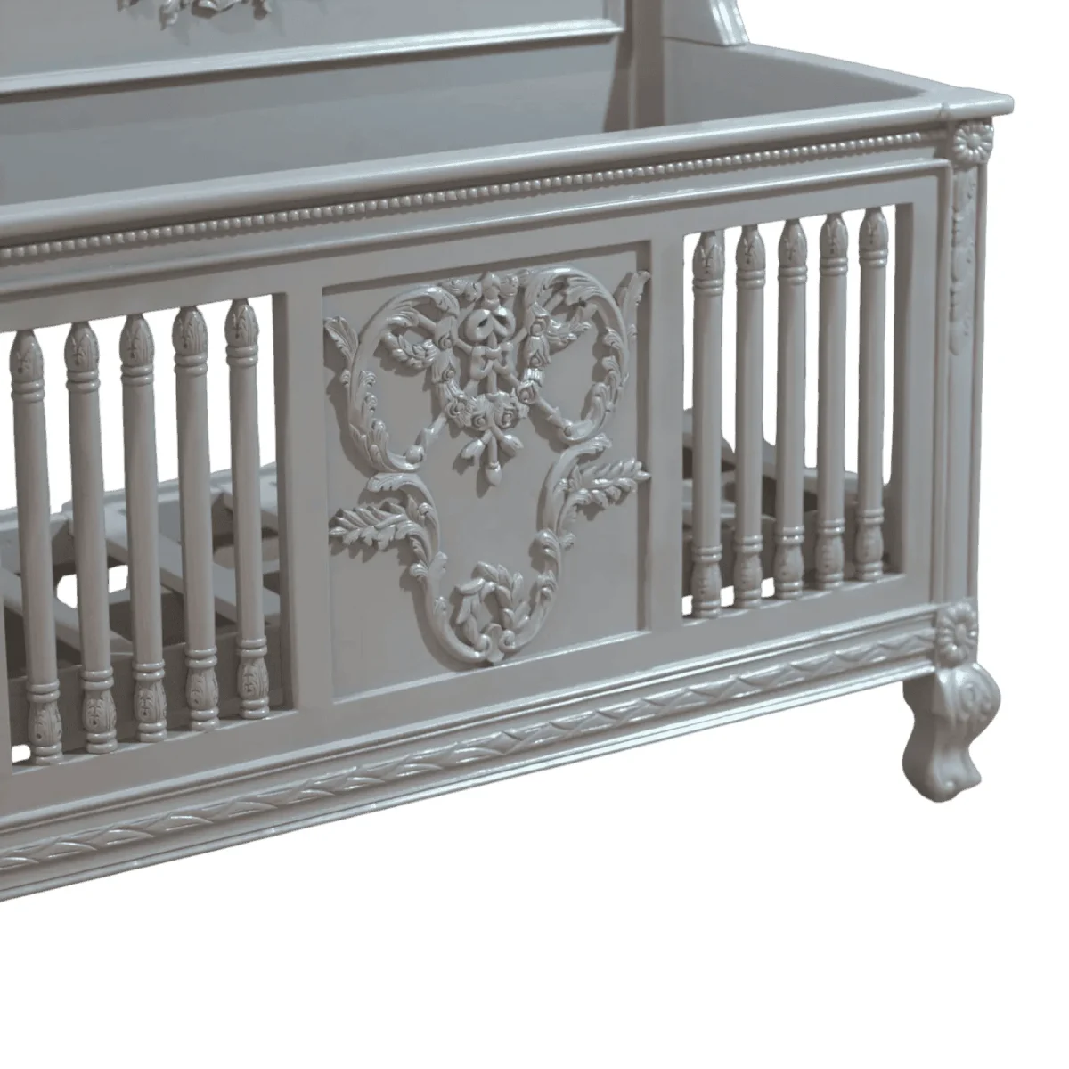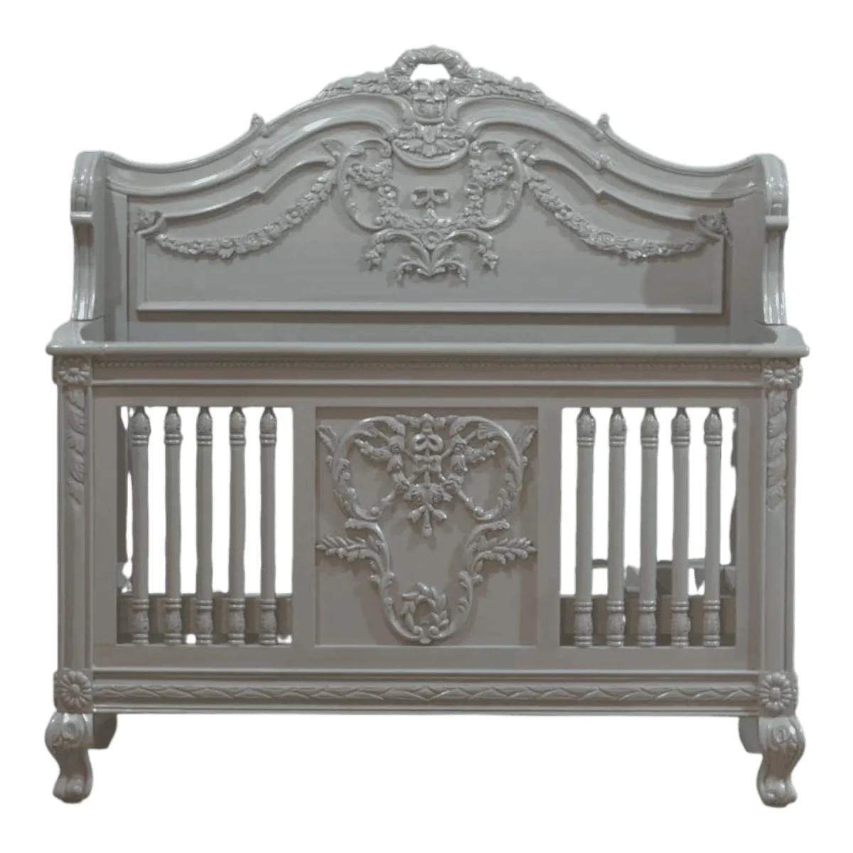 Welcome your little one into a world of luxury and grace with this stunningly ornate baby crib that transforms any nursery into a royal chamber filled with artisanal beauty and historical charm The crib features a high-back headboard adorned with intricate floral swags and a central crest while the slatted sides provide safety and visibility within a framework of hand-carved elegance The soft grey finish offers a calming neutral tone that suits both modern and traditional nurseries providing a sophisticated backdrop for soft linens and plush toys Crafted with the highest safety standards in mind using solid mahogany wood this crib is designed to be a durable and beautiful sanctuary for your child through their earliest years and can serve as a cherished family heirloom passed down through generations reflecting a commitment to quality and the celebration of new life