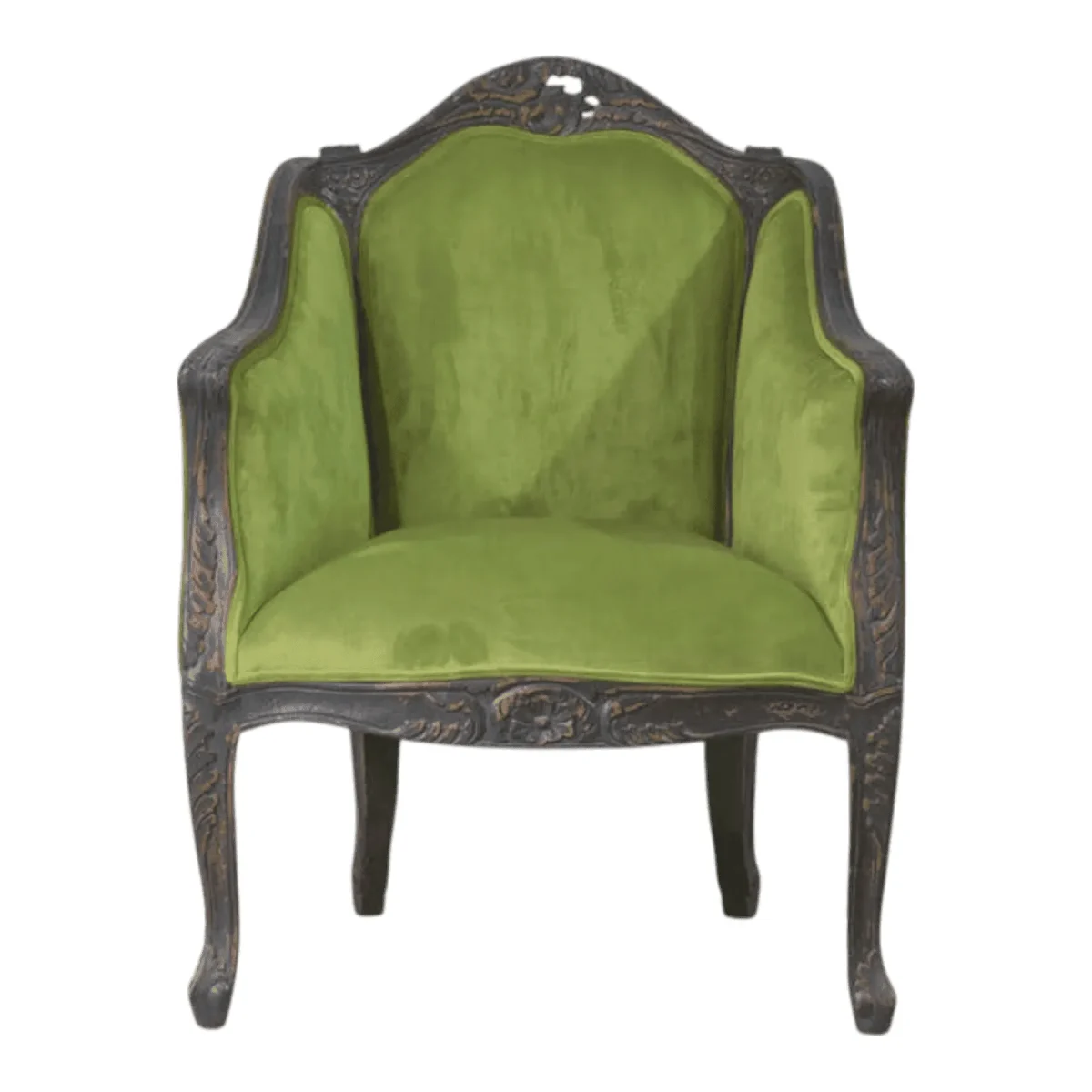 Transform your reading nook into a sanctuary of style with this vibrant seating solution that marries historical charm with modern comfort Hand-carved details along the dark frame showcase a level of craftsmanship rarely seen in contemporary homes while the deep green velvet offers a tactile experience that calms the senses This piece serves as a bold focal point for a curated interior reflecting a taste for the finer things in life and a deep appreciation for classical European design aesthetics that remain timeless throughout the years
