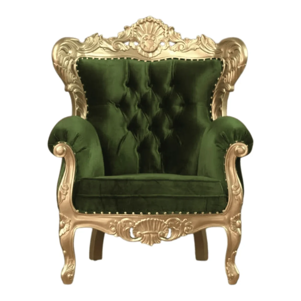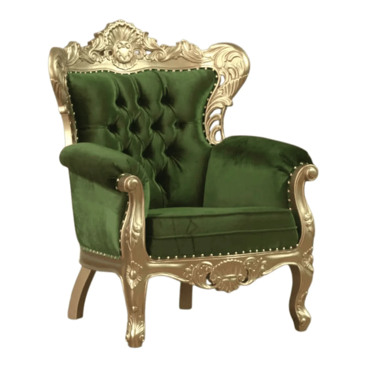 Indulge in the vibrant luxury of this stunning accent chair that pairs a lush forest green velvet with an extraordinarily detailed gold frame the high wingback design provides a sense of enclosure and privacy while the elaborate carvings of shells and scrolls along the crest and apron showcase the height of rococo-inspired artistry the thick seat cushion is piped for a tailored finish and the deep tufting on the backrest creates a plush visual texture that invites the sitter to sink in and stay awhile the gold finish on the frame is carefully antiqued to give it depth and character ensuring it doesn’t just shine but also tells a story of elegance and heritage whether used as a pair to flank a fireplace or as a standalone feature piece in a dressing room this armchair brings a sophisticated splash of color and a grand sense of occasion to any high-end interior