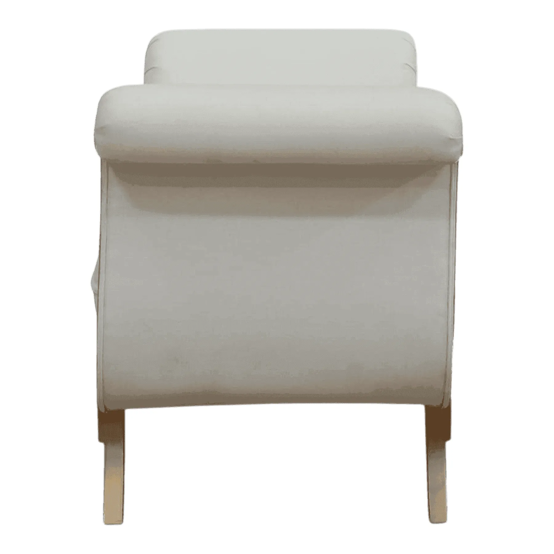 This elegant bench embodies Neoclassical grace with its distinctive scrolled arms and refined silhouette Its off-white upholstery provides a clean, serene seating surface, perfectly complemented by two matching bolster pillows for added comfort The wooden frame, finished in a subtle metallic bronze, features delicately carved legs and a clean apron This versatile piece is ideal for the foot of a bed, a grand hallway, or as sophisticated seating in a sitting room