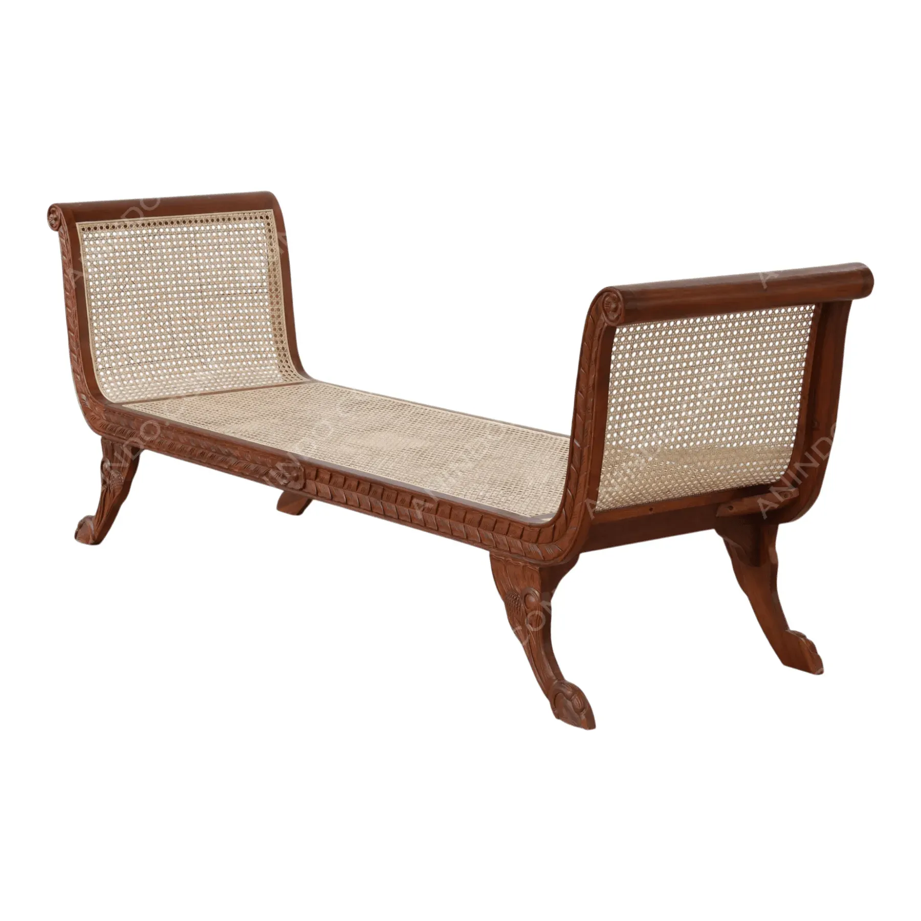 The design directly references the Roman Klinē or daybed, emphasizing symmetrical scrollwork and carved details. The use of cane maintains a light, airy feel, adapting the classical form for comfort in a tropical environment