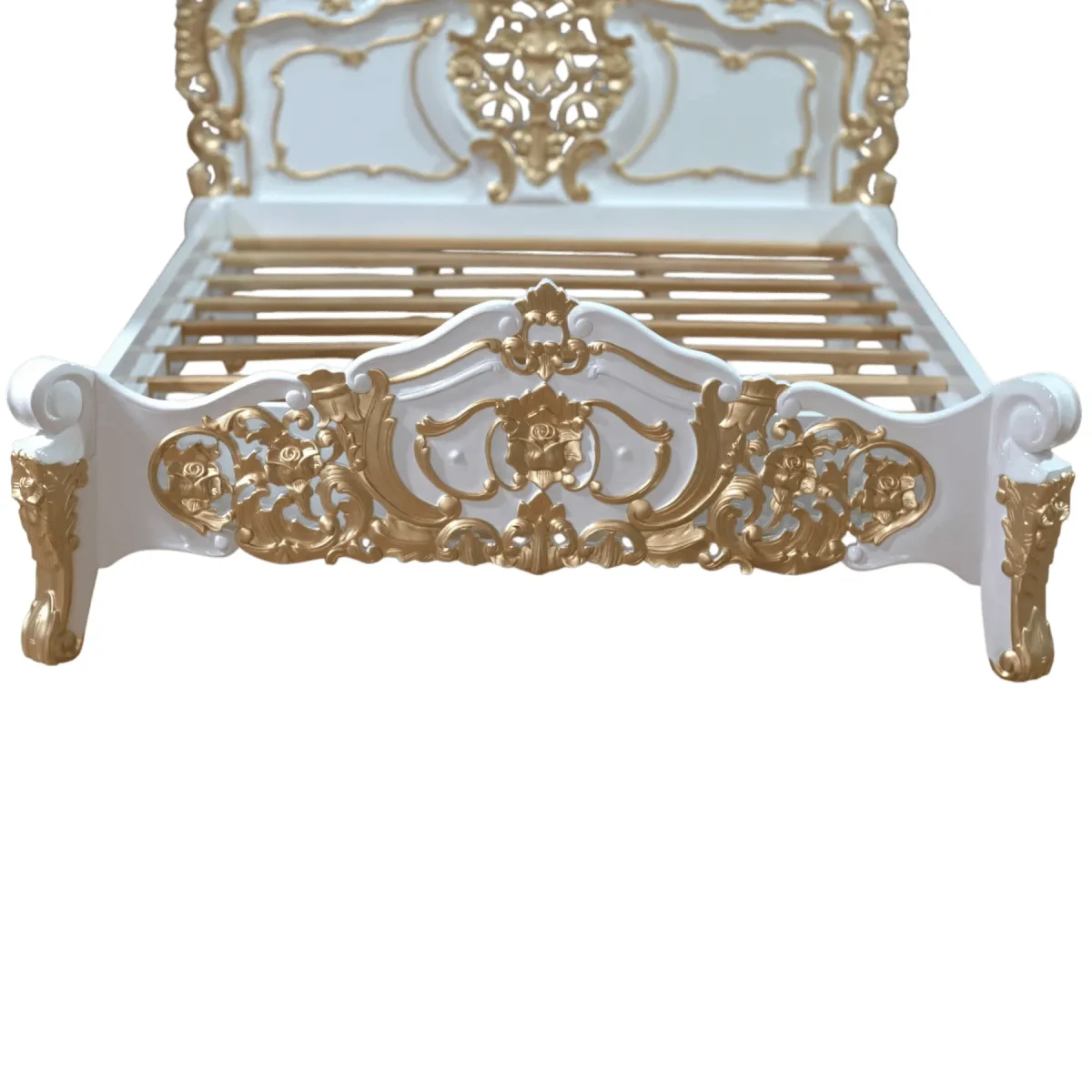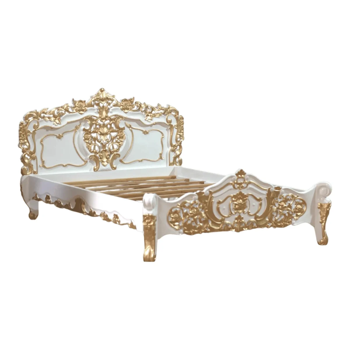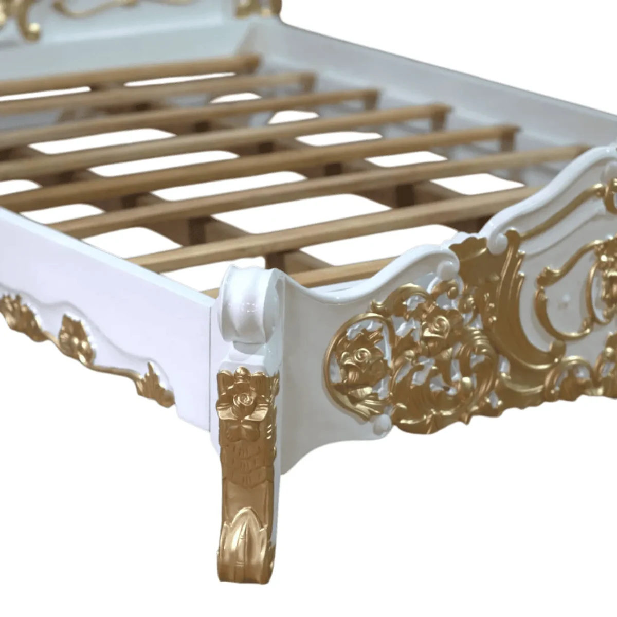 Awaken in a dreamscape of gold and white where every morning feels like a holiday in a Parisian palace This bed frame is a celebration of light and opulence featuring hand-applied gold leaf that traces the delicate curves of a masterfully carved headboard The pristine white finish provides a clean canvas that makes the metallic accents pop creating a refreshing yet decadent atmosphere in the bedroom Designed for those who appreciate the finer things in life this piece serves as the ultimate sanctuary for rest and rejuvenation after a long day The sturdy construction ensures that beauty is matched by longevity providing a reliable foundation for your most restful nights while turning your sleeping quarters into a work of art that captures the essence of luxury living and classical romanticism