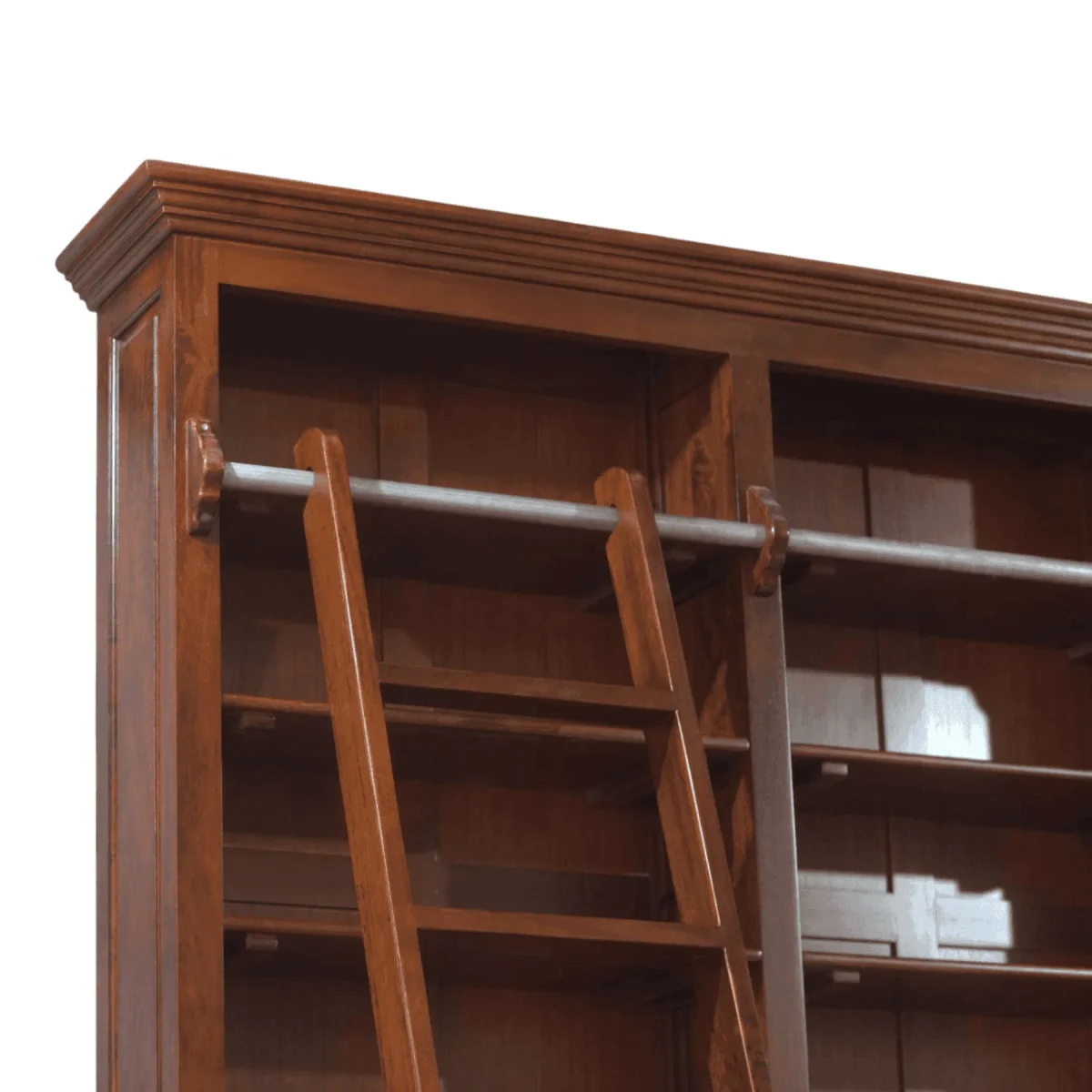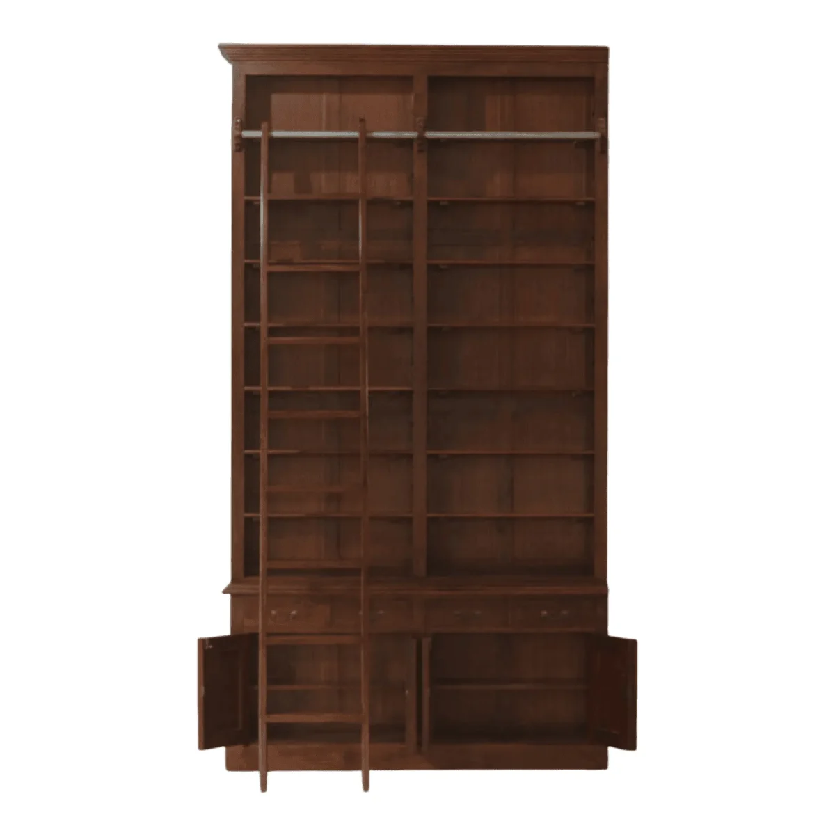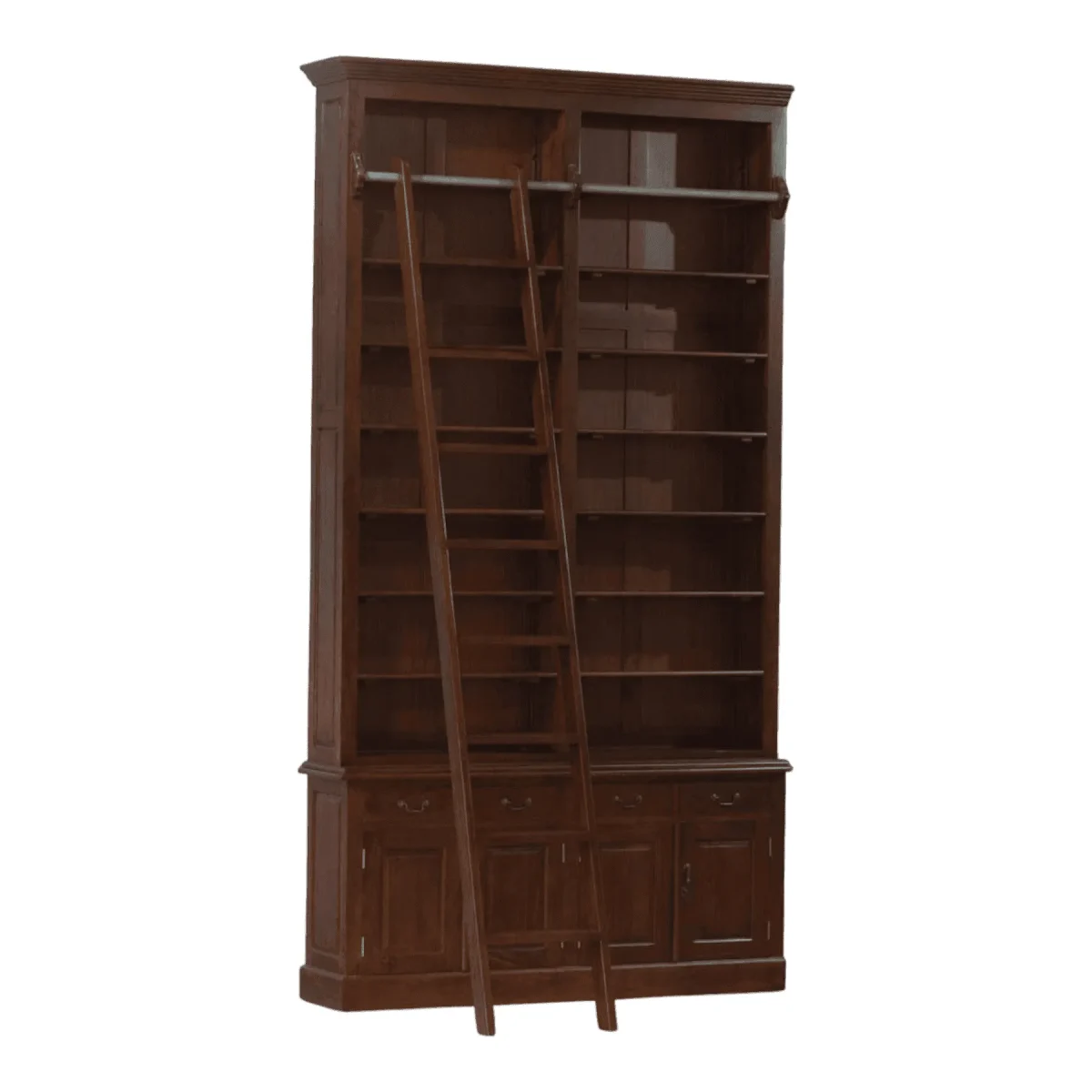 Invite the atmosphere of a grand private library into your home with this expansive double-bay bookcase complete with a coordinated rolling ladder for accessing the highest reaches of your collection The rich mahogany grain is celebrated through a multi-layered staining process that highlights the natural beauty of the timber while providing a robust framework for hundreds of volumes Arranged with fixed and adjustable shelving this piece serves as a monumental backdrop for intellectual pursuits and artistic displays alike The integrated brass-finished rail system allows the ladder to glide effortlessly providing both functional utility and a nostalgic charm reminiscent of historic universities Crafted with meticulous attention to detail from the recessed base to the stepped cornice this bookcase is more than furniture it is an architectural intervention that defines the character of a study or office while promising a lifetime of reliable service and aesthetic pleasure