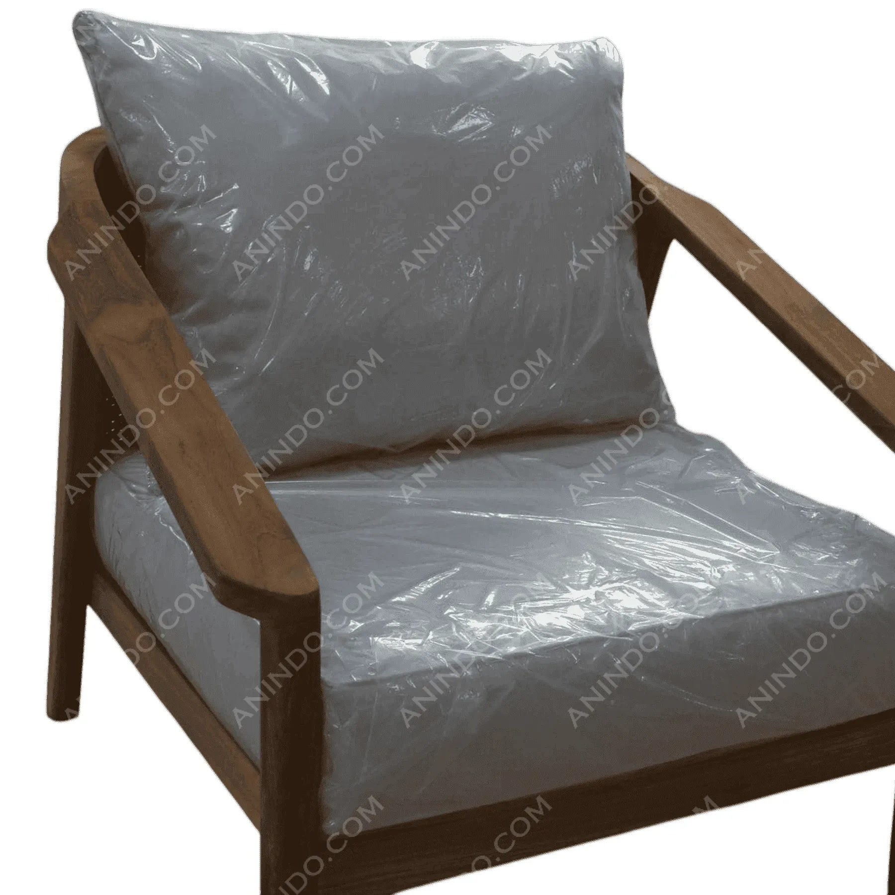 Primary Frame: Light Teak Joinery: Dowel and Glue Construction Finish: Natural Matte Oil Upholster & Cushion: Canvas/Linen (Shown in protective wrap)