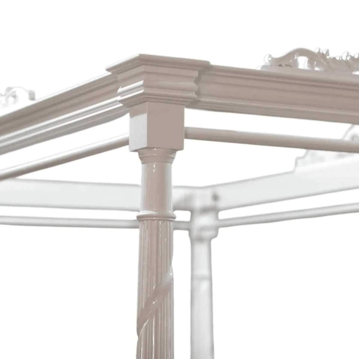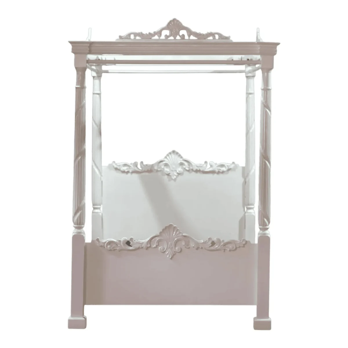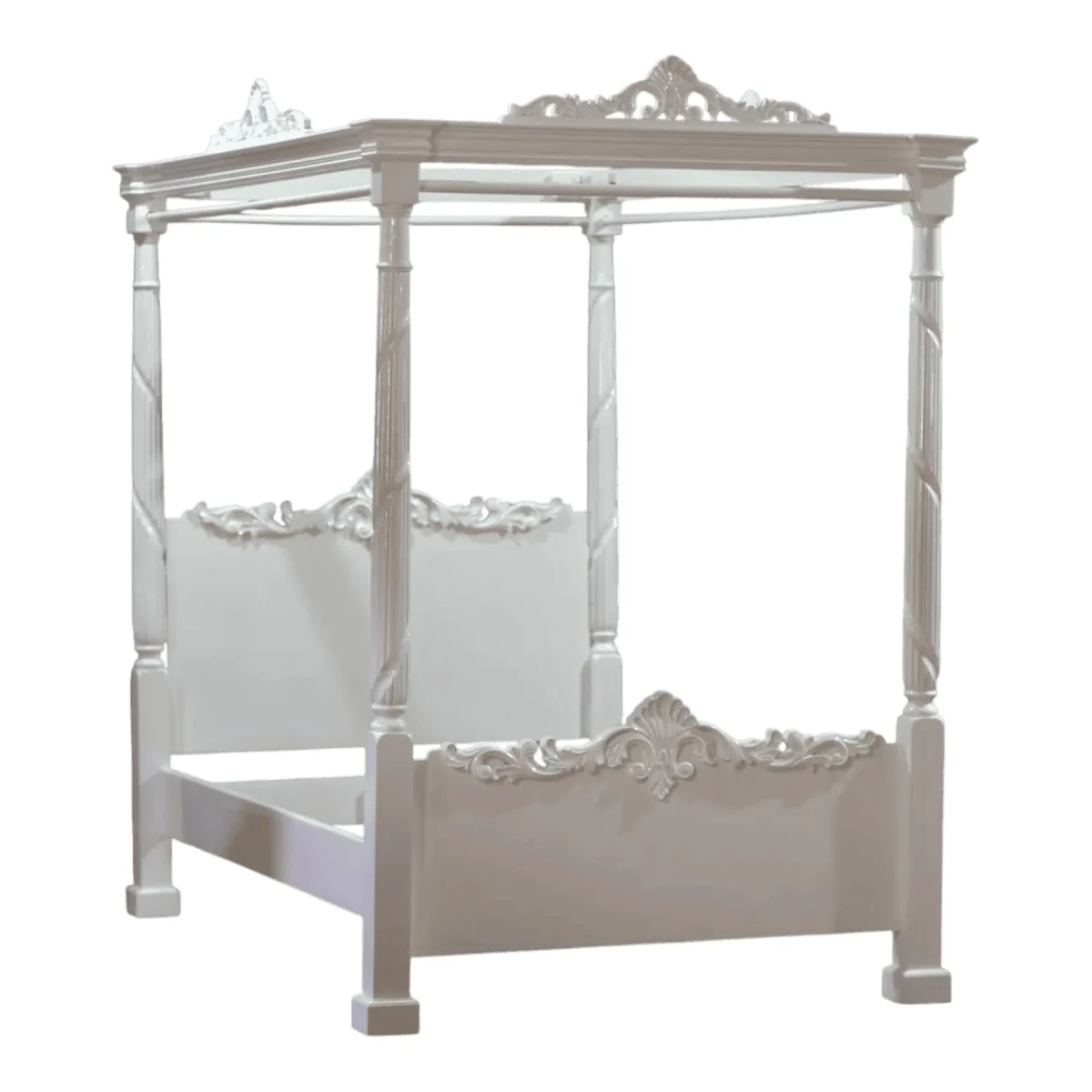 Transform your sanctuary into a dreamscape of ivory elegance where the boundaries between sleep and art blur into a singular experience This majestic four-poster frame rises with architectural grace featuring twisted columns and intricate crests that whisper of romantic European estates The crisp white finish brings a sense of airy lightness and purity to the bedroom creating a serene atmosphere that encourages deep rest and rejuvenation Its grand proportions provide a sense of security and enclosure while the open canopy allows for the movement of light and air throughout your space Perfect for the homeowner who desires a bridal-suite aesthetic every night this bed serves as a timeless stage for luxury linens and plush pillows Meticulously crafted to ensure structural integrity and aesthetic perfection it represents the pinnacle of classical design reimagined for the modern collector of fine furnishings seeking peace and grandeur