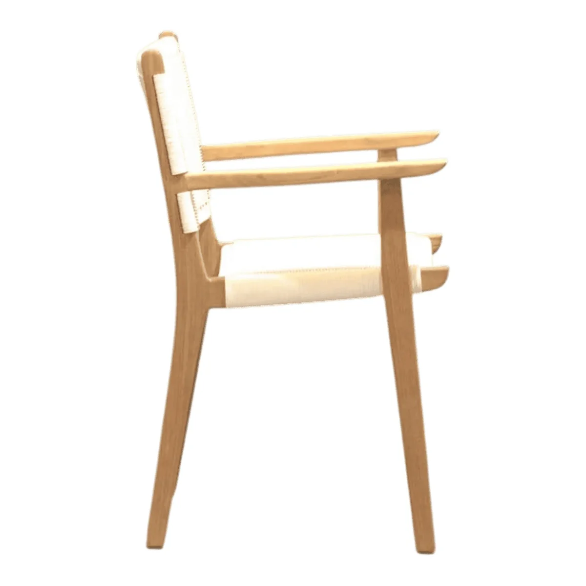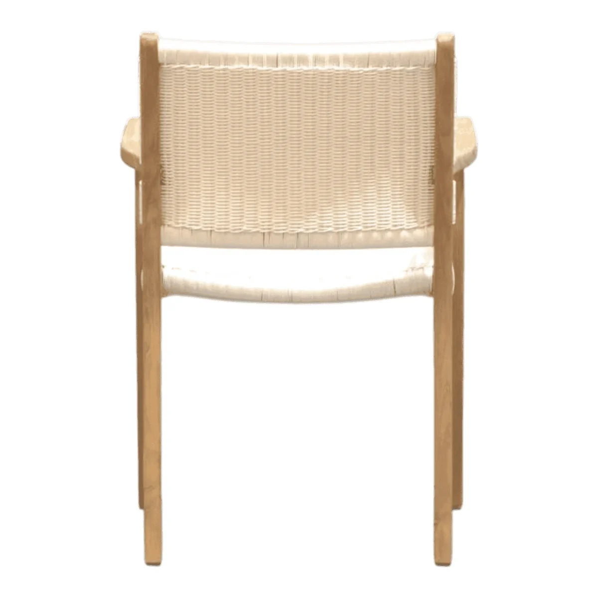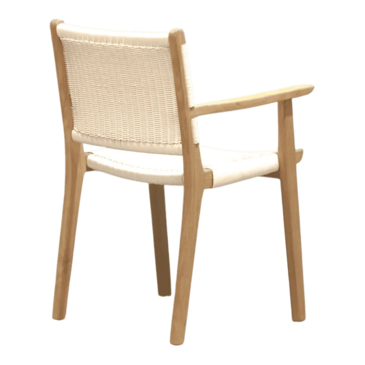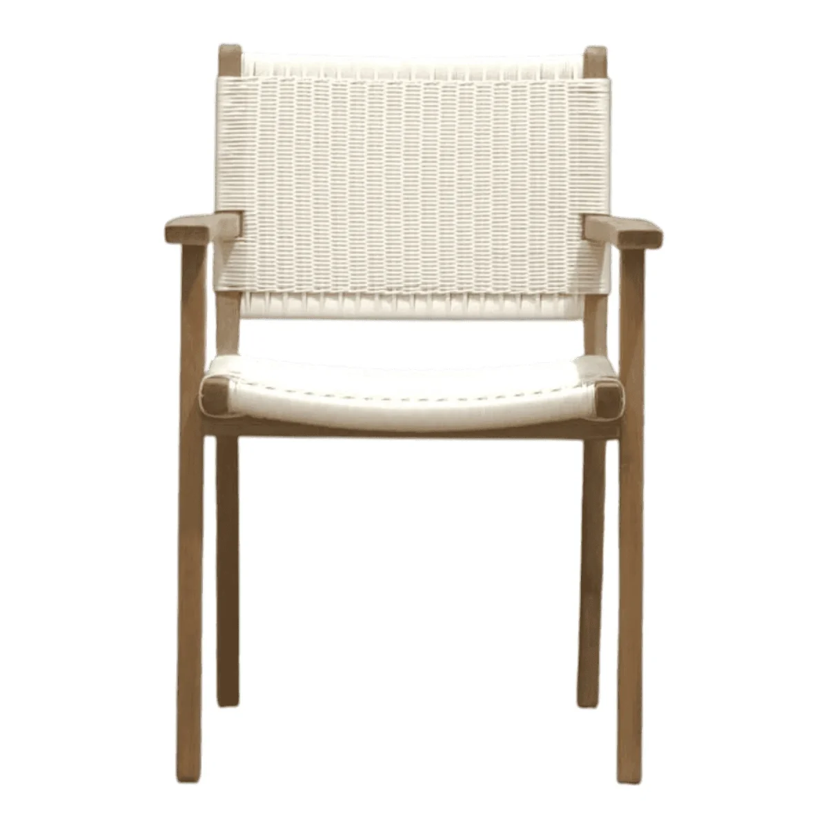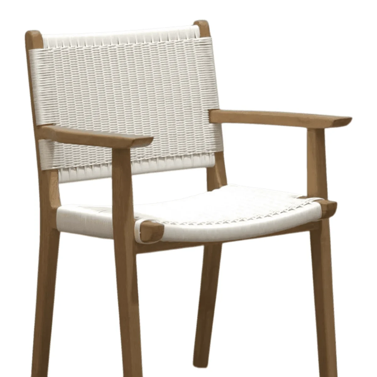Dine in style with this elegant armchair that fuses sturdy teak craftsmanship with a light-as-air aesthetic The white woven backrest and seat offer a bright clean look that reflects natural light making your dining room feel more spacious and inviting With integrated armrests for added comfort and a robust wooden frame this chair is designed to endure daily use while maintaining its chic resort-inspired appeal