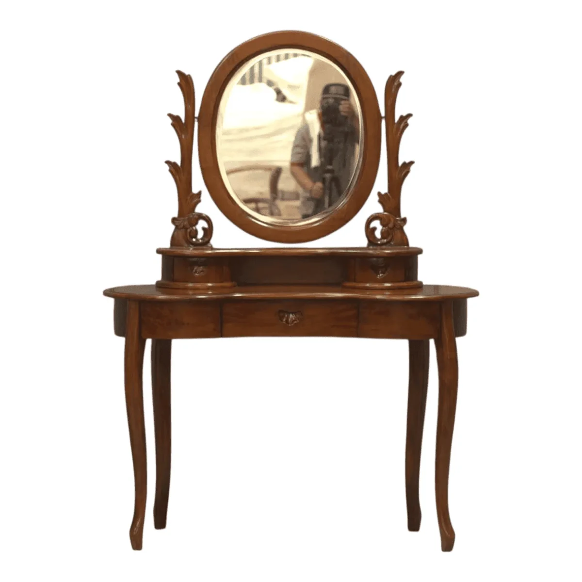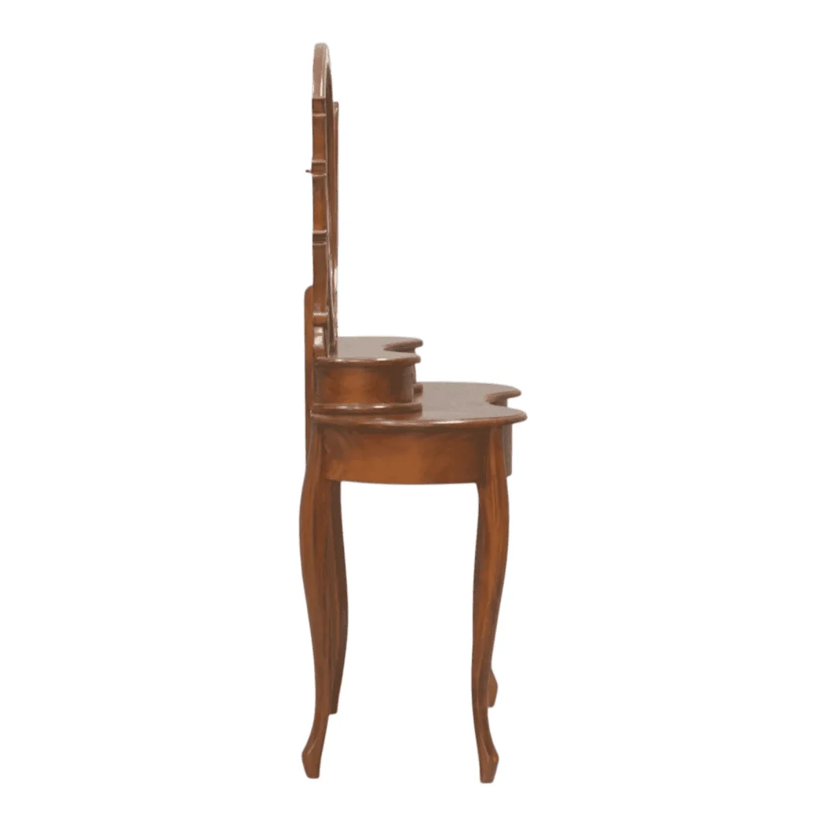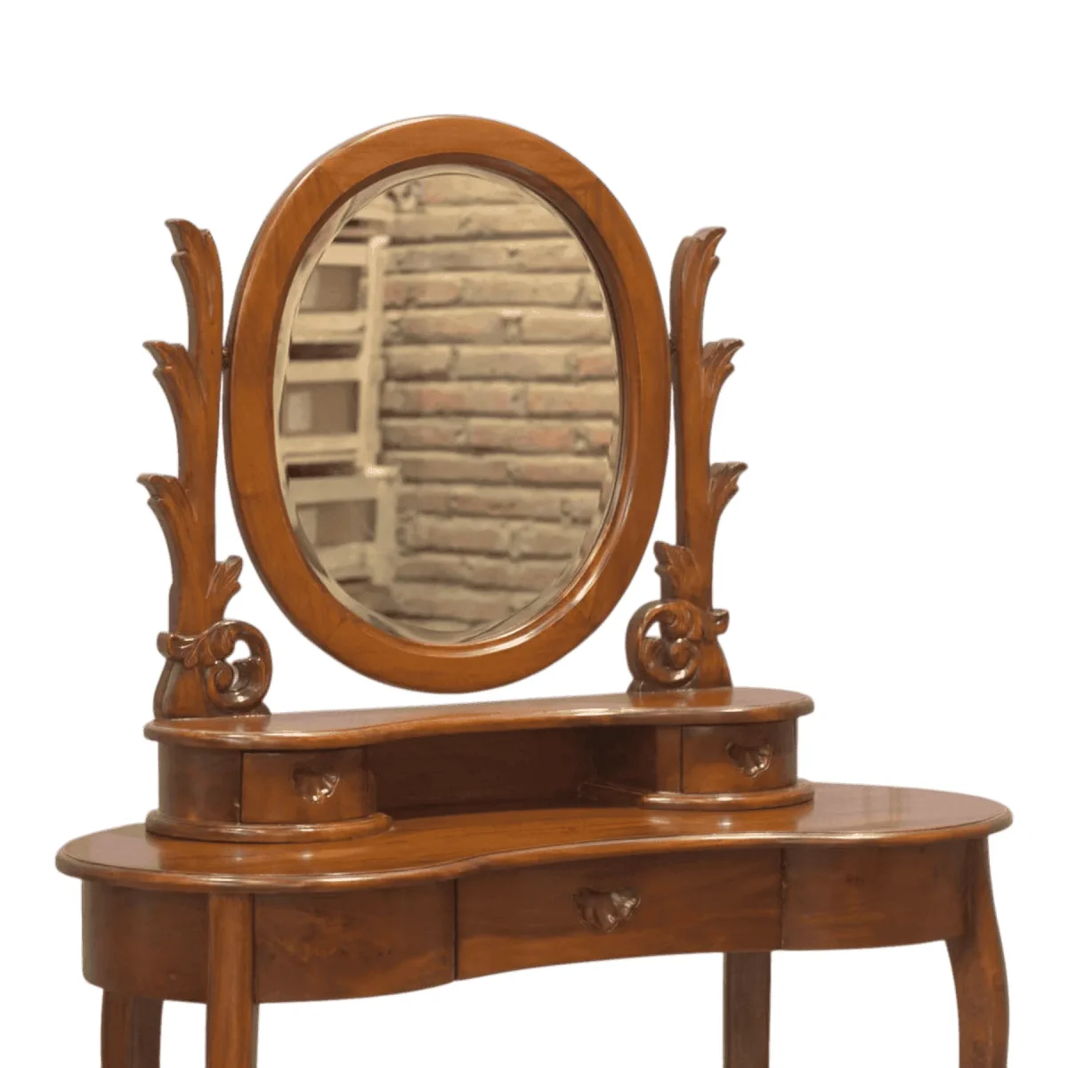 Gentle fluidity defines this dressing table featuring a sweeping oval mirror cradled by organic leaf-inspired supports that seem to grow naturally from the base The kidney-shaped tabletop offers an ergonomic approach for daily rituals while slender curved legs provide a lightweight airy aesthetic Crafted with a deep reverence for natural forms this vanity transforms a daily routine into a moment of grace perfectly suited for bedrooms seeking a soft romantic touch