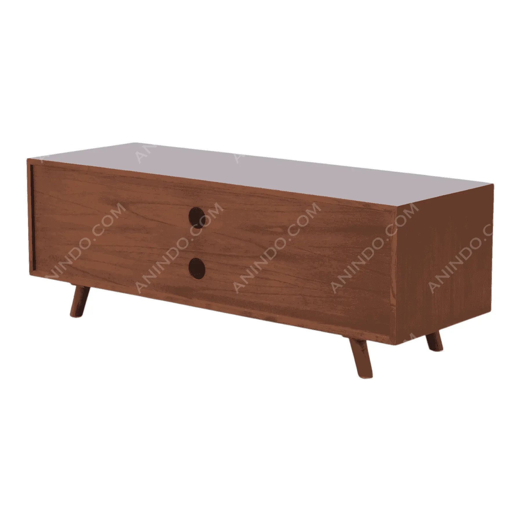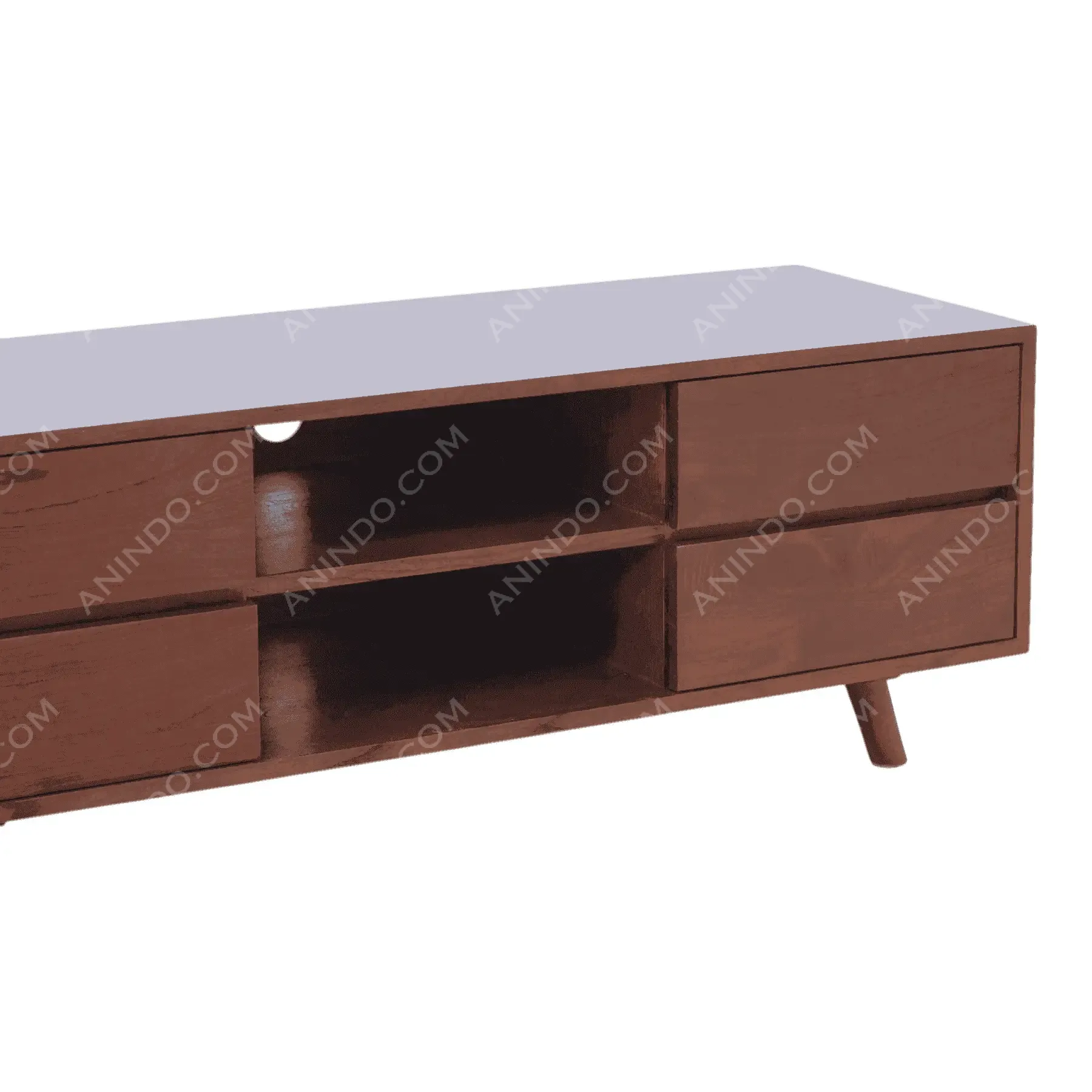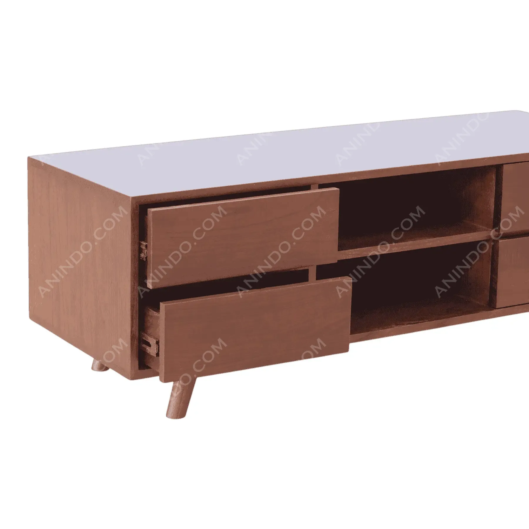 Channel classic mid-century style with this beautifully designed media console It features the era’s signature tapered, splayed legs and a clean, rectangular silhouette Crafted from wood with a rich, warm walnut finish, it offers a sophisticated, two-tone look with a crisp white top The symmetrical layout provides ample storage with two drawers on each side and a central open-shelf area, complete with cable management holes This piece is the perfect blend of retro charm and modern functionality for any living space