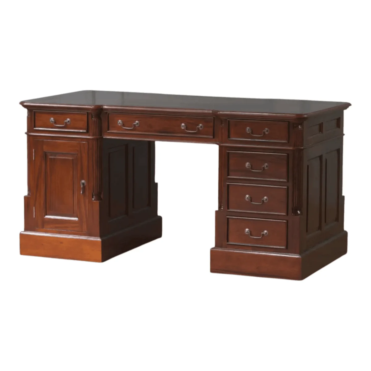 Define your professional legacy with a desk that embodies authority and timeless grace This executive pedestal desk is a masterclass in neoclassical design featuring a symmetrical silhouette and hand-fluted pilasters that frame the central seating area The left pedestal houses a discreet cabinet for CPU storage or files while the right pedestal offers a stack of four graduated drawers for organized precision Finished in a rich warm mahogany with a slight satin sheen the wood’s natural character is enhanced by vintage-inspired swan-neck brass handles The inset writing surface is polished to a glass-like finish providing a smooth tactile experience for daily tasks This heirloom-quality piece is designed for the modern leader who appreciates the weight of tradition and the necessity of a dedicated organized workspace that inspires high-level thinking and productivity