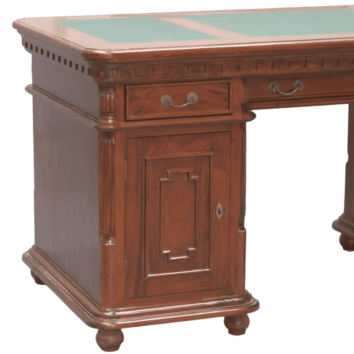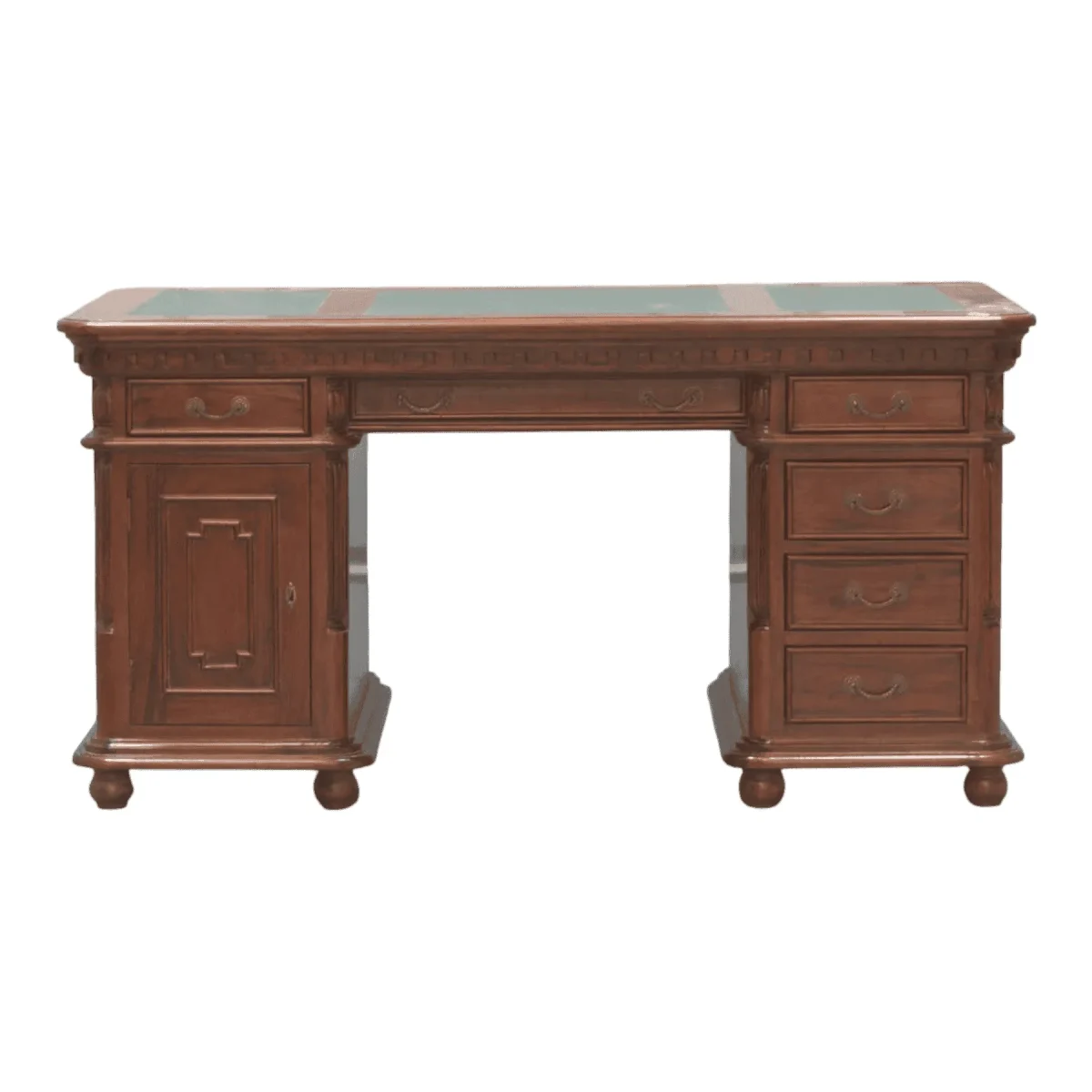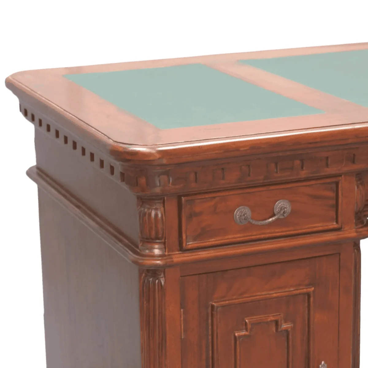 Rich in detail this desk features a distinctive carved dentil frieze running beneath the top adding texture and historical depth Standing on turned bun feet it feels lifted and less boxy than standard desks The green leather writing surface provides a classic contrast to the medium brown wood while the arrangement of drawers ensures that modern necessities are kept organized within a vintage shell