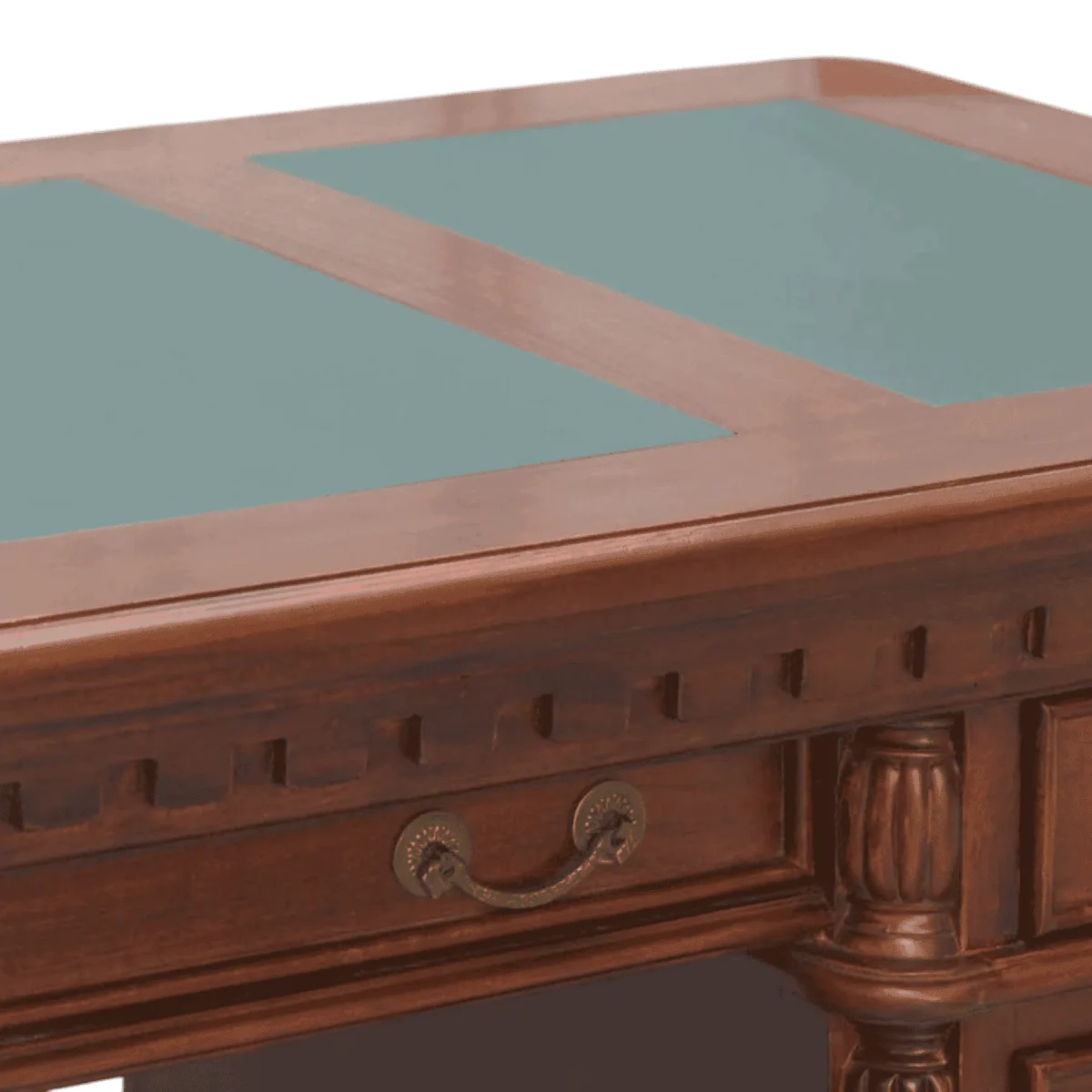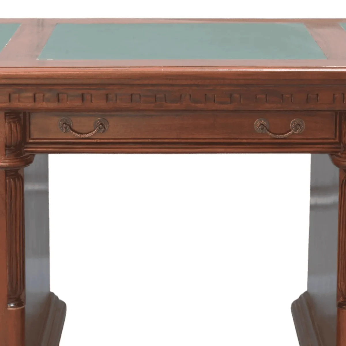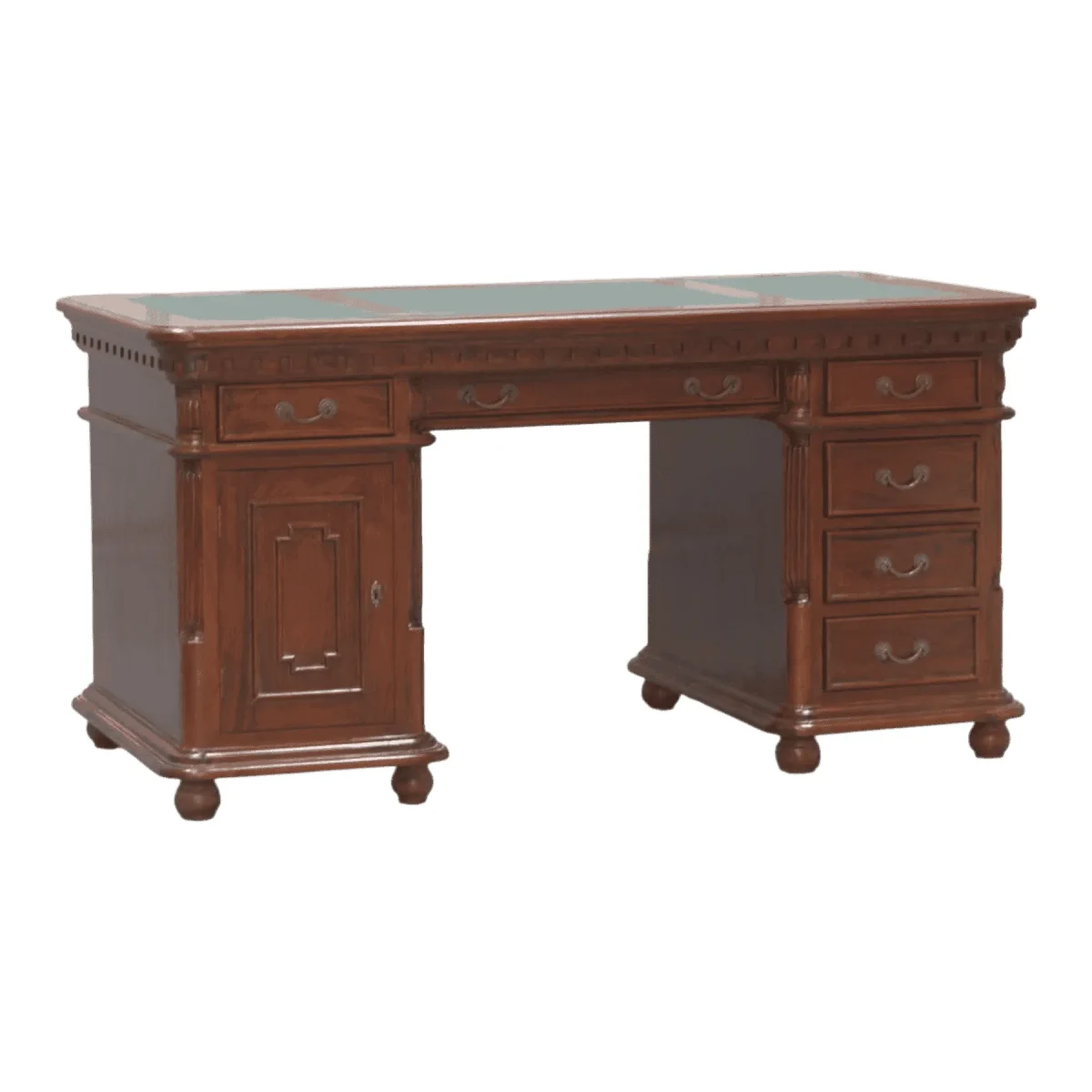 Rich in detail this desk features a distinctive carved dentil frieze running beneath the top adding texture and historical depth Standing on turned bun feet it feels lifted and less boxy than standard desks The green leather writing surface provides a classic contrast to the medium brown wood while the arrangement of drawers ensures that modern necessities are kept organized within a vintage shell