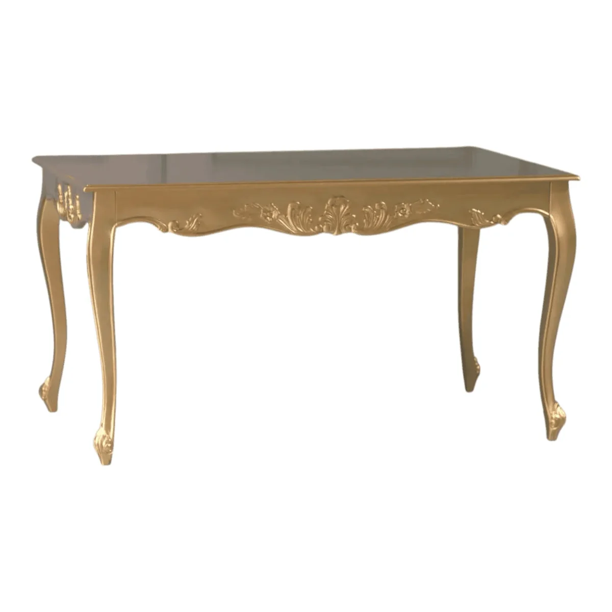 Elevate your dining or workspace with this breathtaking example of craftsmanship where the strength of solid wood meets the delicacy of ornate art The sprawling surface finished in a rich uniform gold provides a vast stage for fine dining or executive tasks supported by elegantly curved legs that feature deep-relief floral carvings Each side of the apron is a canvas of hand-sculpted details ensuring that beauty is visible from every angle in the room This table is designed for the host who appreciates the power of a centerpiece to define the mood of an entire home—turning everyday meals into banquets and simple meetings into monumental occasions of state-like importance