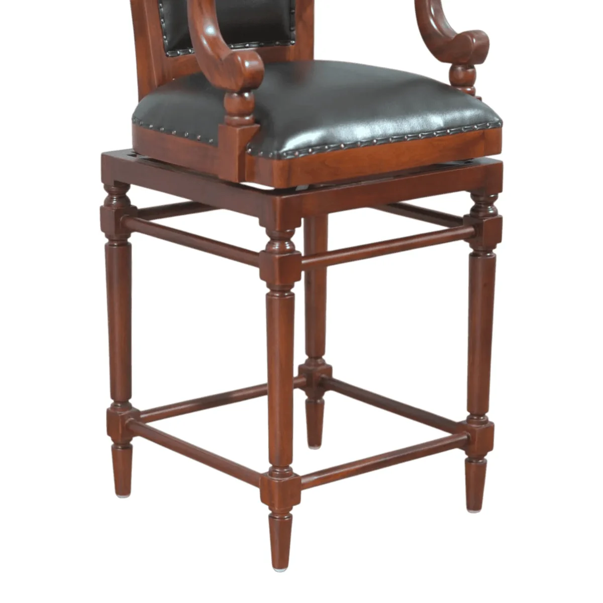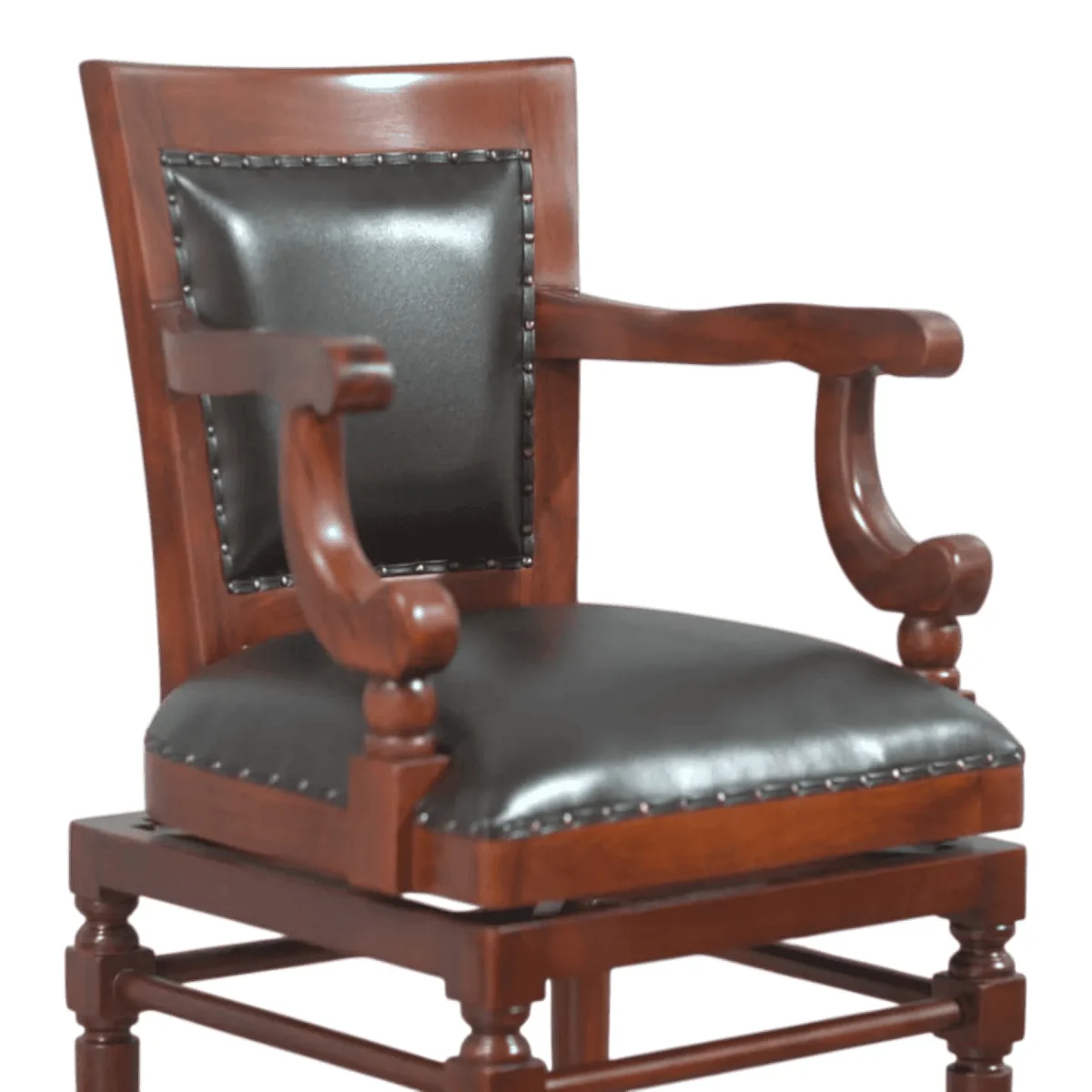 Elevate your home bar or kitchen island with this commanding high-back barstool that blends the comfort of a lounge chair with the height of a luxury stool Crafted from select mahogany this piece features a deep walnut stain and a padded backrest upholstered in premium black top-grain leather The seat and back are finished with meticulous brass nailhead trim that adds a touch of vintage sophistication while the turned wooden arms and splayed legs provide both structural stability and a classic silhouette A built-in footrest ensures ergonomic comfort during long evenings of entertainment or casual dining This stool is designed for the homeowner who refuses to compromise on style or durability offering a heavy-duty frame that supports an elevated lifestyle Bring the atmosphere of an exclusive private club into your personal residence with this masterfully constructed seating option