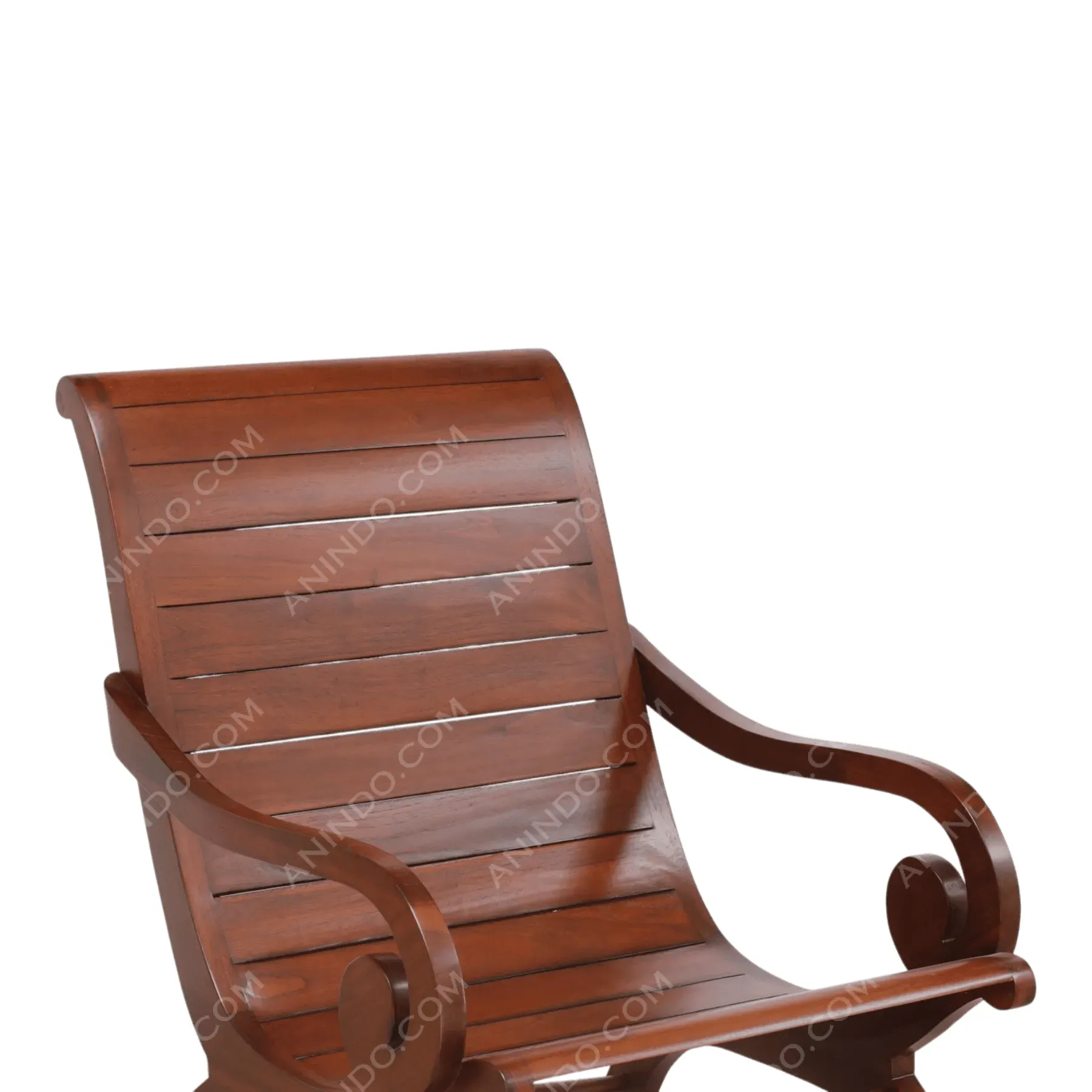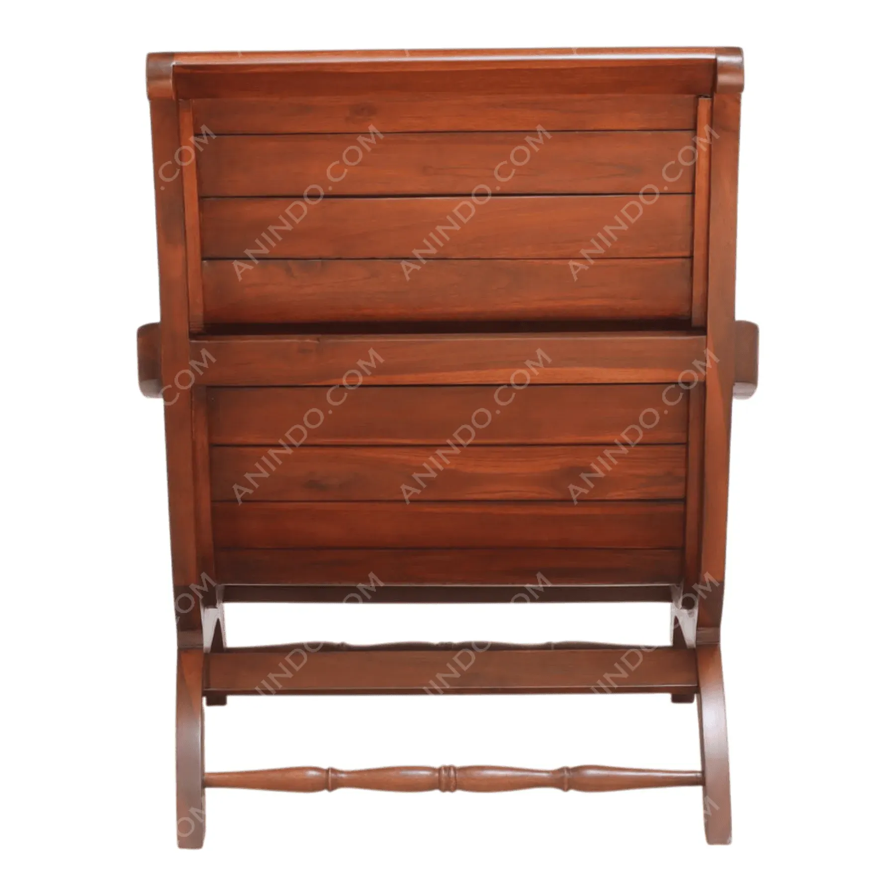 A highly ergonomic and traditional slatted chair designed for deep, adjustable comfort. The entire chair, including the backrest and seat, is constructed from broad, horizontal Teak planks, allowing for excellent air circulation. The curved armrests provide a comfortable grip, and the visible cross-bar at the front suggests a folding or adjustable reclining function. Finished in a warm, dark, polished Teak, this piece is ideal for a sheltered veranda, sunroom, or a rustic yet refined indoor lounging space, offering both a strong aesthetic and flexible comfort.