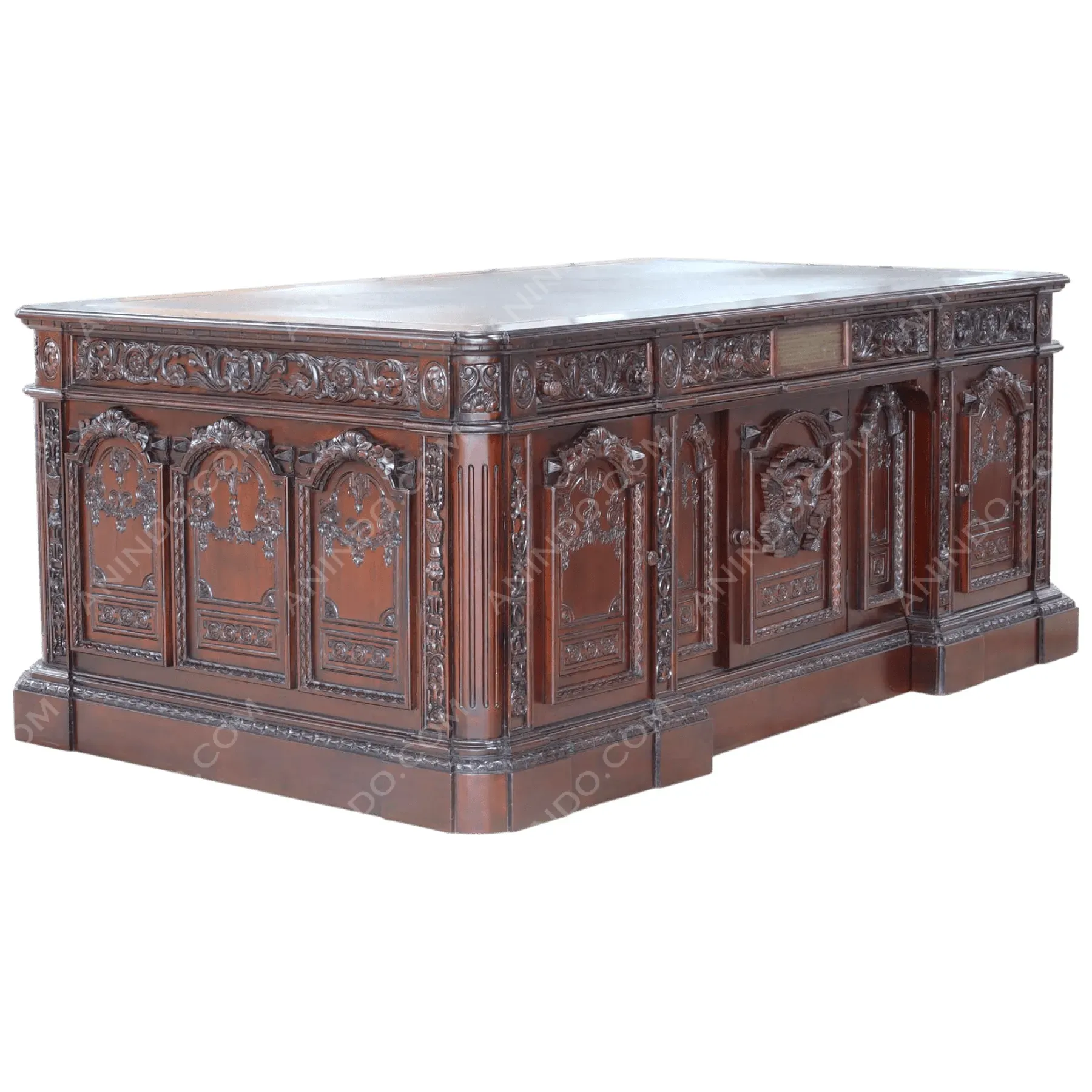 Command your workspace with the timeless authority of this executive desk A masterpiece of traditional craftsmanship it features deeply intricate carvings across its facade including floral motifs, scrolls, and architectural details Crafted from rich, dark-stained Mahogany wood this piece is built on a commanding twin-pedestal base offering substantial presence and ample storage within its drawers The spacious top provides a generous work surface making it as functional as it is beautiful This is not merely a desk it is an heirloom statement of prestige and classic European elegance