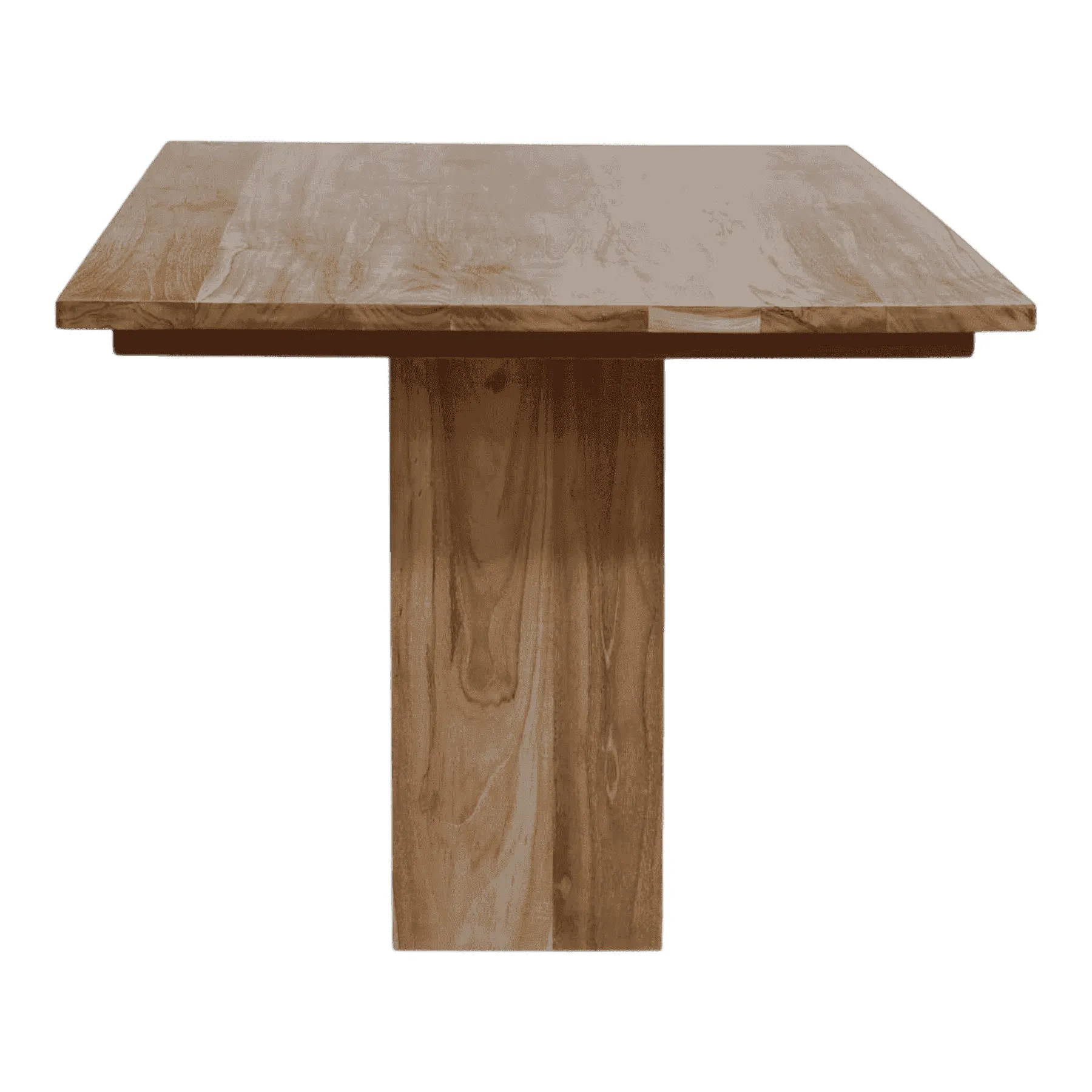 Gather around this powerful and minimalist dining table Its design is a statement of pure, rustic form, featuring a thick, solid teak top resting on two massive pedestal block legs The warm, medium-brown finish highlights the natural wood grain, creating a piece that is both modern and elemental This table is a substantial, timeless anchor for any dining room