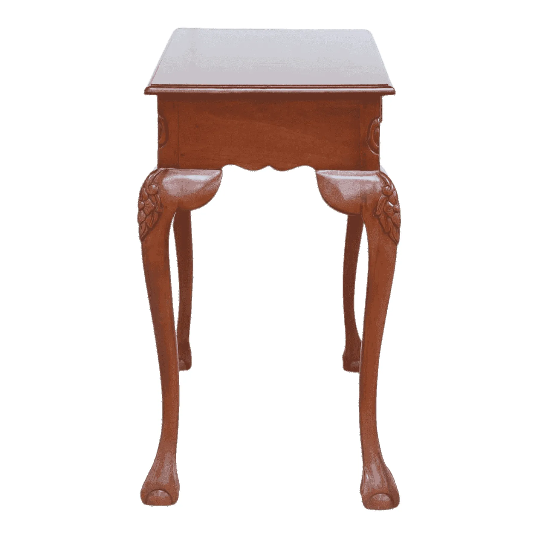 Elegance and function unite in this beautiful Queen Anne-style writing desk Its delicate, curved cabriole legs are gracefully carved at the knees and end in classic pad feet The serpentine apron features a single, discreet drawer, perfect for storing stationery or keys Finished in a rich, dark wood, this piece is ideal as a sophisticated vanity, a statement console table in an entryway, or a light-duty desk in a study