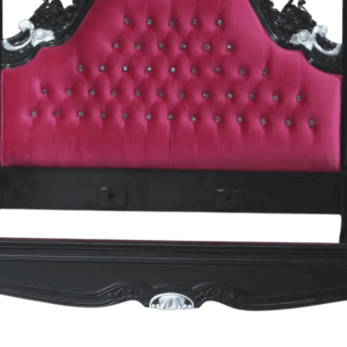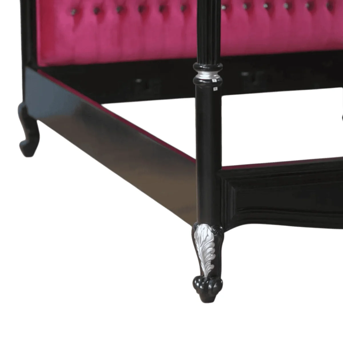 Frame: Solid Midnight Black | Accents: Polished Silver Leaf on carvings | Upholstery: Deep Magenta / Fuchsia Velvet