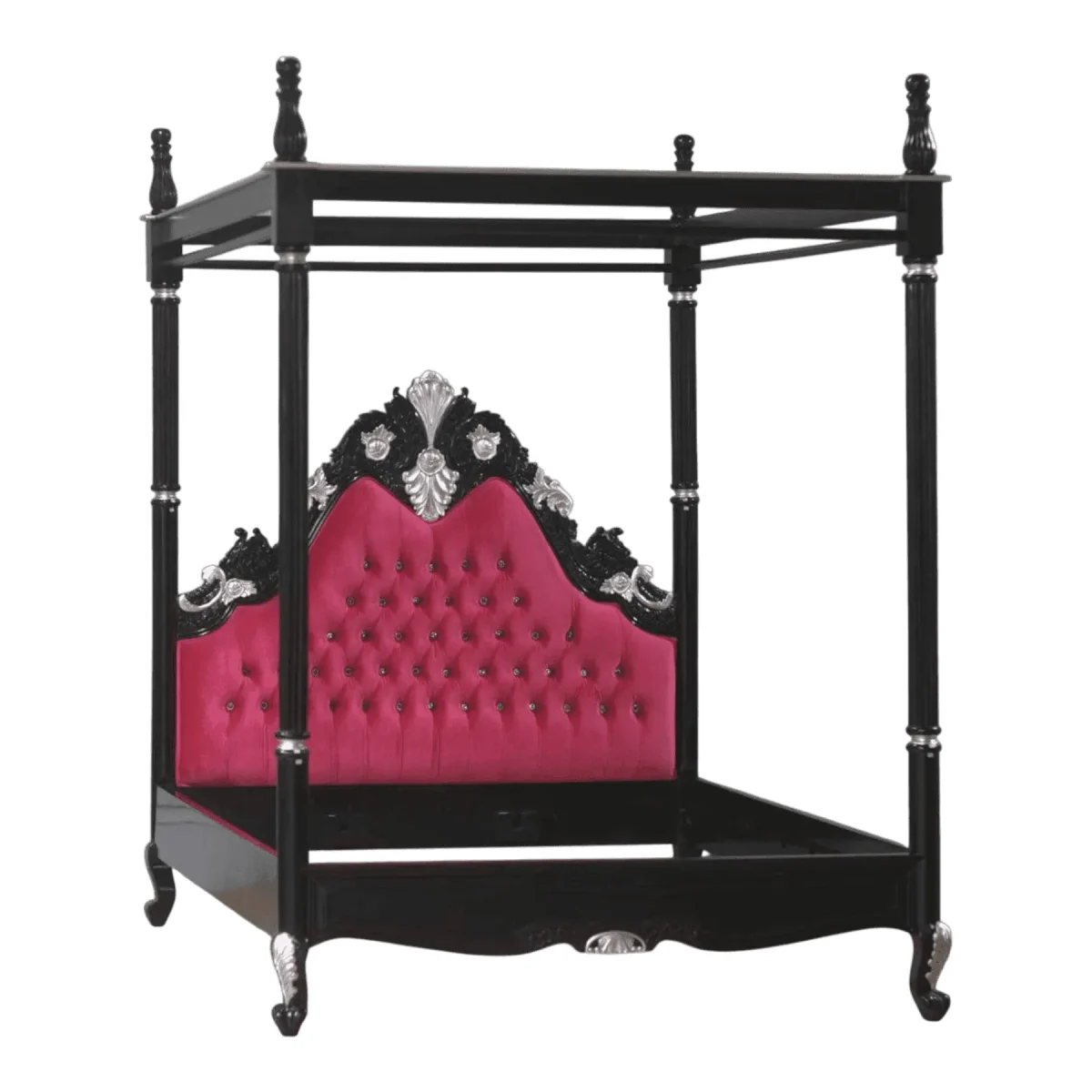 Step into a world of romantic gothic elegance with this stunning four-poster canopy bed Combining the architectural strength of a solid black frame with the vibrant passion of magenta velvet this bed creates a theatrical sanctuary in your bedroom The towering posts lead to a minimalist top frame designed for draped silks or to stand alone as a bold geometric statement The headboard is a work of art featuring deep diamond tufting and hand-carved silver accents that contrast beautifully against the dark ebony finish Built for those who demand both drama and durability this bed serves as an heirloom-quality centerpiece that defines the entire atmosphere of a luxury suite