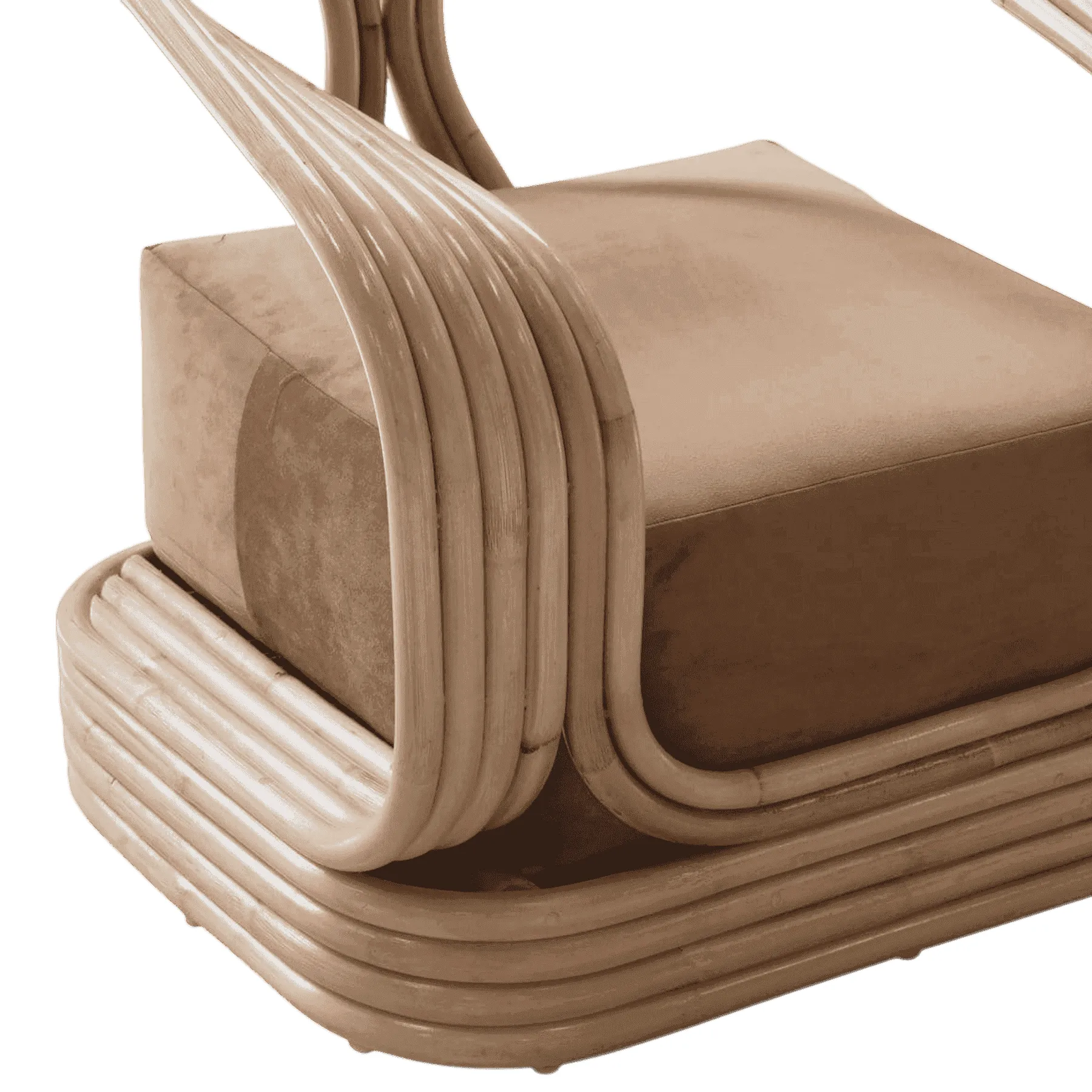 Primary Frame: Bundled Rattan | Joinery: Rattan Wraps | Finish: Natural Glossy Rattan | Upholster & Cushion: Light Beige Fabric